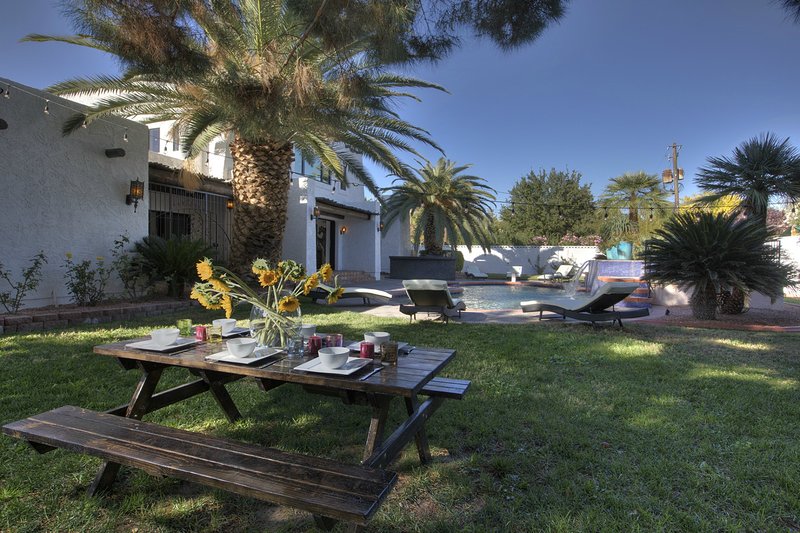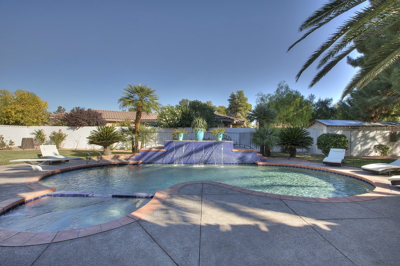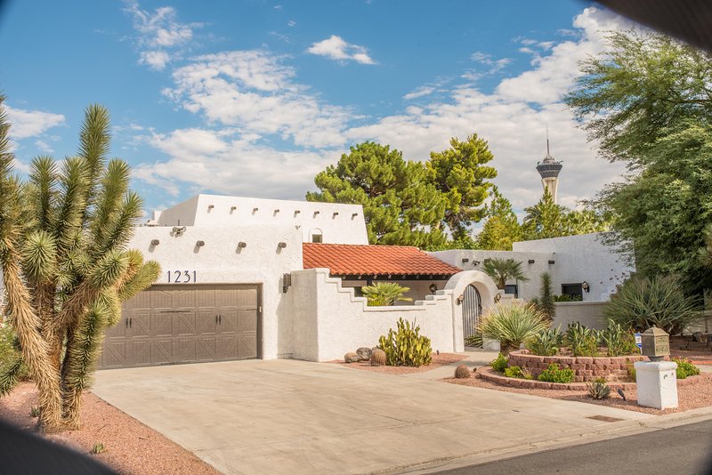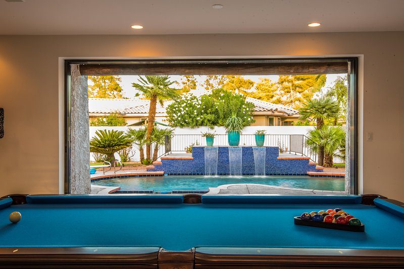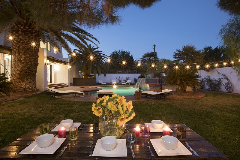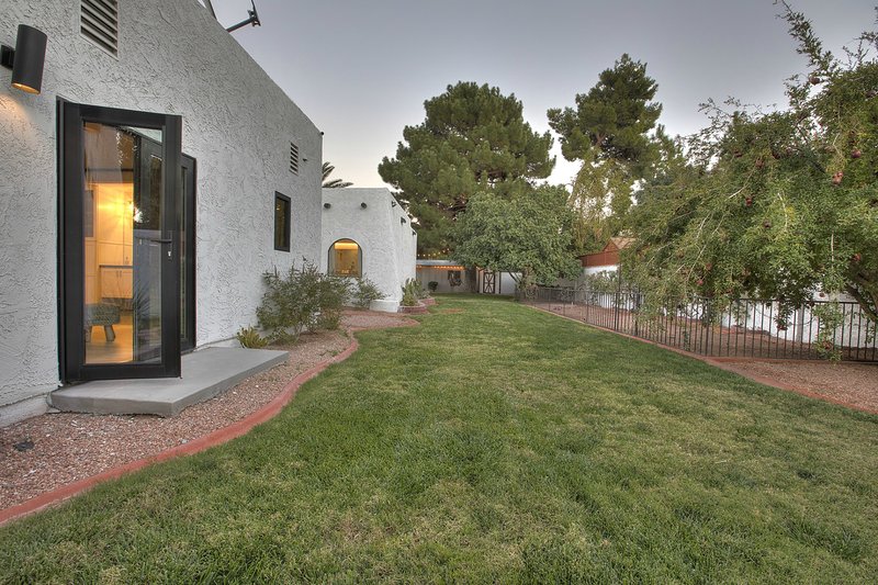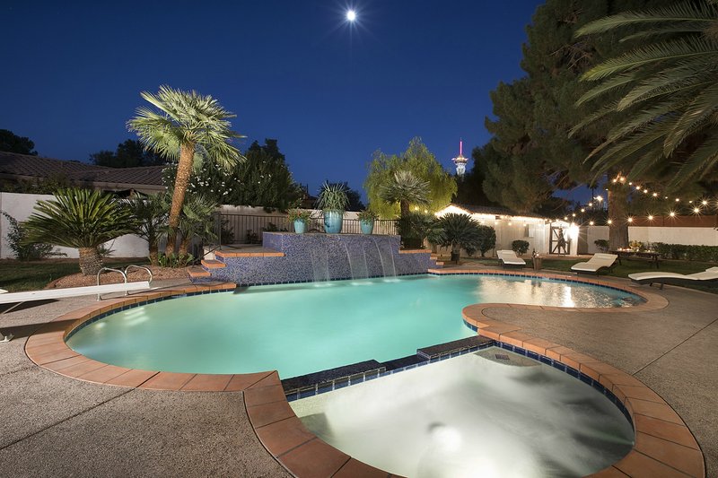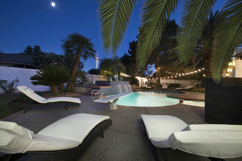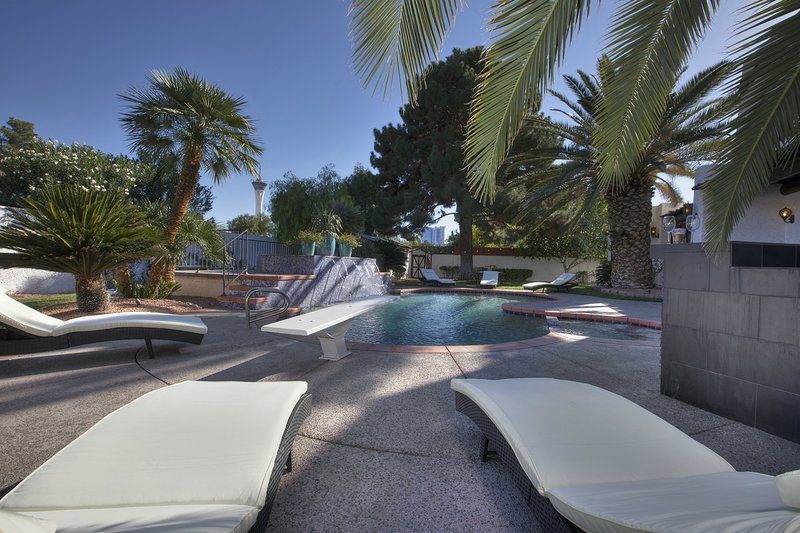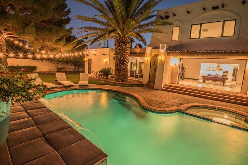 Come and experience this 6,008 square foot completely remodeled modern escape one mile or so from Las Vegas Boulevard. Perfect for romantic getaway, families or small groups of friends. This 4 bedroom, 4 1/2 bathroom treasure sits on a 1/2 acre lot surrounded by beautiful lush, large, mature plants and fruit bearing trees, grass and wine vineyard area. The swimming pool has beautiful fountains and spa. Pebble tech bottomed pool. Pool and spa can both be heated at additional fee. The huge floor to ceiling glass doors retract into the wall making the inside of the home seamless with the backyard oasis. The home is very secluded, quiet and private, yet so close to all of the fun and entertainment of the Downtown Fremont Street Experience and the World Famous Las Vegas Strip!