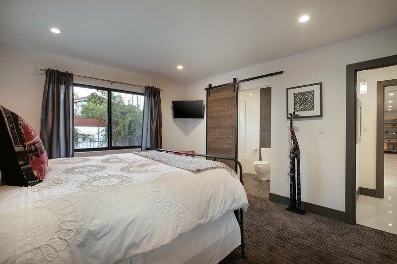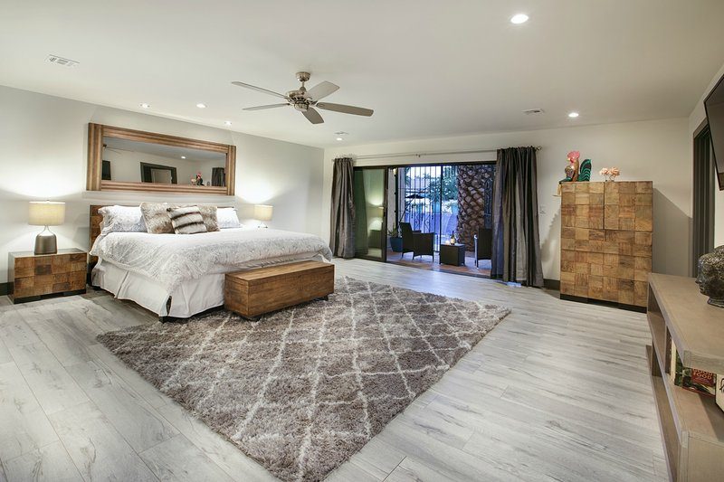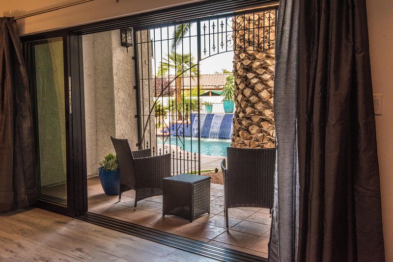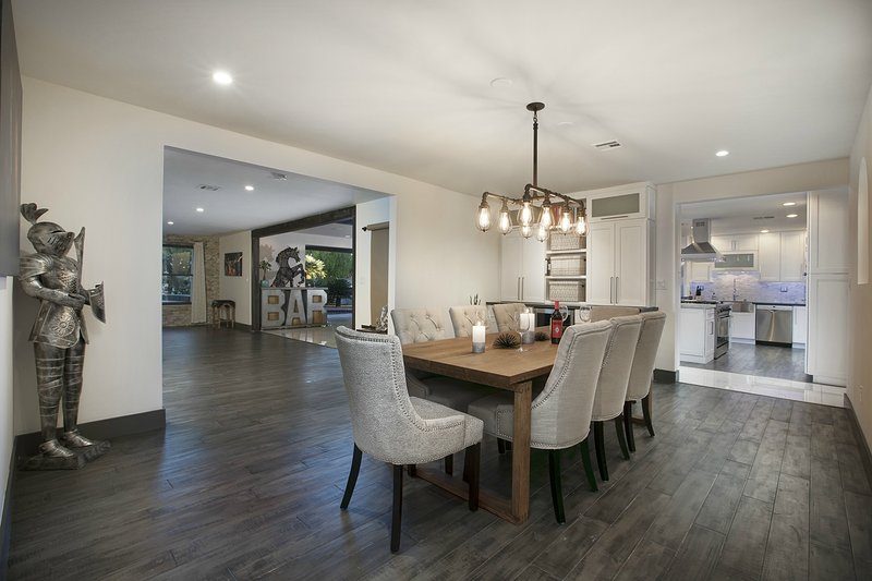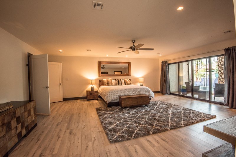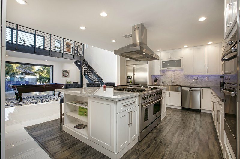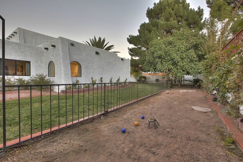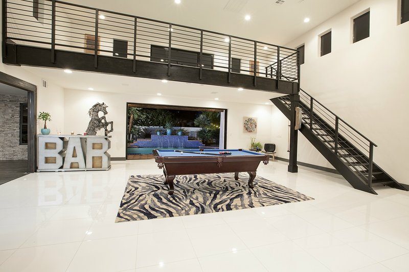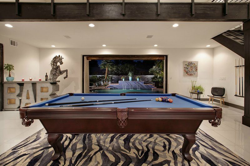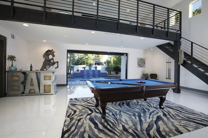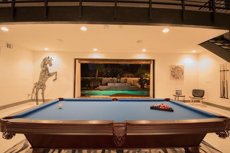 Come and experience this 6,008 square foot completely remodeled modern escape one mile or so from Las Vegas Boulevard. Perfect for romantic getaway, families or small groups of friends. This 4 bedroom, 4 1/2 bathroom treasure sits on a 1/2 acre lot surrounded by beautiful lush, large, mature plants and fruit bearing trees, grass and wine vineyard area. The swimming pool has beautiful fountains and spa. Pebble tech bottomed pool. Pool and spa can both be heated at additional fee. The huge floor to ceiling glass doors retract into the wall making the inside of the home seamless with the backyard oasis. The home is very secluded, quiet and private, yet so close to all of the fun and entertainment of the Downtown Fremont Street Experience and the World Famous Las Vegas Strip!
