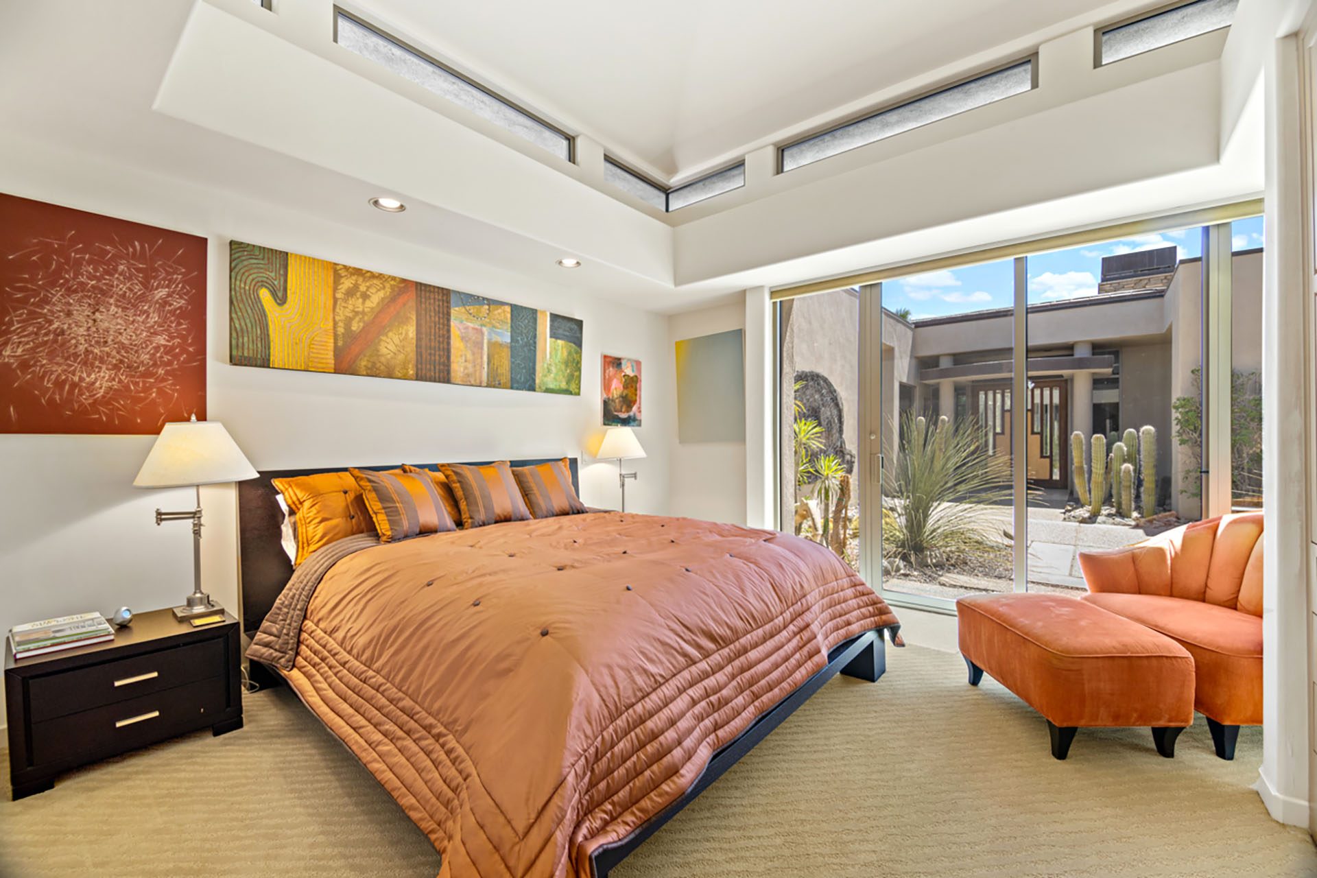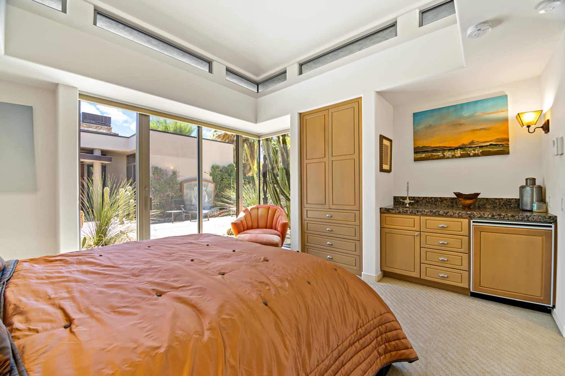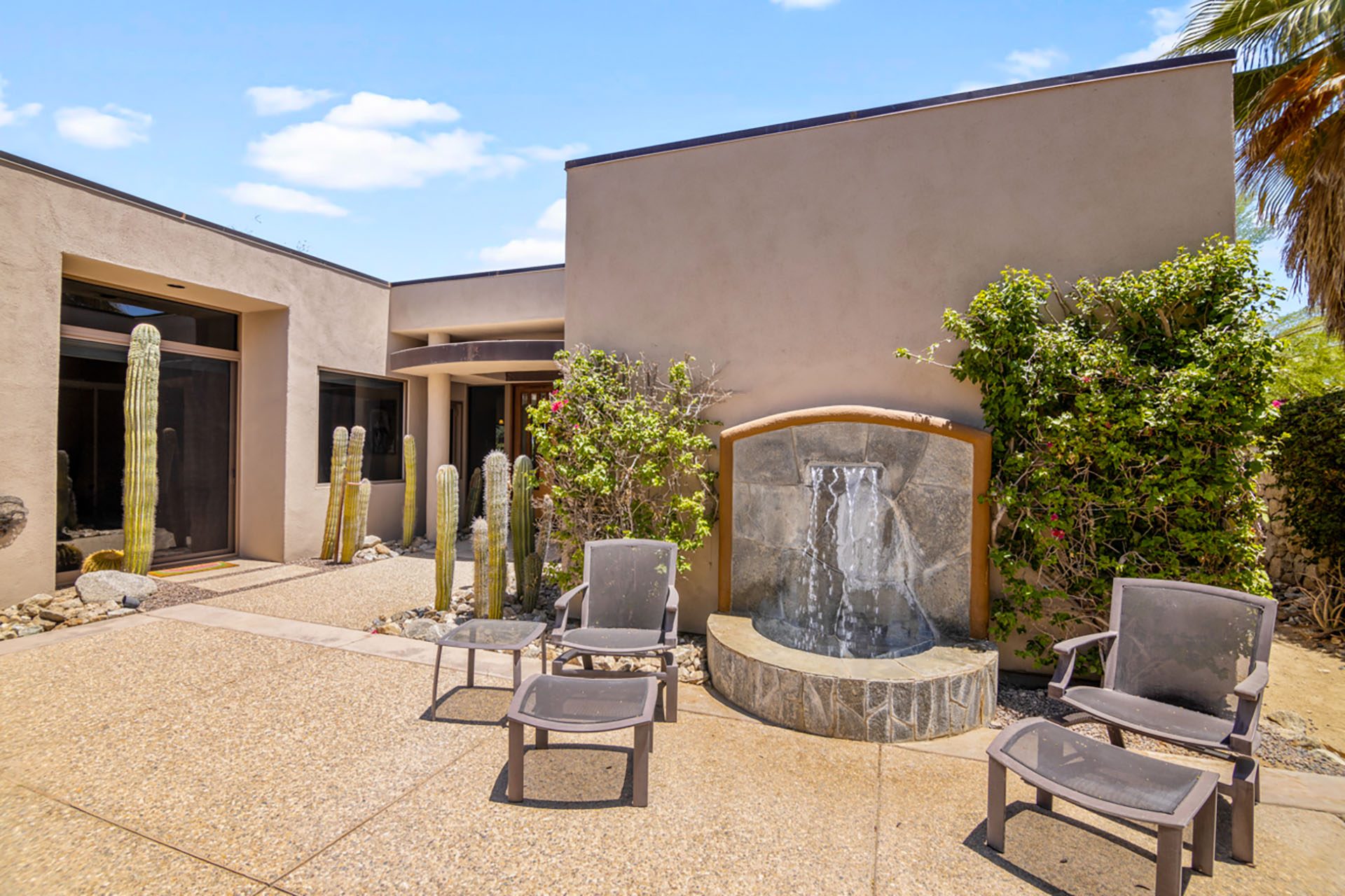Suite 2 is in the detached casita in the courtyard and has a King bed, floor to ceiling windows, flatscreen TV and en suite bath with shower. Suite 3 is in the main house and has a King bed, floor to ceiling slider to the courtyard, flatscreen TV and en suite bath with shower. The media room has seating, a TV and an en suite bath with shower. All three rooms open up to the courtyard - a serene and peaceful place to relax with a bubbling water feature.