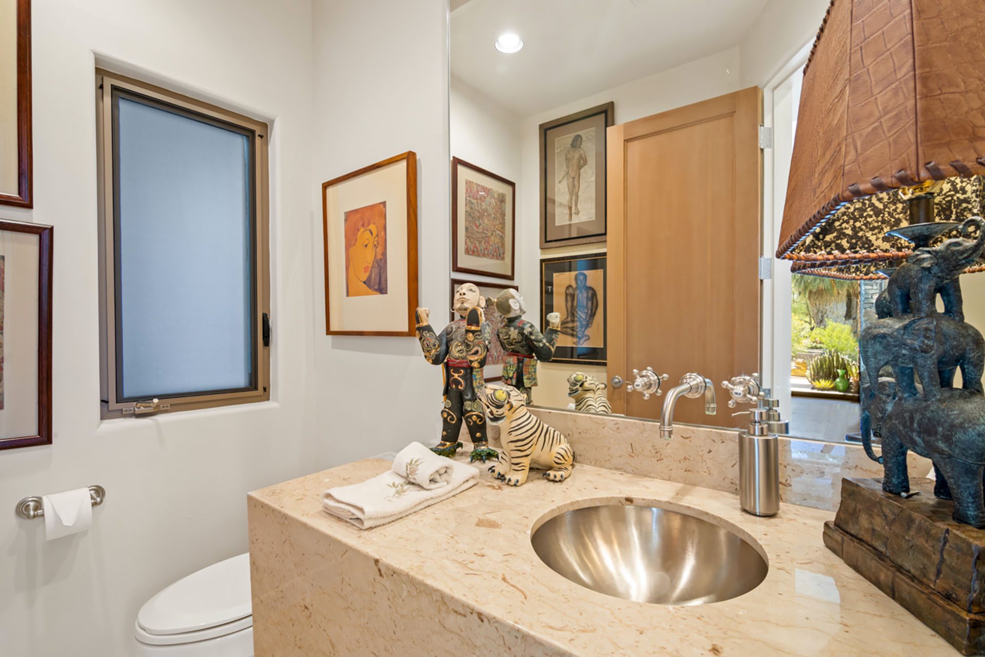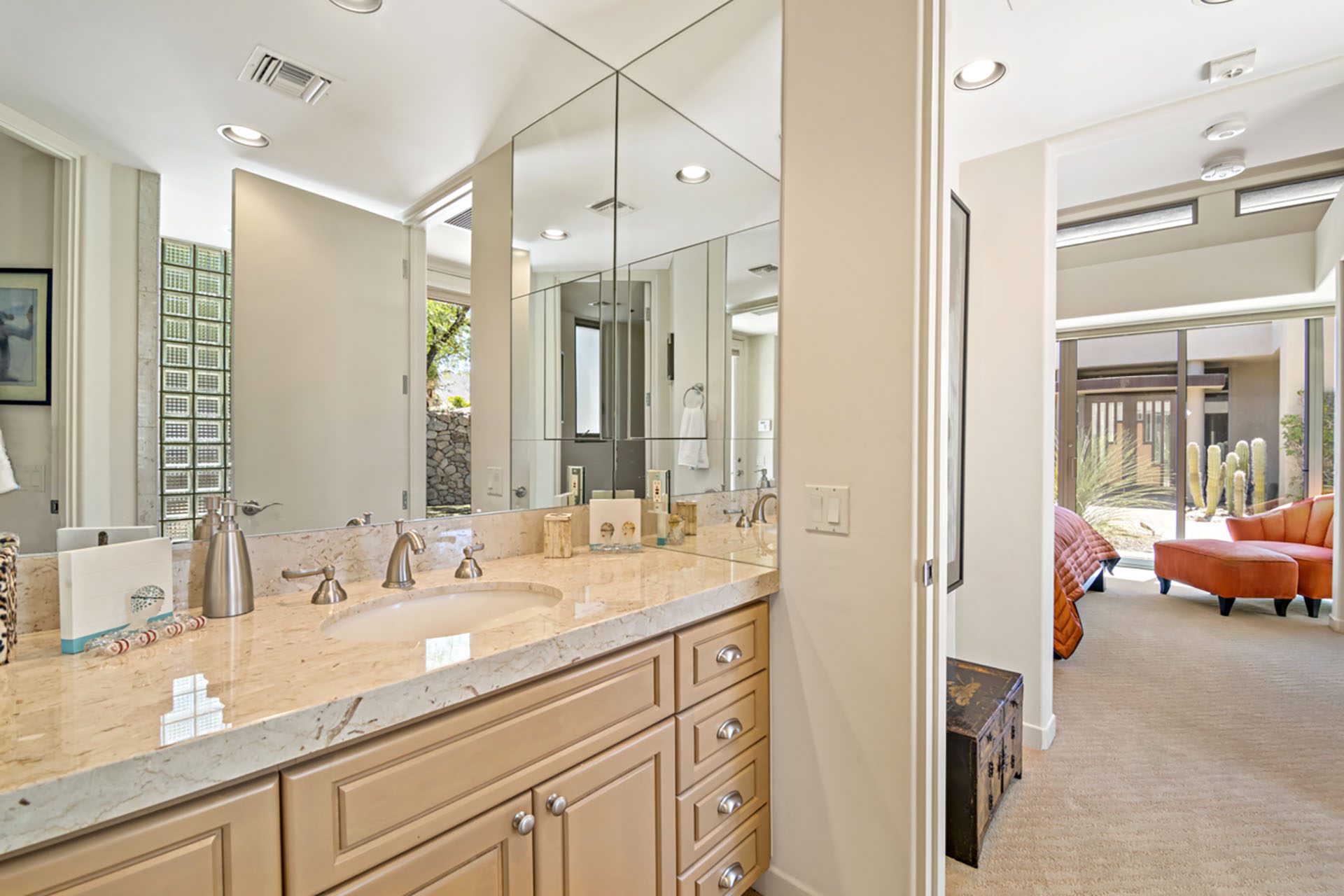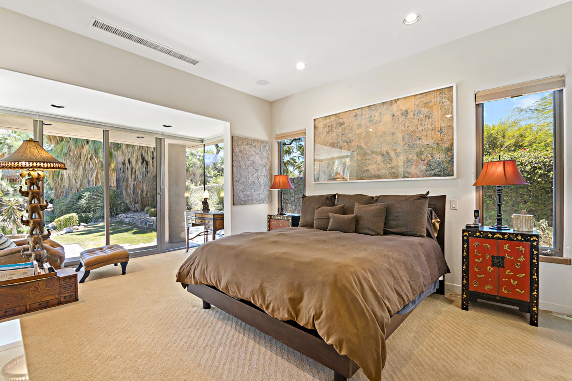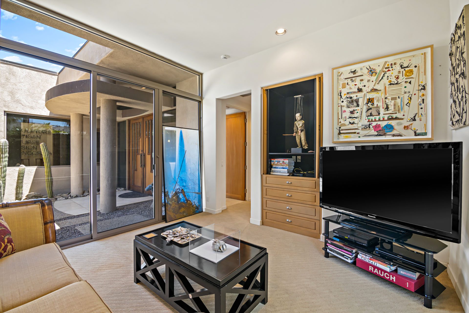 Suite 2 is in the detached casita in the courtyard and has a King bed, floor to ceiling windows, flatscreen TV and en suite bath with shower. Suite 3 is in the main house and has a King bed, floor to ceiling slider to the courtyard, flatscreen TV and en suite bath with shower. The media room has seating, a TV and an en suite bath with shower. All three rooms open up to the courtyard - a serene and peaceful place to relax with a bubbling water feature.