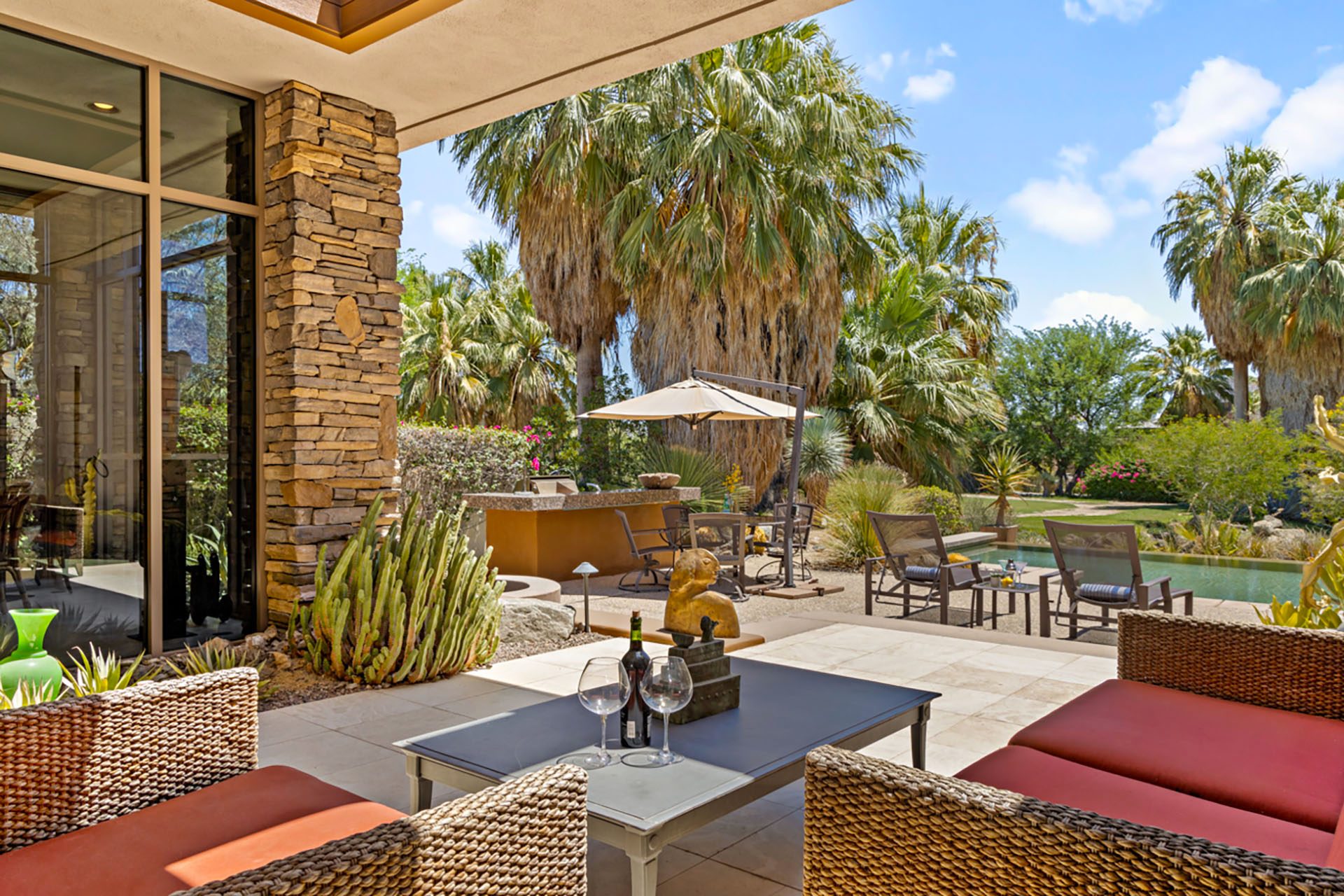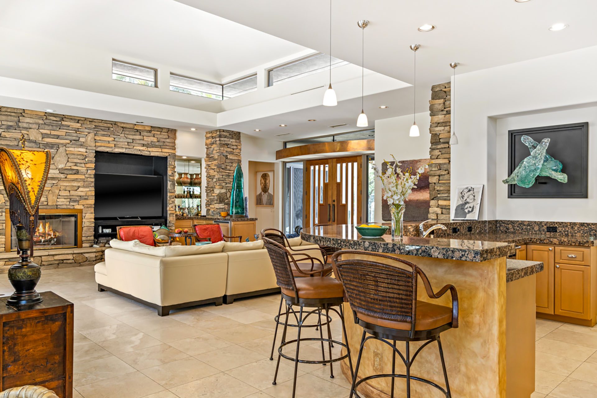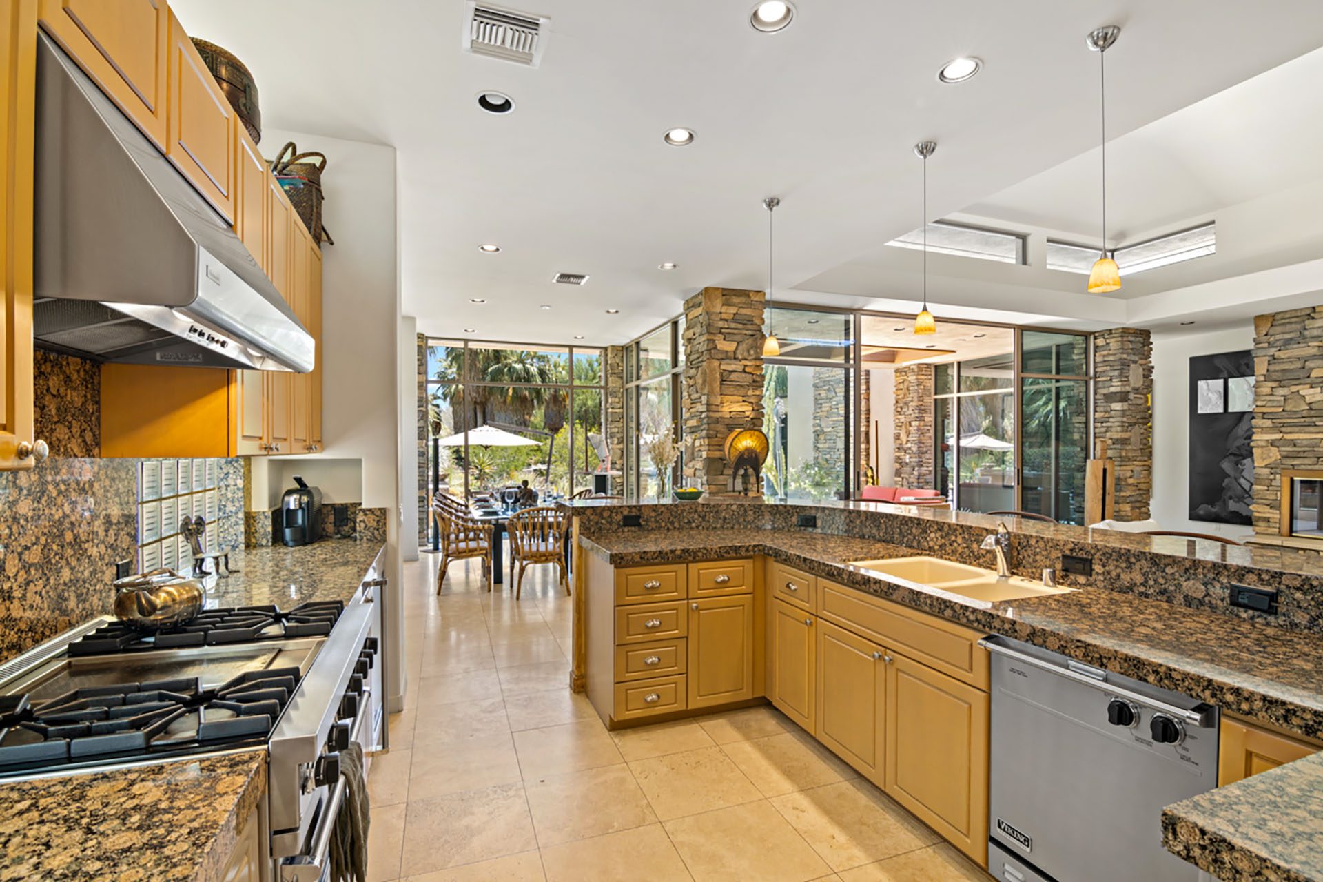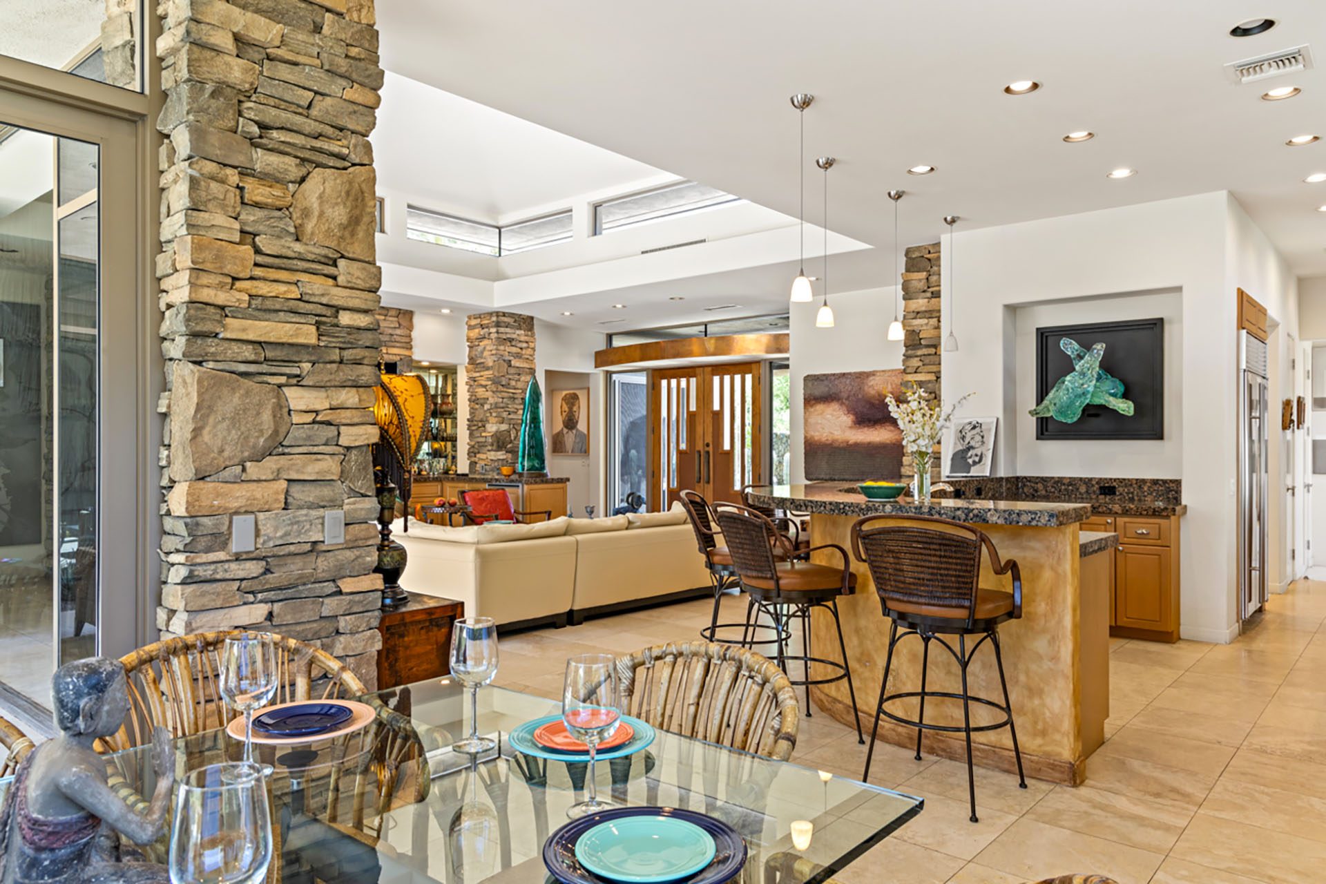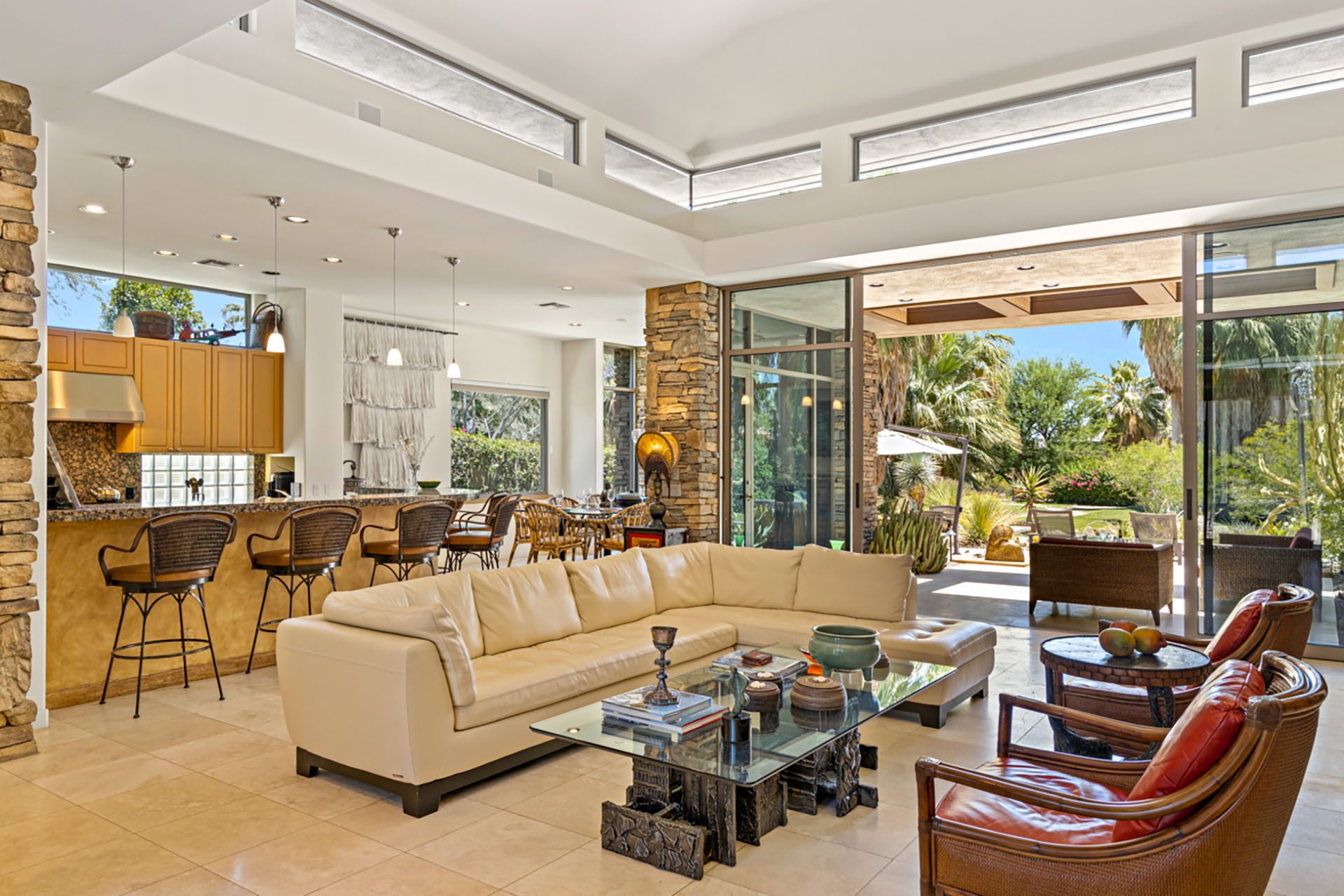 Open concept floorplan, vaulted ceilings with clerestory windows and walls of glass for truly seamless indoor-outdoor living. The spacious great room has comfortable seating, TV, wet bar and opens directly up to the covered outdoor living room. The chefs kitchen has an expansive center island with 6 seats at the bar and high-end appliances. The dining room has seating for 8 and also opens up to the outdoors.