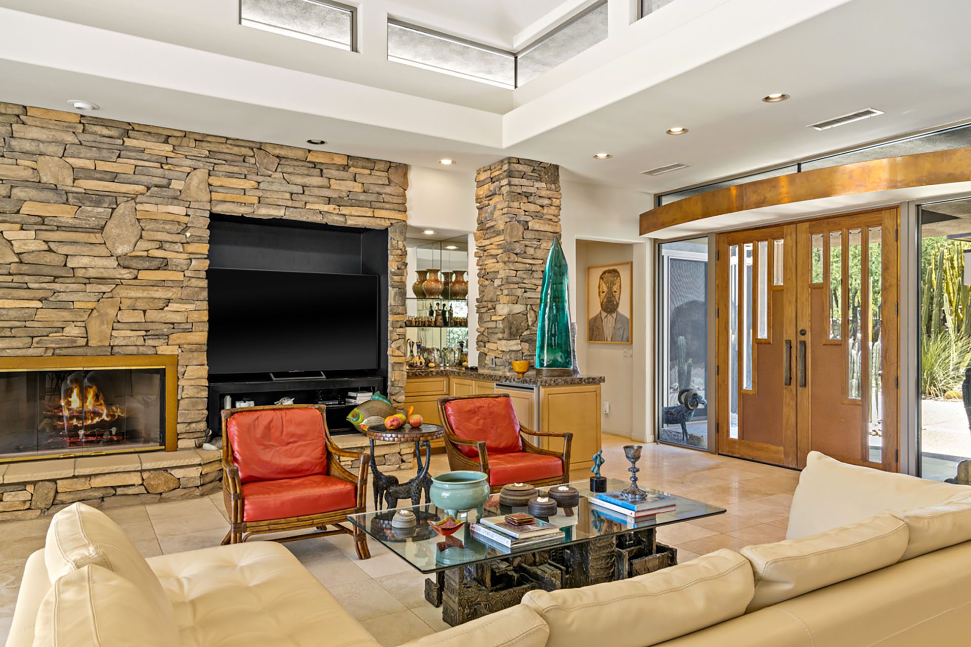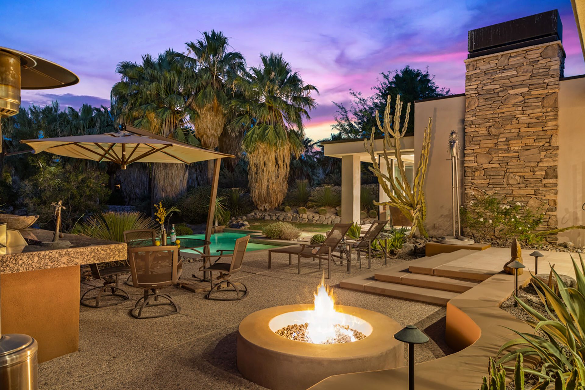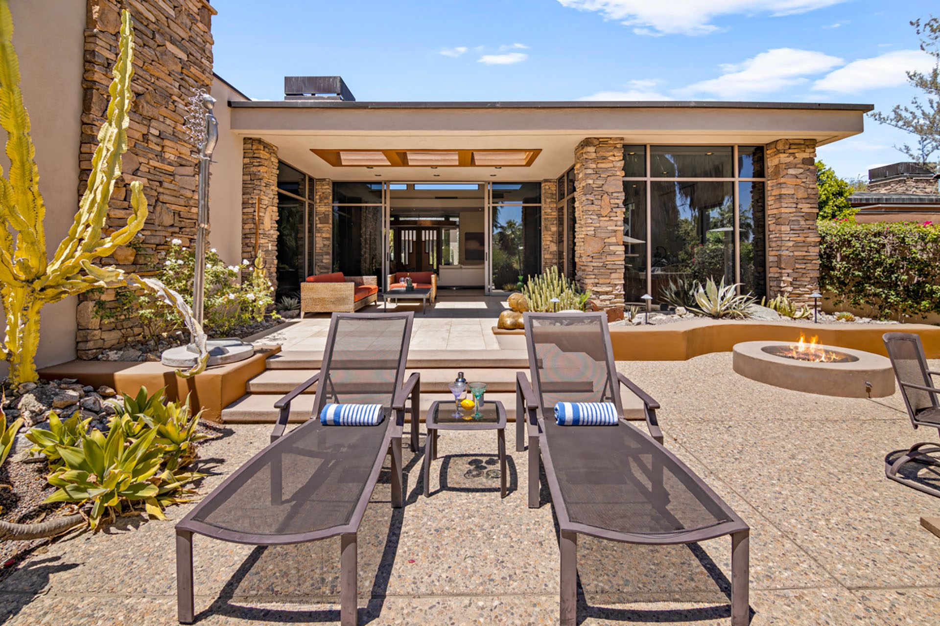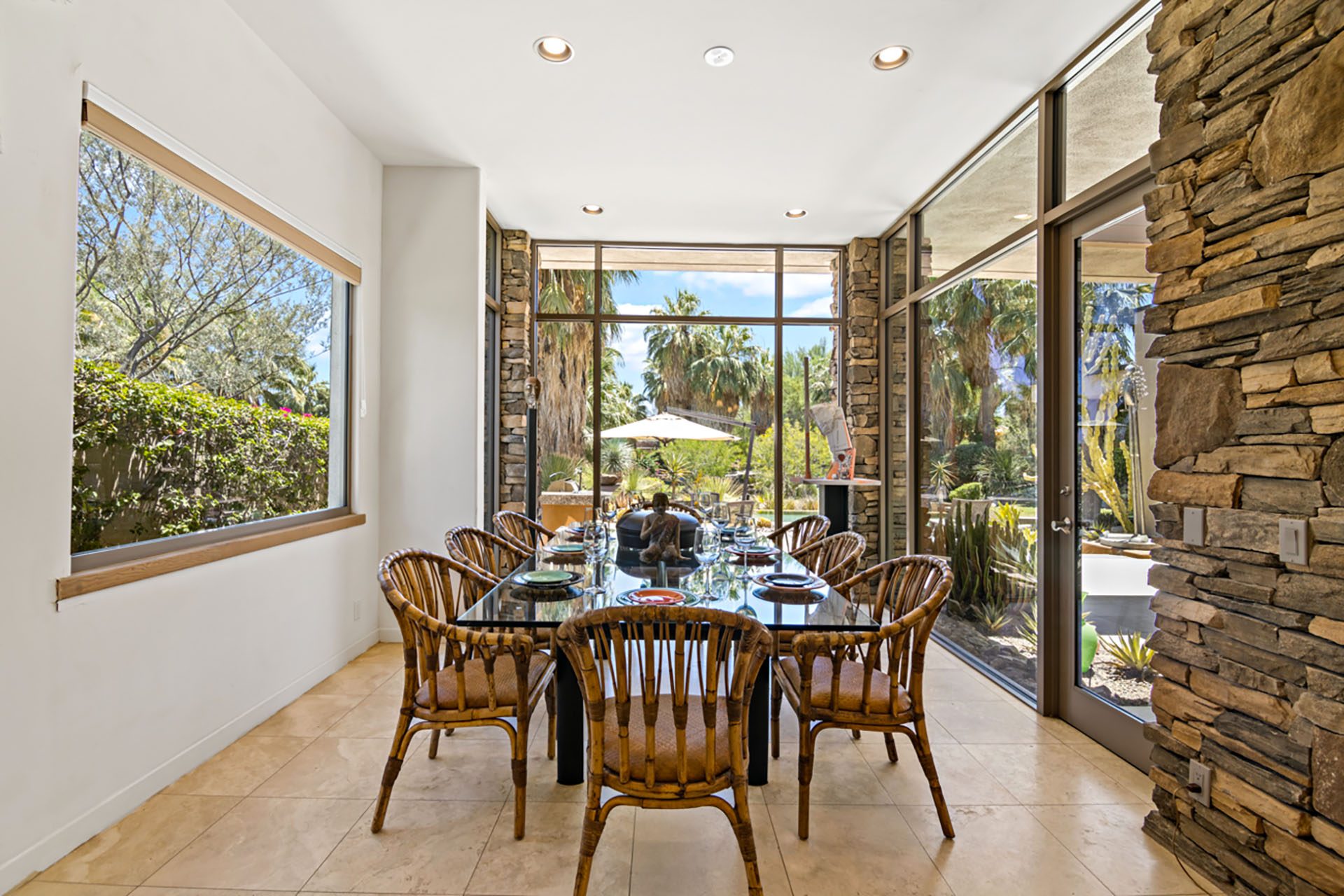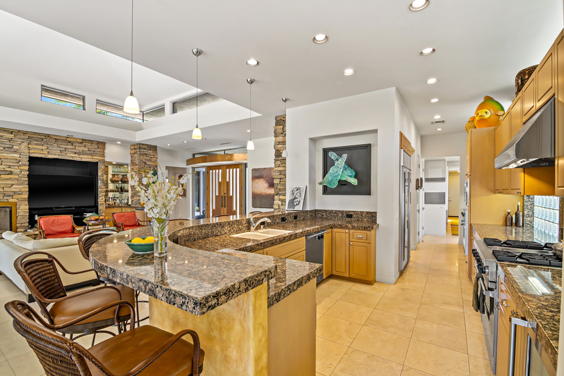 Open concept floorplan, vaulted ceilings with clerestory windows and walls of glass for truly seamless indoor-outdoor living. The spacious great room has comfortable seating, TV, wet bar and opens directly up to the covered outdoor living room. The chefs kitchen has an expansive center island with 6 seats at the bar and high-end appliances. The dining room has seating for 8 and also opens up to the outdoors.