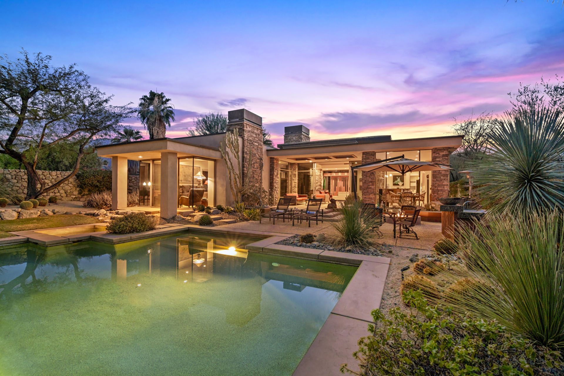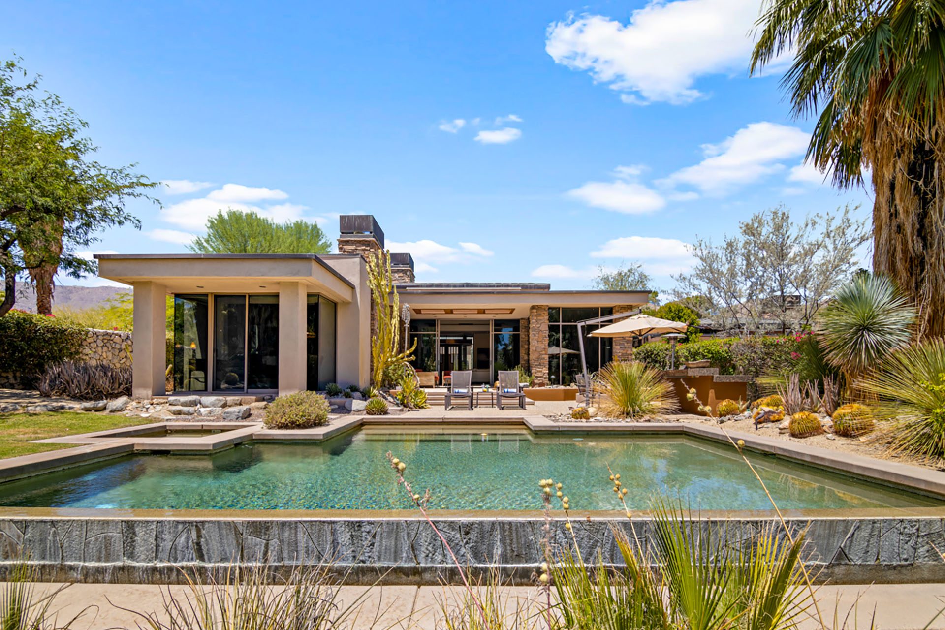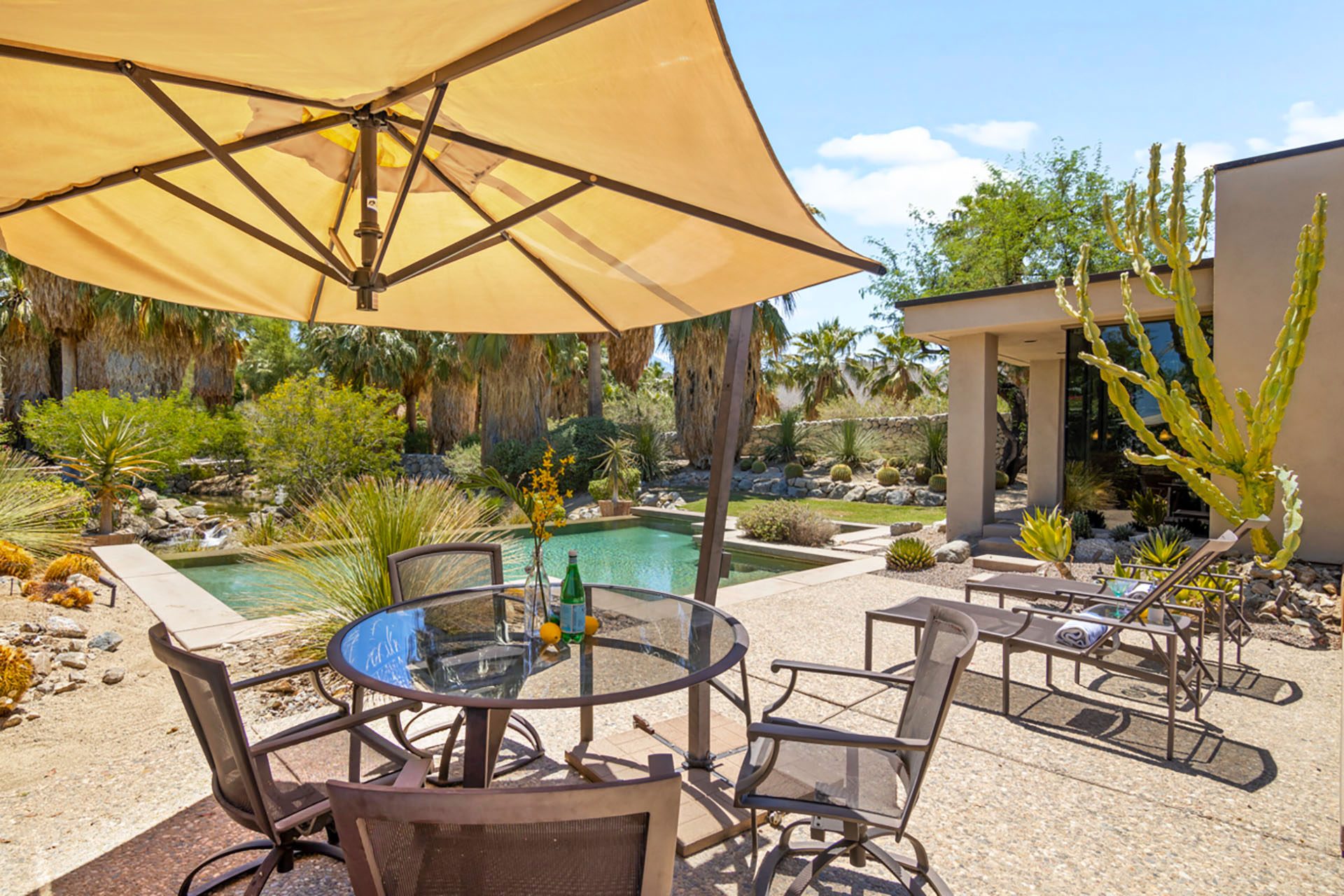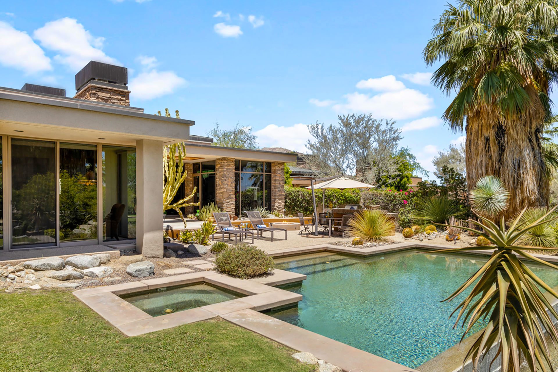 The Lakehouse at Bighorn - located in a lovely setting, with infinity pool, running streams, waterfalls, mountains and a private putting green in view. This peaceful estate will invite you to relax and enjoy the serenity of the desert. The massive floor to ceiling sliders reveal the backyard paradise, with pool and spa, lounge chairs, outdoor dining, gas firepit and mature lush landscaping of palms and cactus.