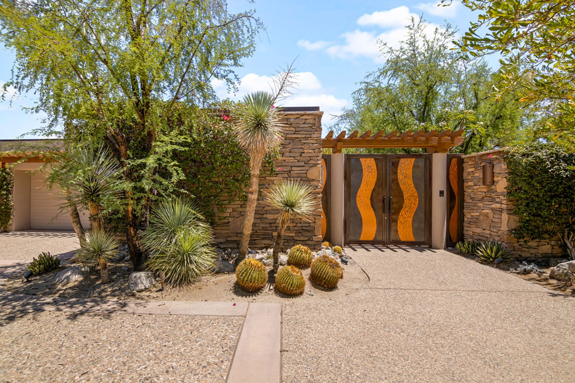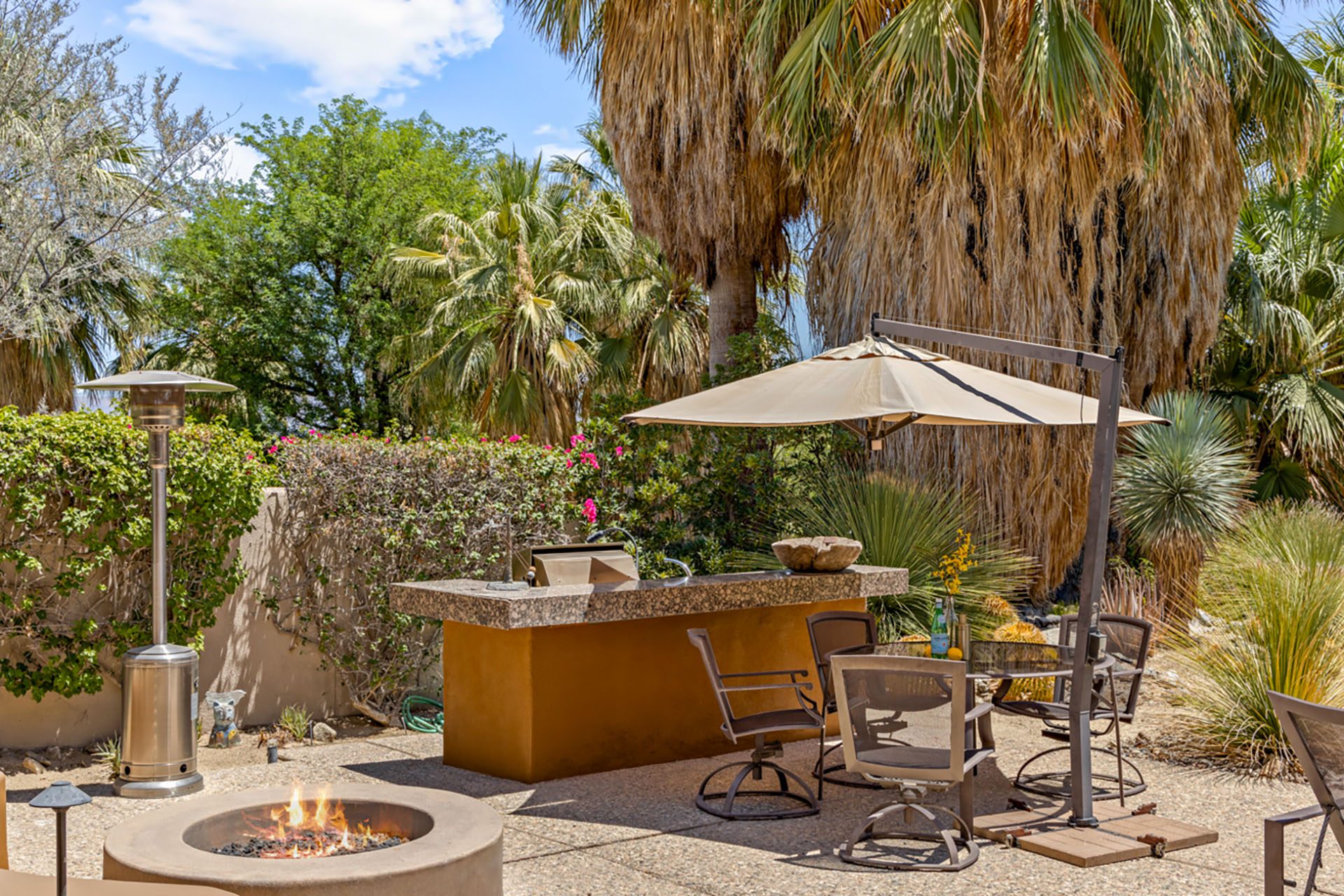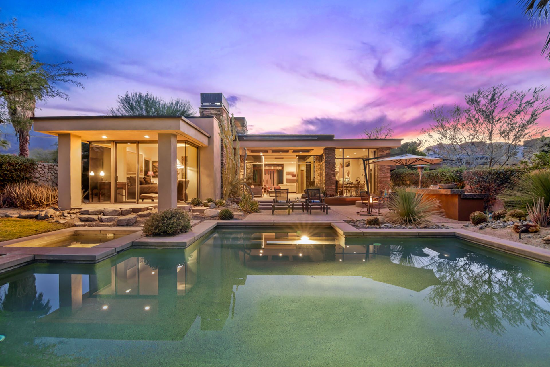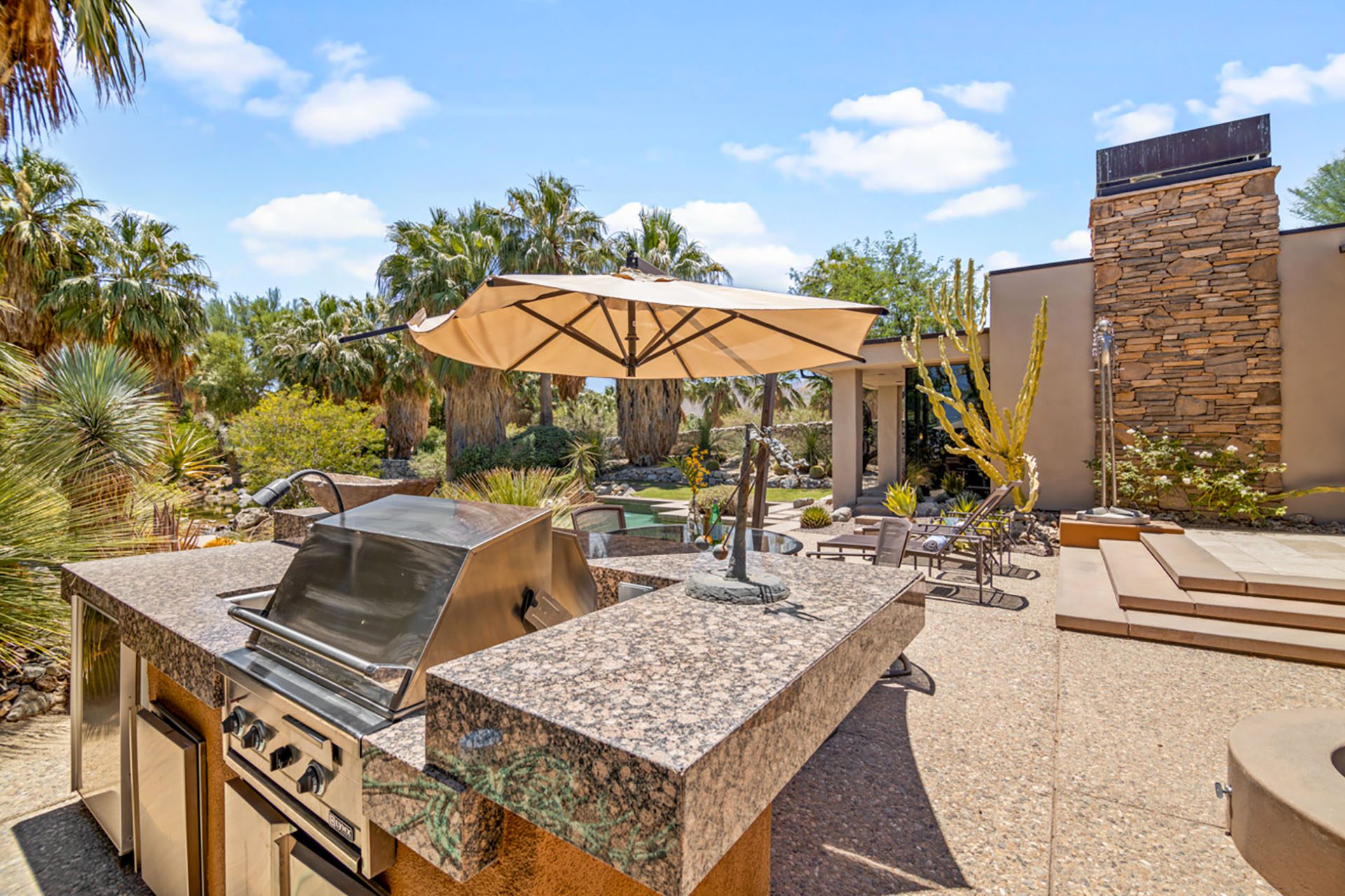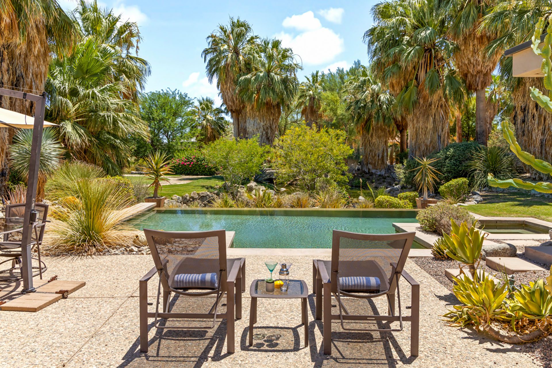 The Lakehouse at Bighorn - located in a lovely setting, with infinity pool, running streams, waterfalls, mountains and a private putting green in view. This peaceful estate will invite you to relax and enjoy the serenity of the desert. The massive floor to ceiling sliders reveal the backyard paradise, with pool and spa, lounge chairs, outdoor dining, gas firepit and mature lush landscaping of palms and cactus.