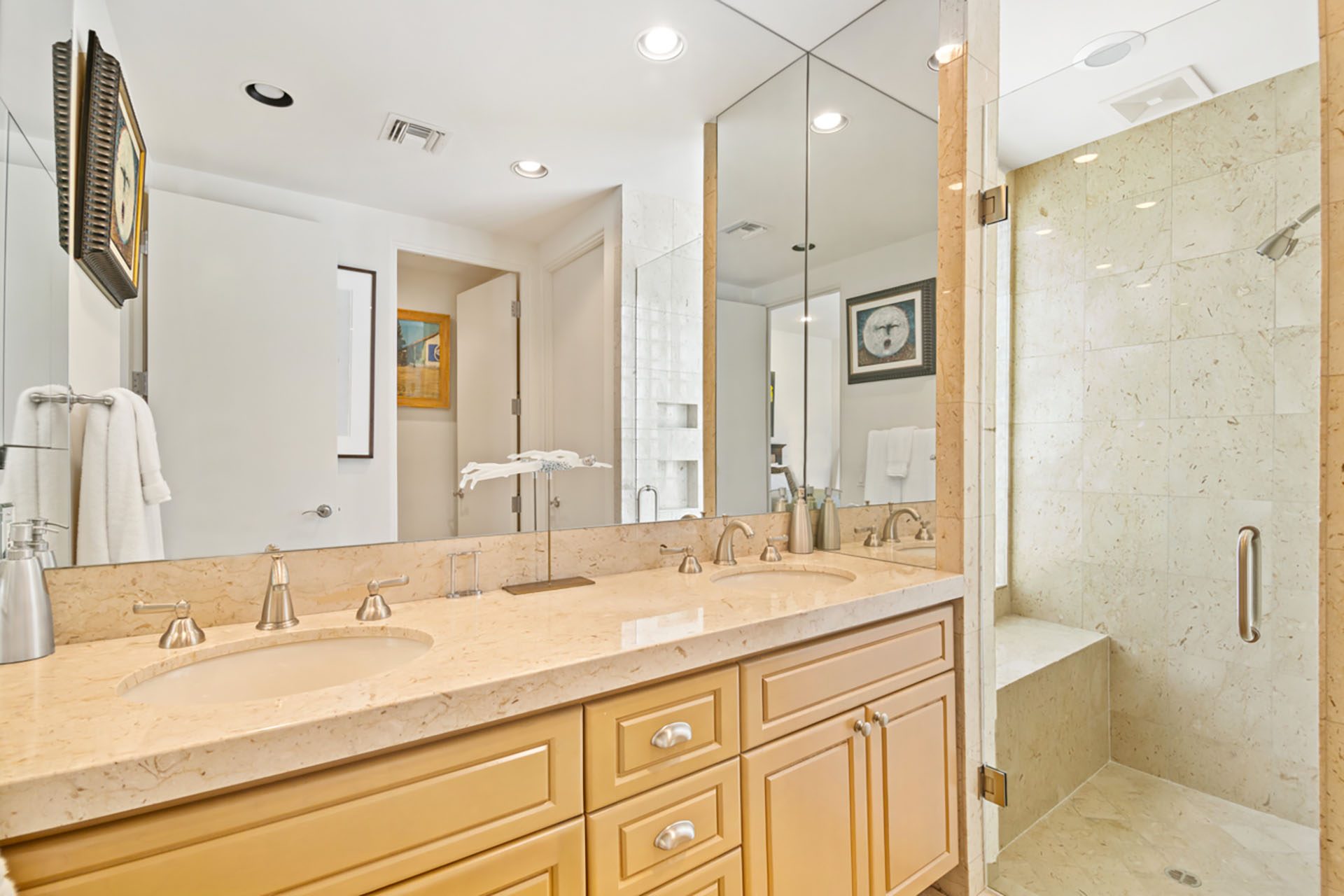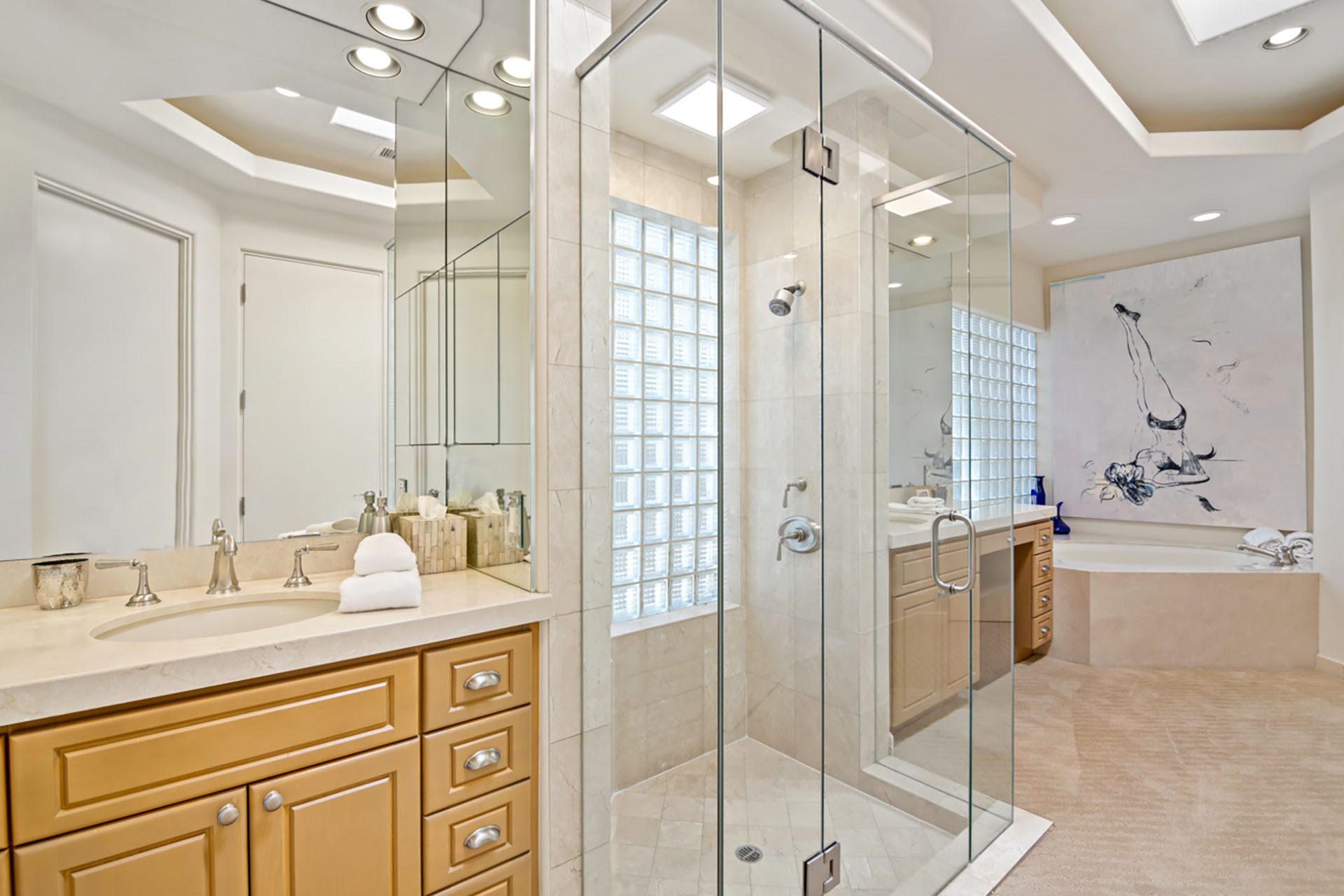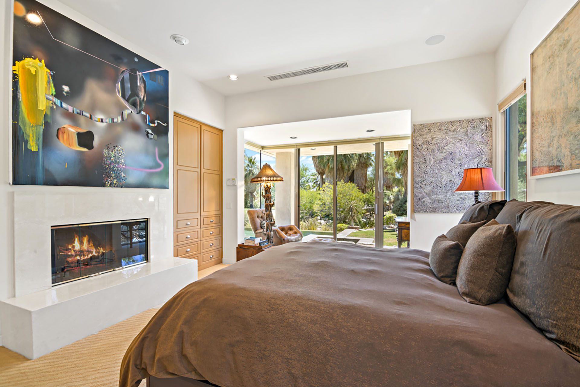 The luxurious Master Suite is spacious with a King bed, flatscreen TV, fireplace and glass sliders that open to the outdoor spa. The Master Bathroom has dual sinks, jacuzzi tub and shower.