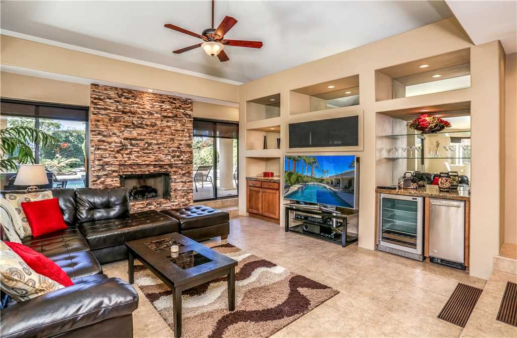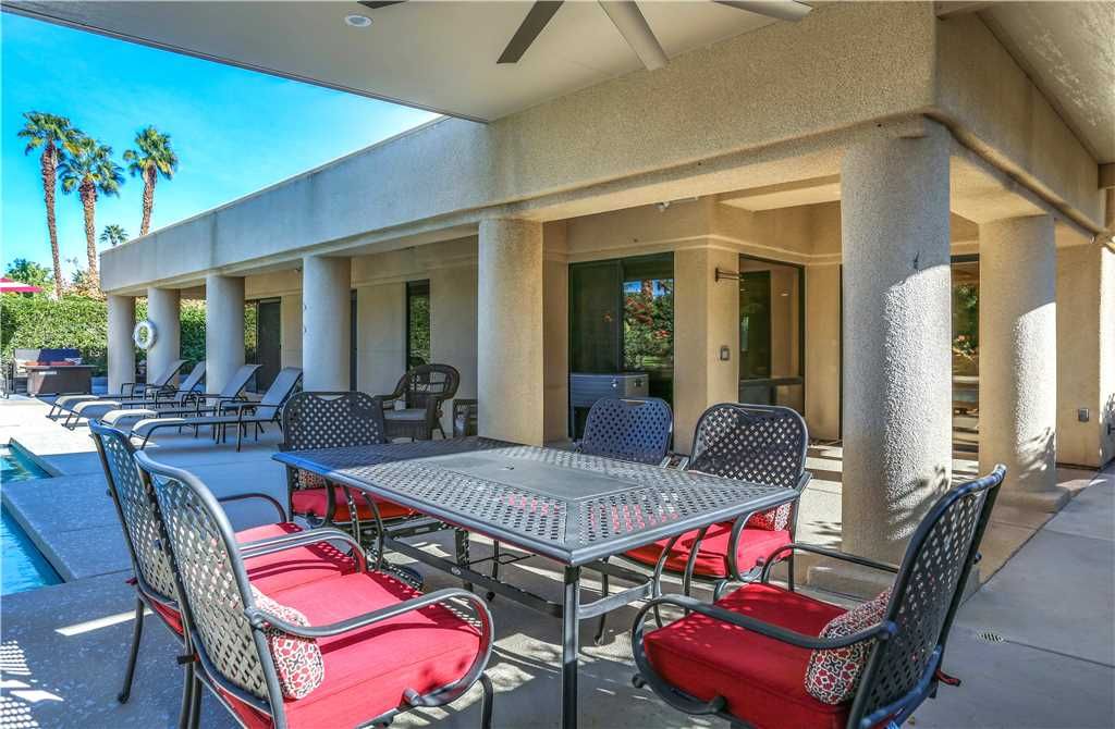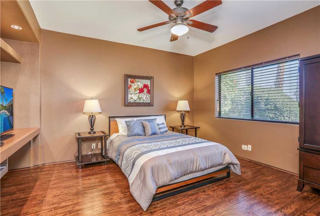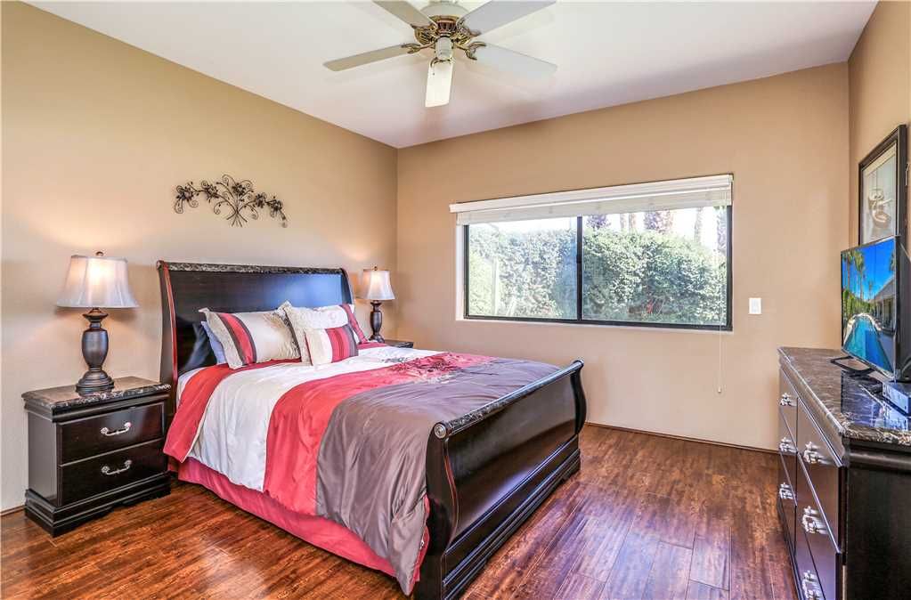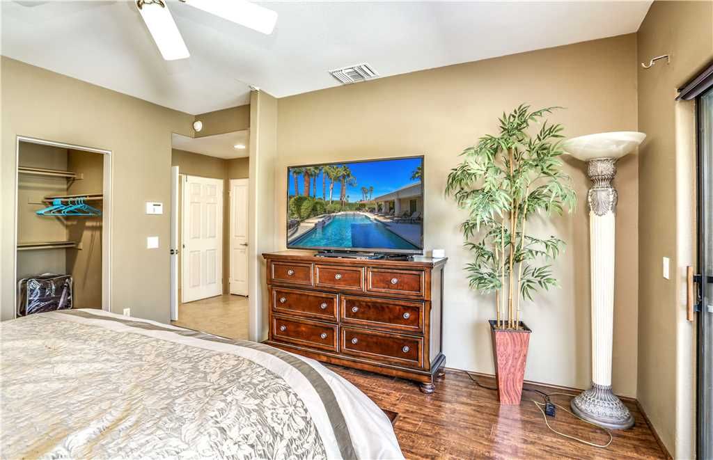 The Alluring Palm Desert Retreat boasts generous room sizes in the very open and inviting floor plan, perfectly suited for distinctive entertaining. The master suite opens up to the backyard offering direct access to the pool and spa. The master suite features a California King bed, 36"" TV, and large en-suite bath with dual sinks, tub, and walk-in shower.