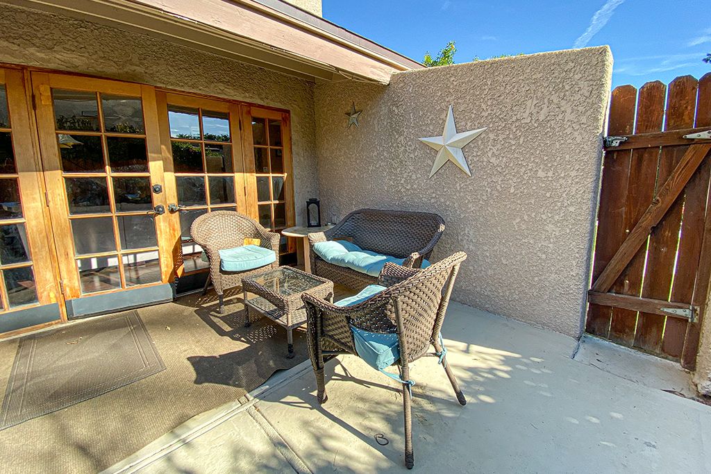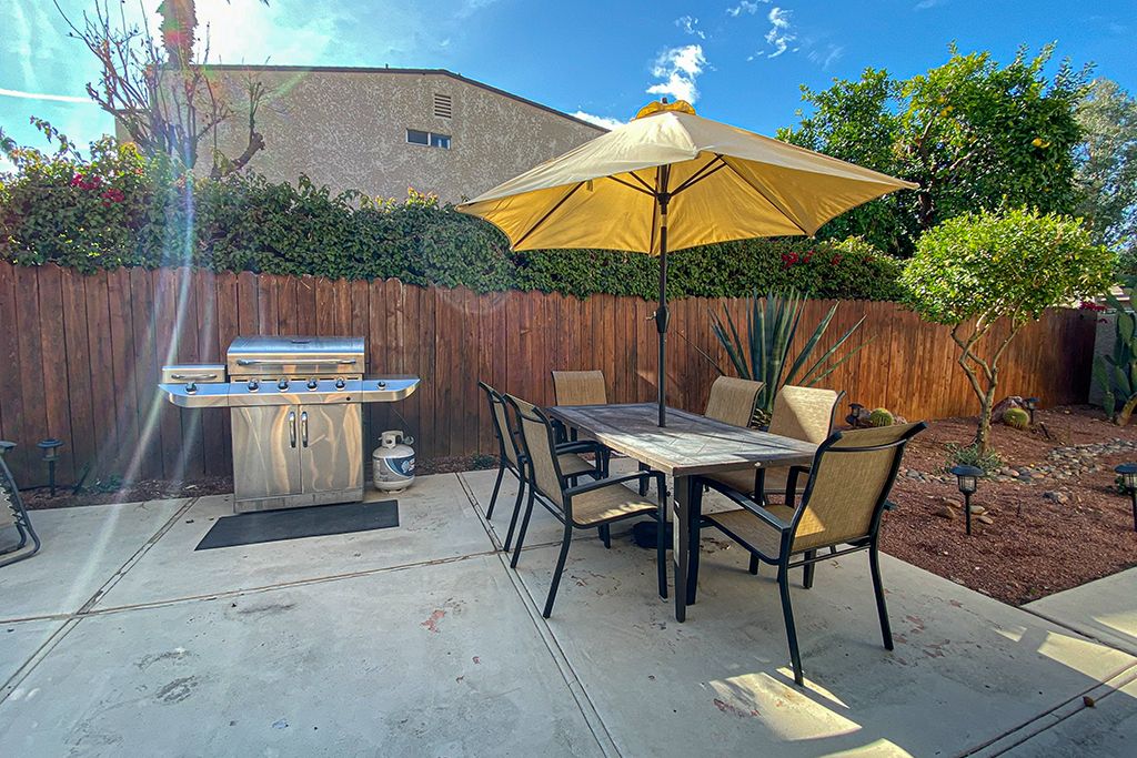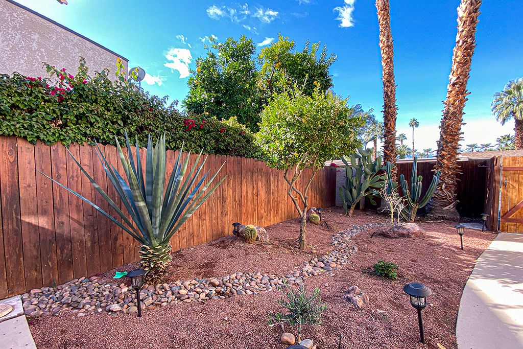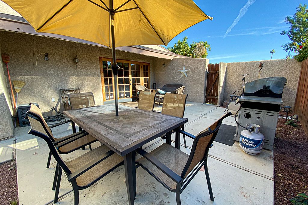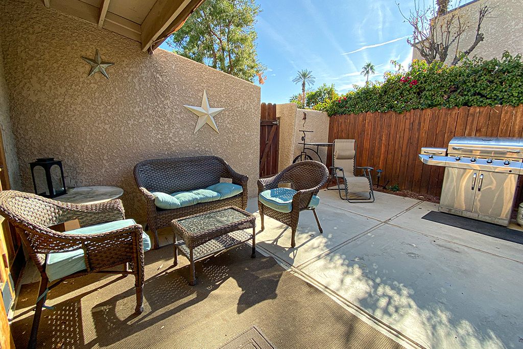 Outside in the charming private courtyard of this Palm Desert vacation rental you'll find beautiful palm tree and mountain views, a gas grill, dining for 6, 2 lounge chairs, cool misting system, and additional outdoor seating.