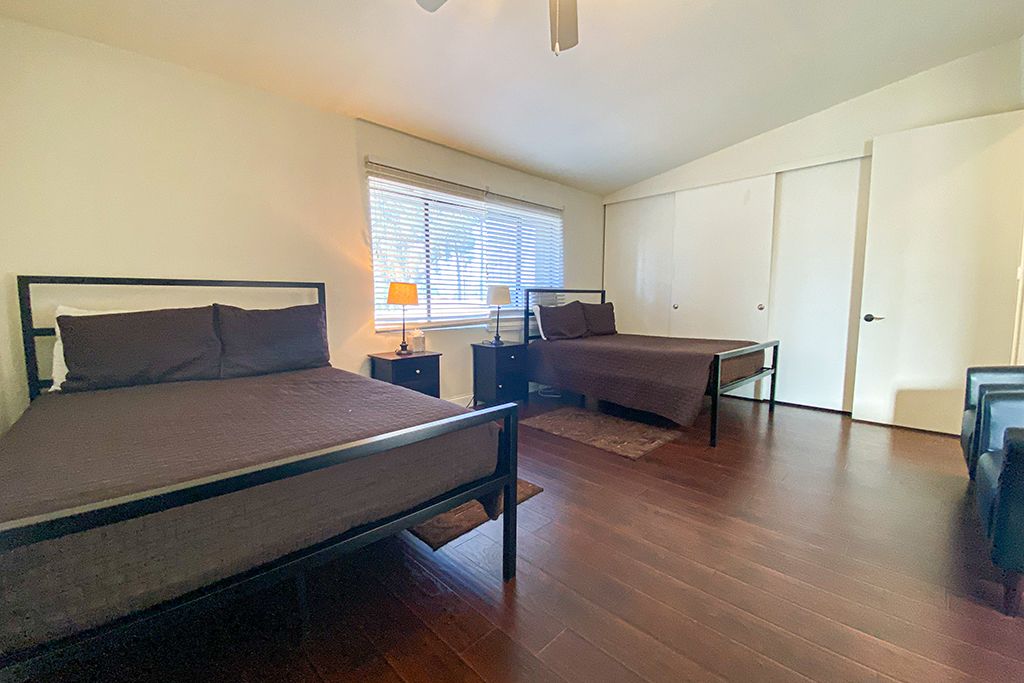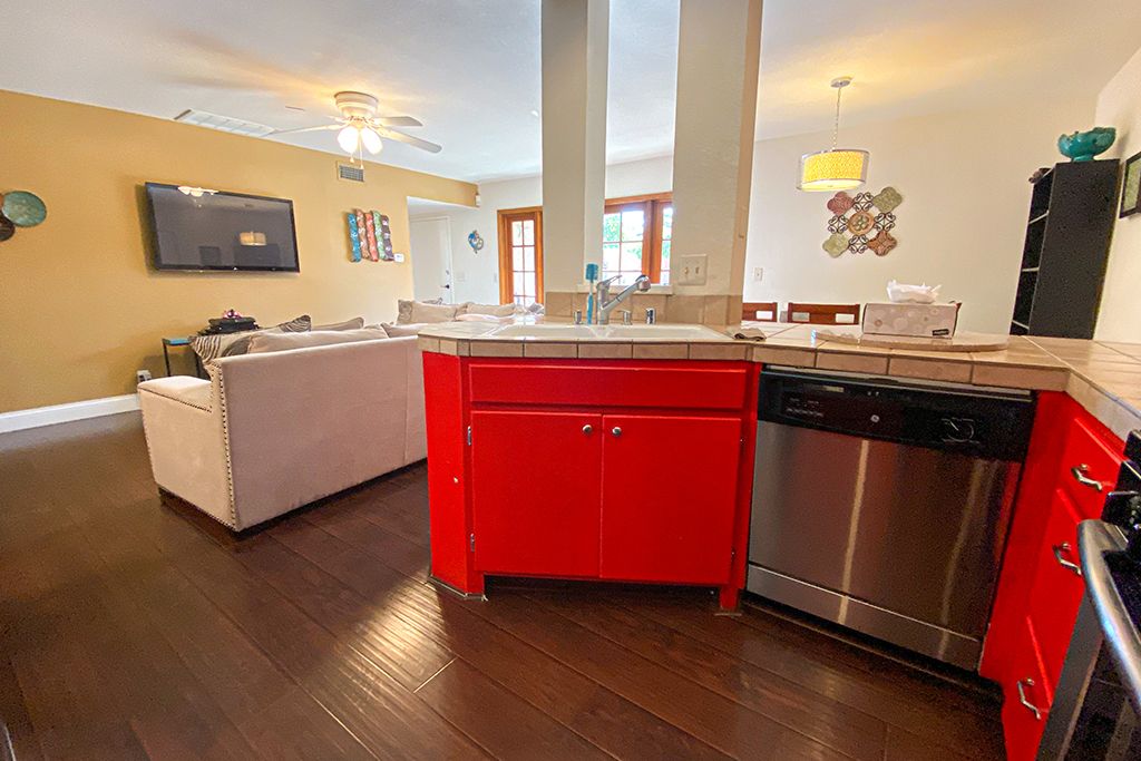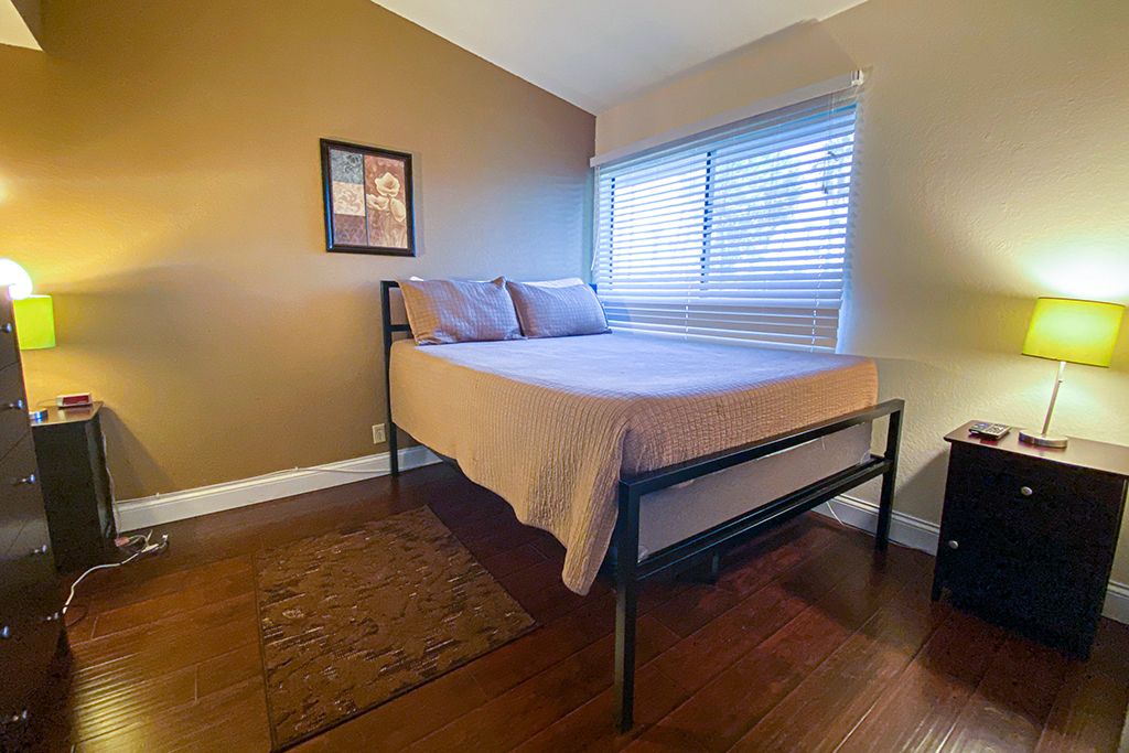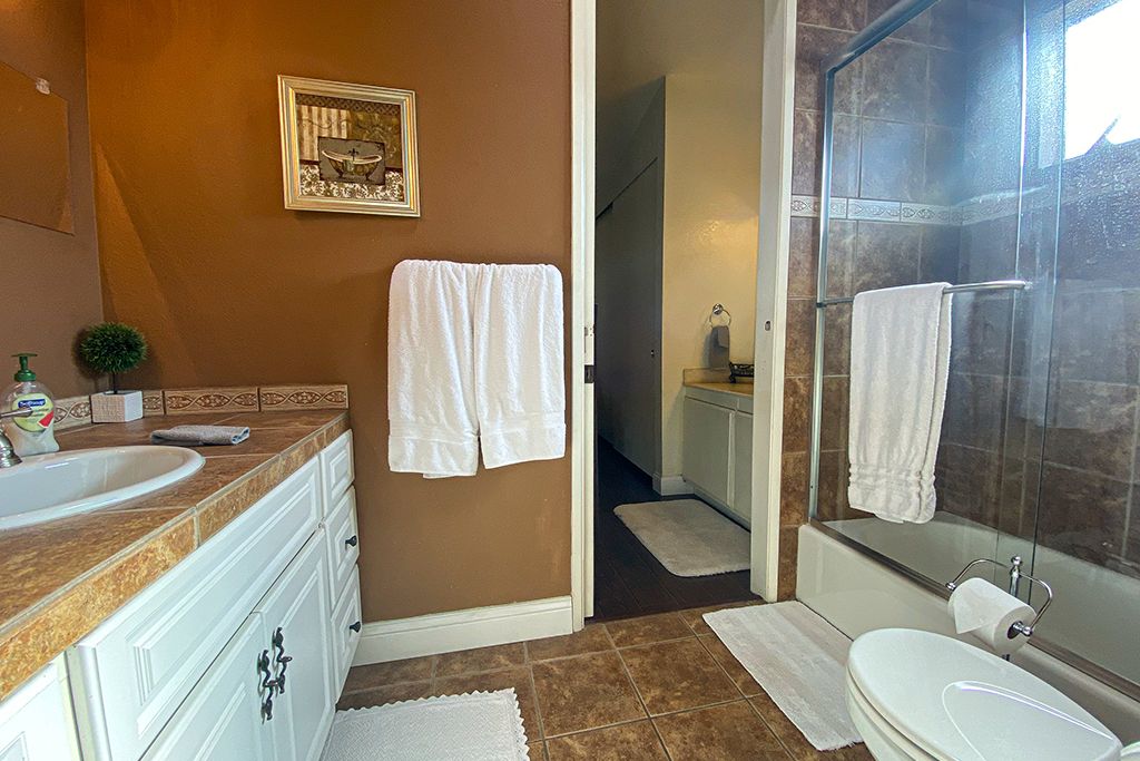 There is one bedroom downstairs and 2 bedrooms upstairs in this 3 bedroom vacation rental condo that is appointed with a queen size bed and 32"" TV. Down the hall you'll find a full bath with tub and shower.