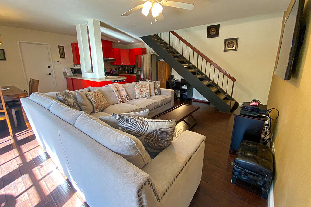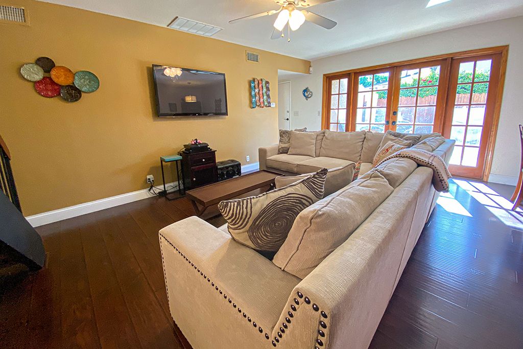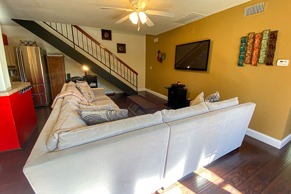 The living room of this 2 story vacation condo in Palm Desert is appointed with comfortable and stylish leather furniture, a 52"" flat screen TV and a playstation 3 (that will play DVD's and CD's). You'll find the living room is open to the dining room, with seating for up to 6, and newly updated kitchen.