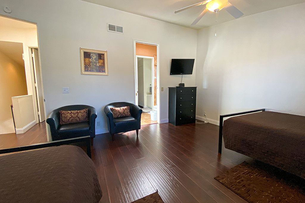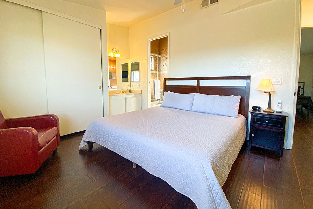 Upstairs in this Palm Desert vacation condo you'll find 2 more comfortably appointed bedrooms with an attached full bath. Enjoy spectacular mountain views from one bedroom with 2 queen size beds and a 32"" TV. The second bedroom has a king size bed, 32"" TV, DVD player, and views of the community tennis courts and mountains beyond.