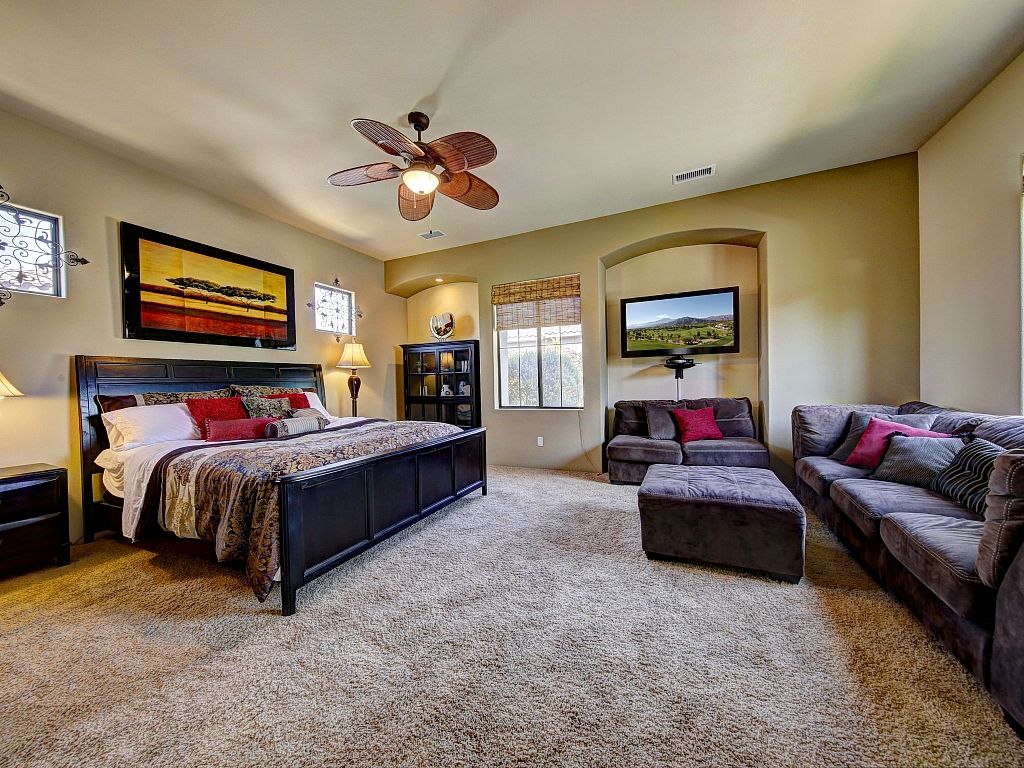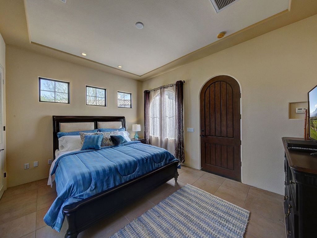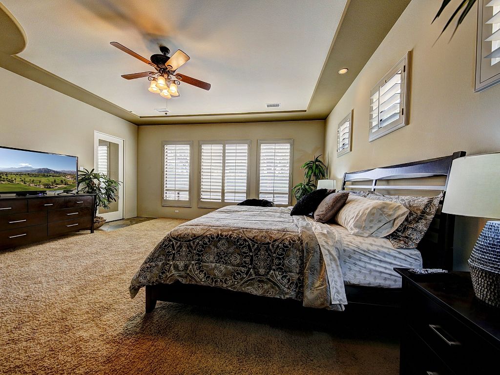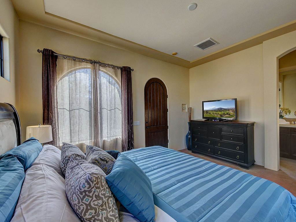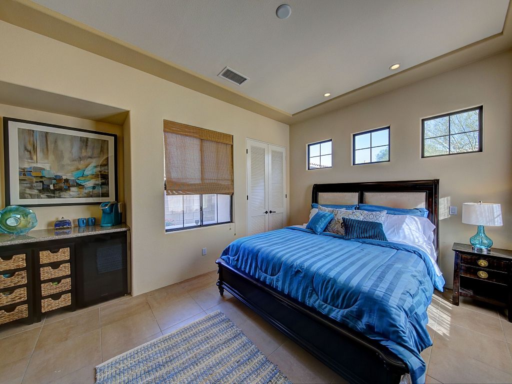 The bedrooms in this Palm Desert vacation home are sophisticated and comfortable. The spacious master suite features a Cal King bed, 55"" HDTV, direct access to the backyard oasis, large closet spaces, and an en-suite bathroom fit for a King and Queen.