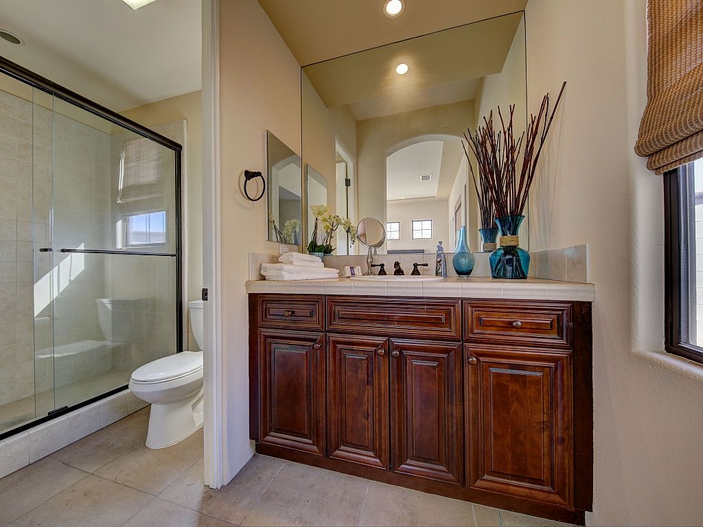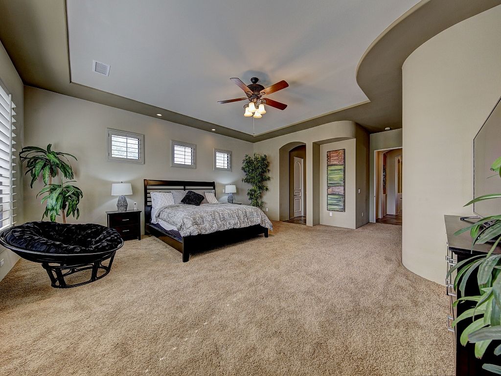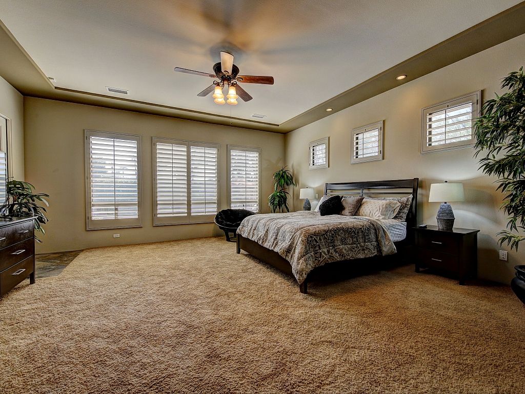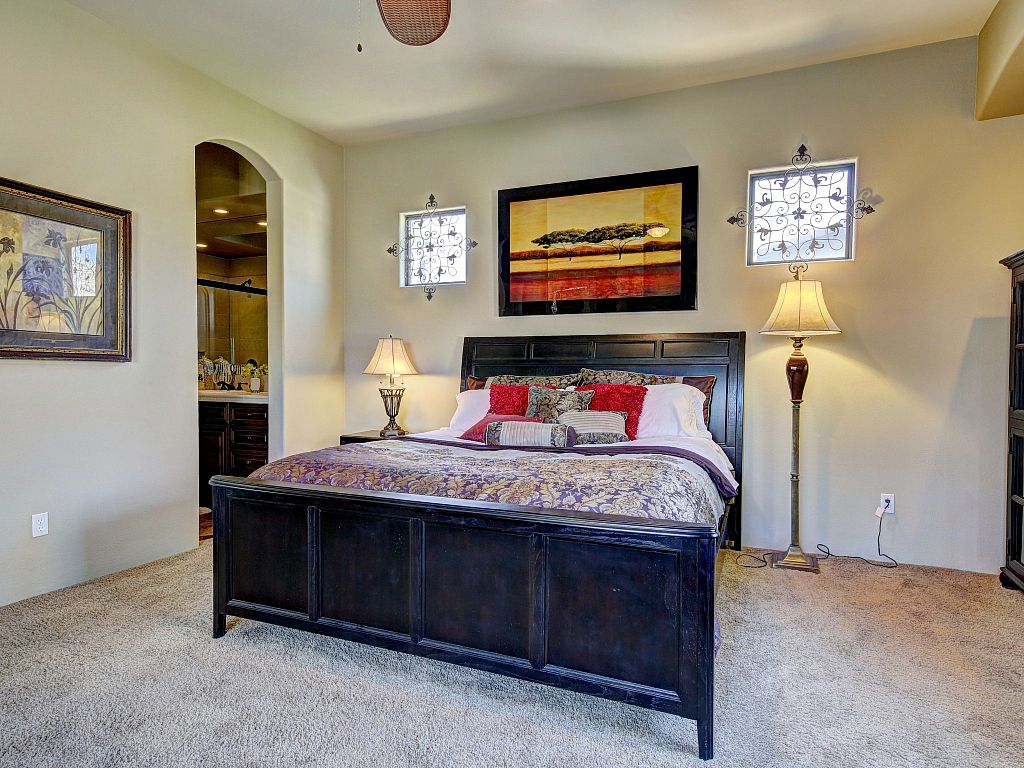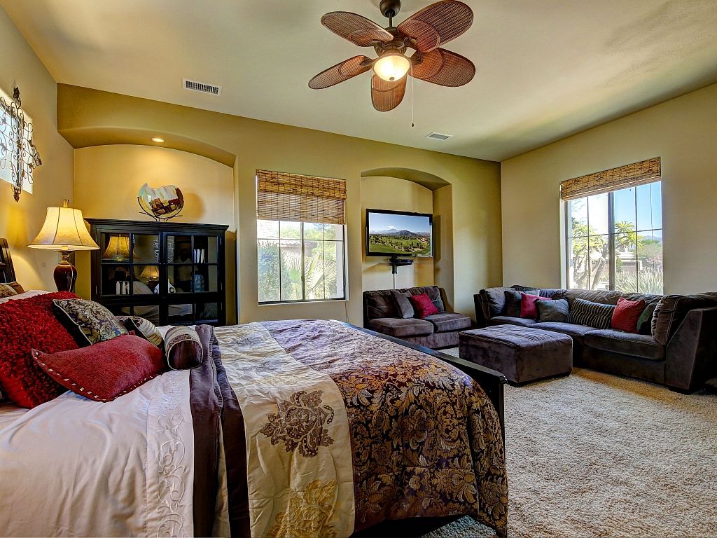 The bedrooms in this Palm Desert vacation home are sophisticated and comfortable. The spacious master suite features a Cal King bed, 55"" HDTV, direct access to the backyard oasis, large closet spaces, and an en-suite bathroom fit for a King and Queen.