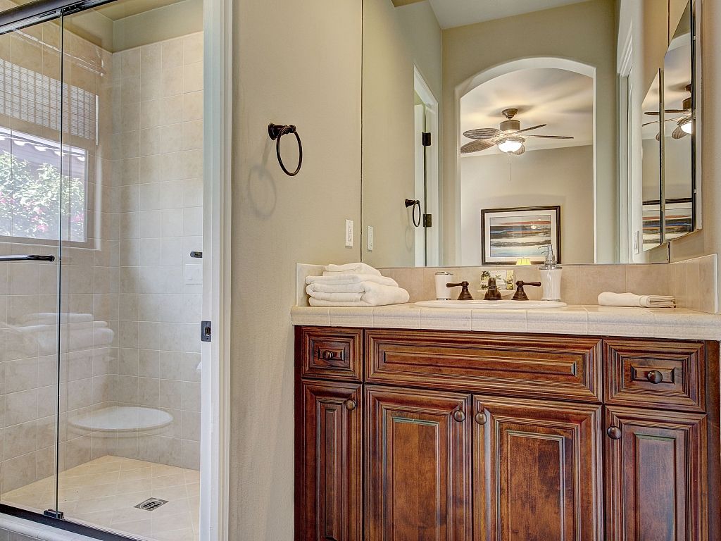 The 3rd guest bedroom also features a Cal King bed, ceiling fan, closet, and an en-suite bathroom with dual vanity sinks.