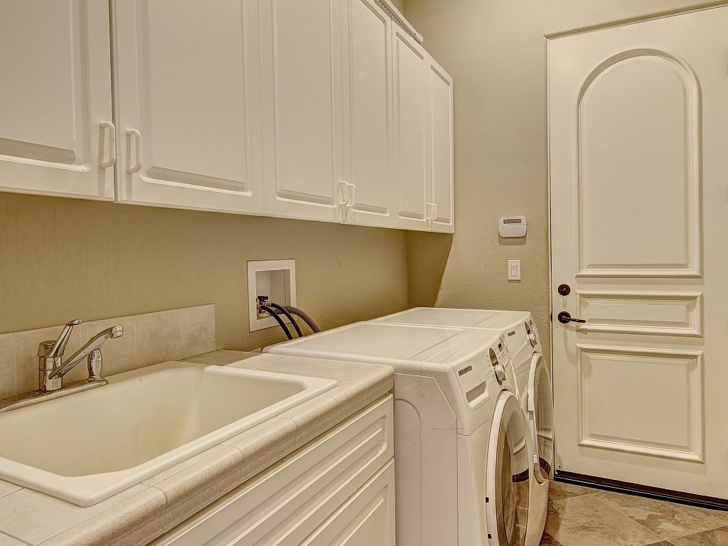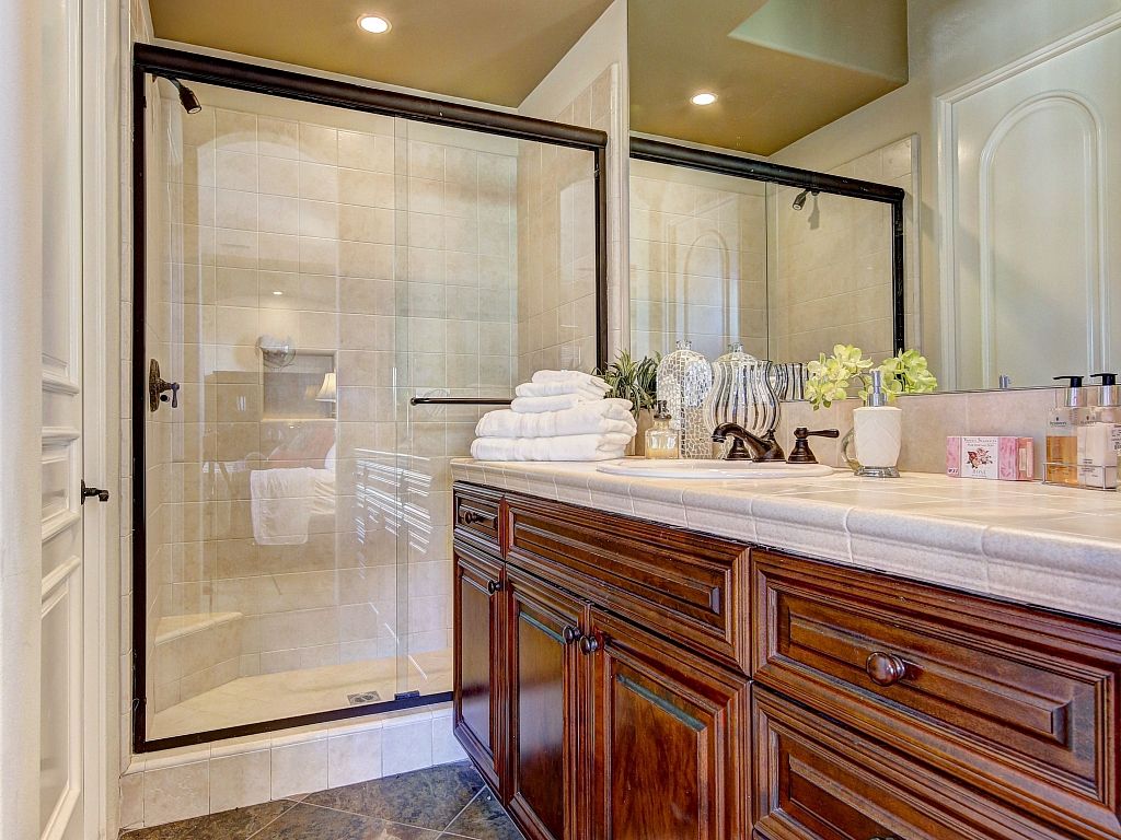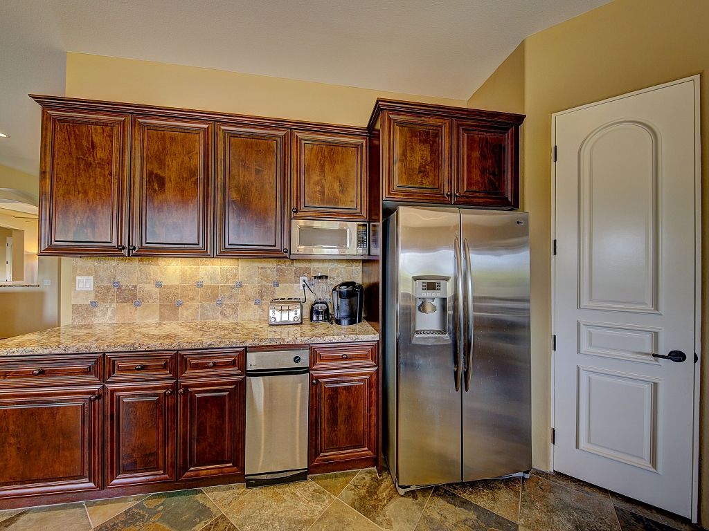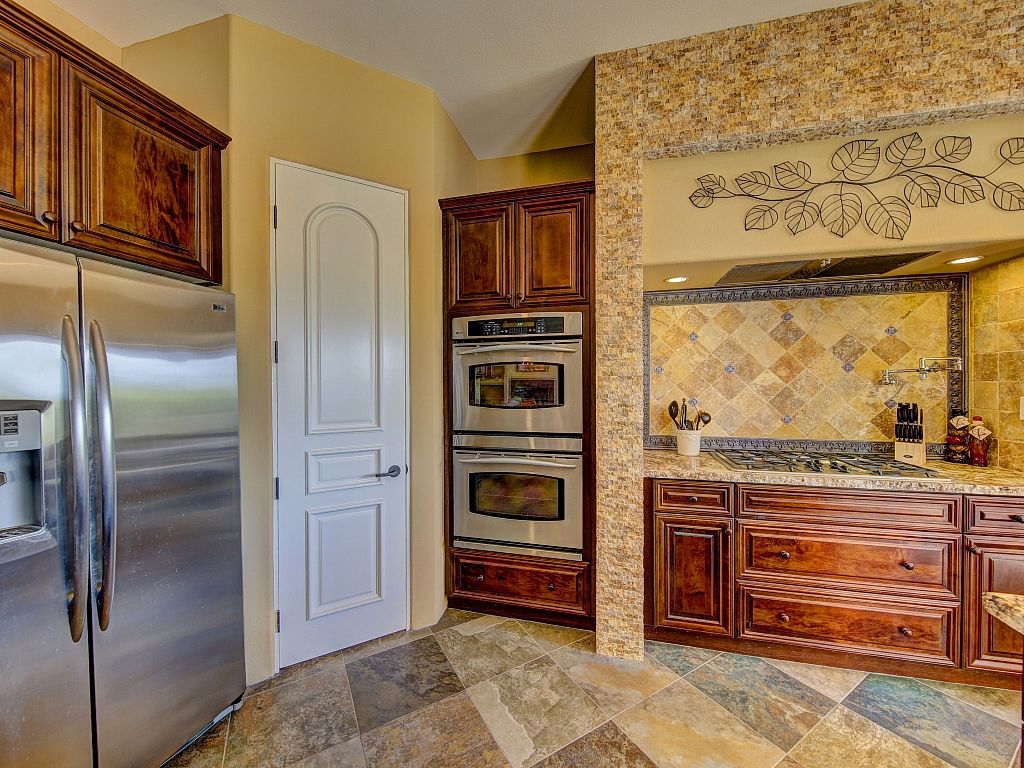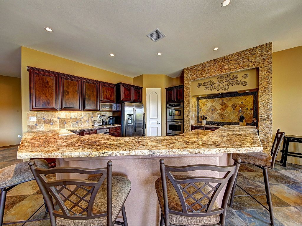 The chef's kitchen is open to the living room and has everything you need for preparing delicious meals and hosting friends and family. The chef in your group will love this gourmet kitchen that has a walk in pantry, grotto, double ovens, a gas cooktop, stainless steel appliances, expansive granite countertops, custom cabinets, and a breakfast bar with seating for 4. There's also seating for 6 at the kitchen table, while another 6 can sit at the dining room table.
