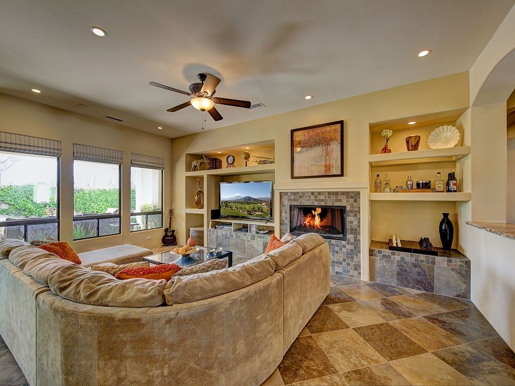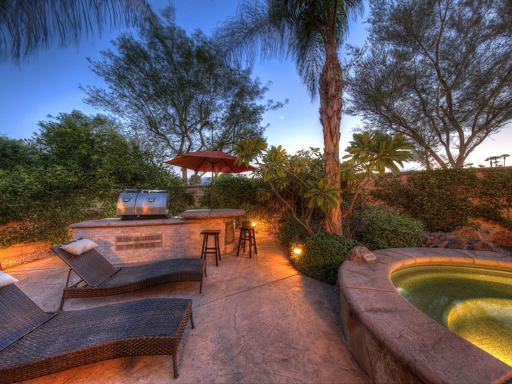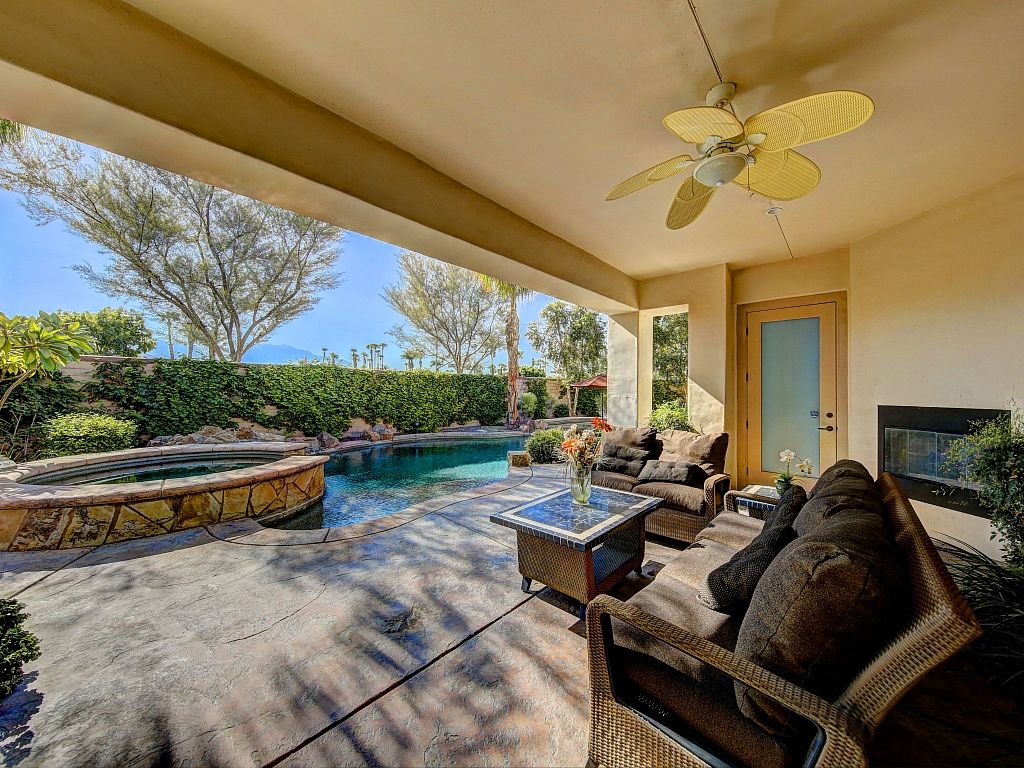 You and your guests will be transformed by the spacious backyard of this outstanding Palm Desert vacation home. Under the covered patio you will find a gas fireplace, comfortable seating arrangements, ceiling fan, and mountain views as you're surrounded by the lush landscaping.