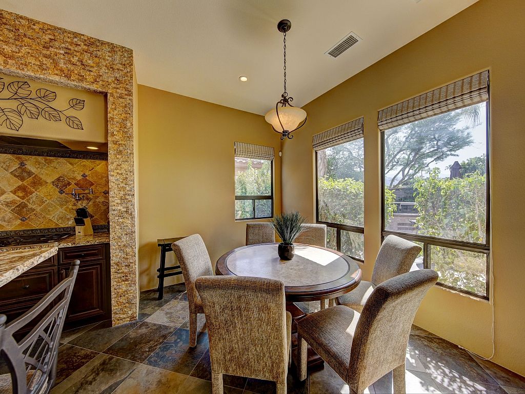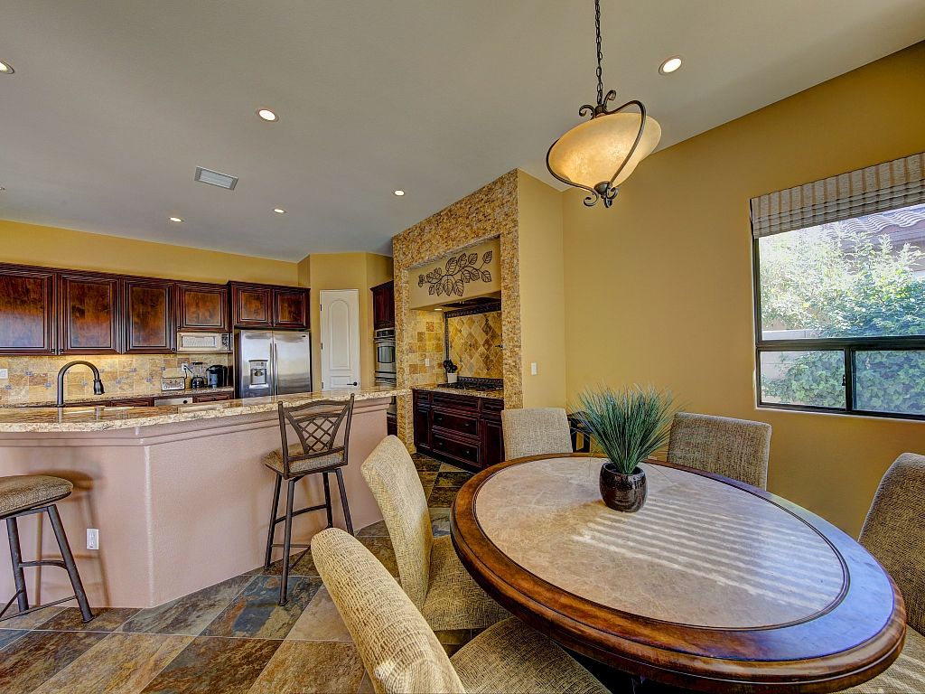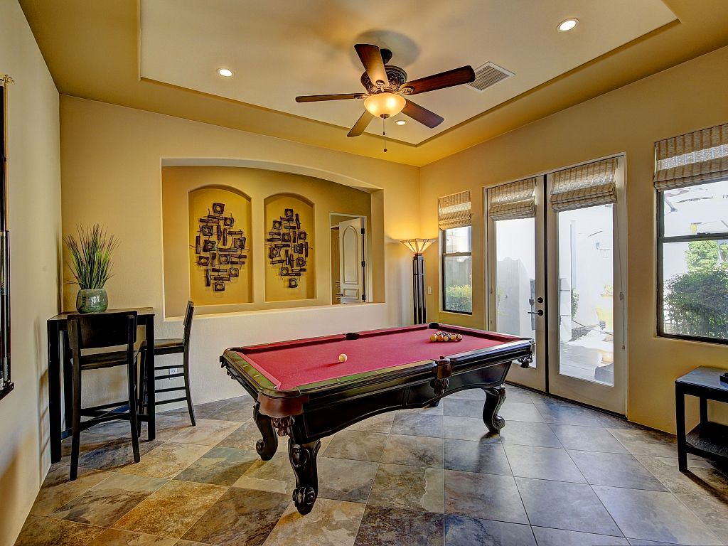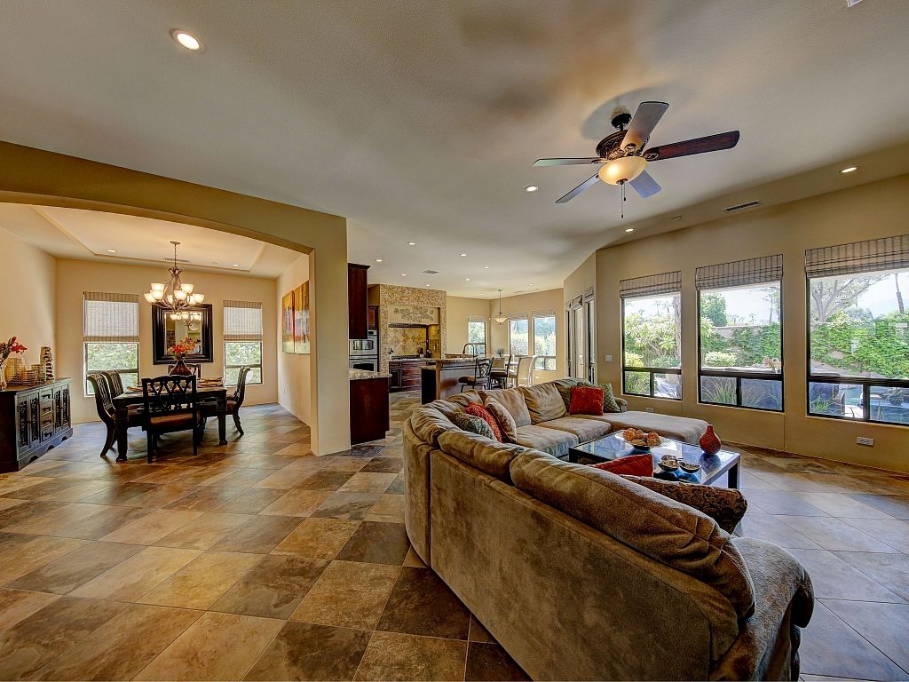 You'll discover that the living area is very spacious and lit with natural sunshine that pours in through all the expansive windows and doors that open up to the covered patio and sparkling pool. This versatile room features upscale decor, a gas fireplace, 70"" TV, comfortable seating, and 2 dining areas.
