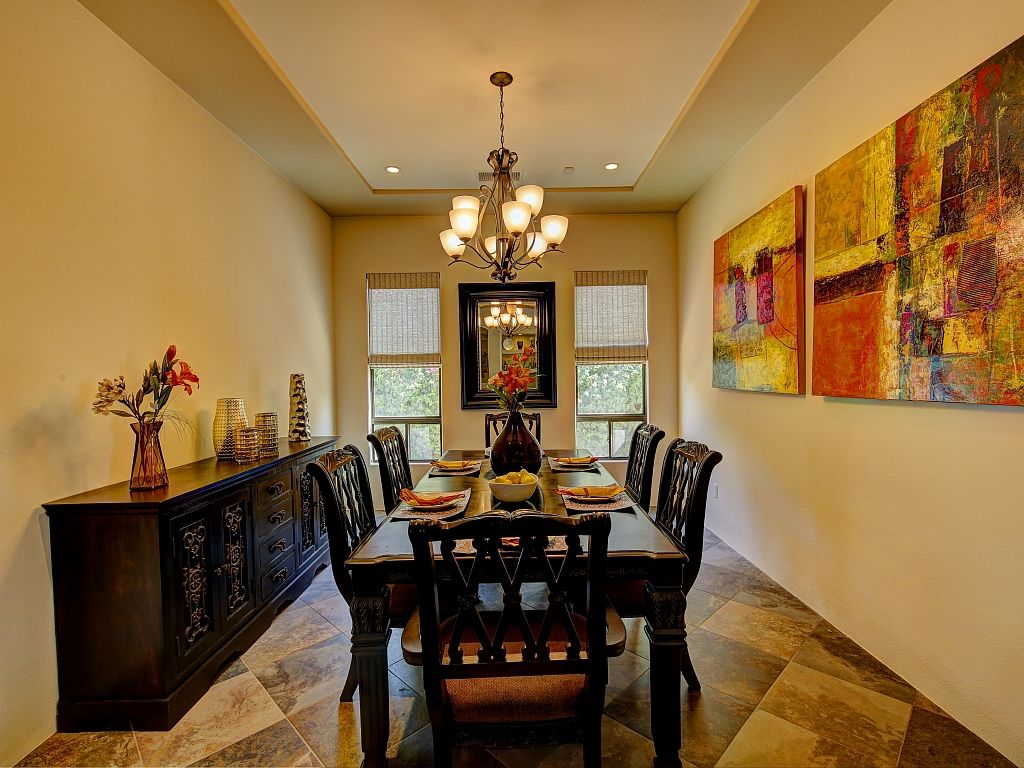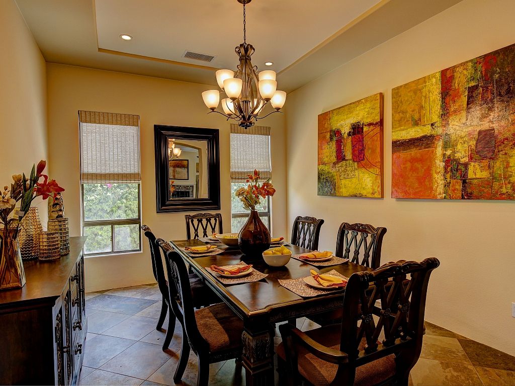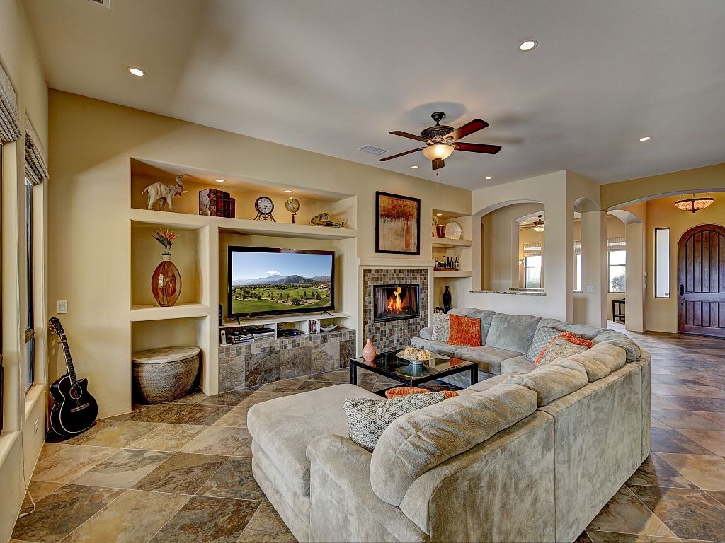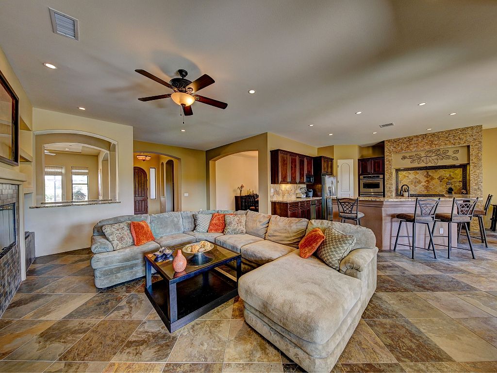 You'll discover that the living area is very spacious and lit with natural sunshine that pours in through all the expansive windows and doors that open up to the covered patio and sparkling pool. This versatile room features upscale decor, a gas fireplace, 70"" TV, comfortable seating, and 2 dining areas.
