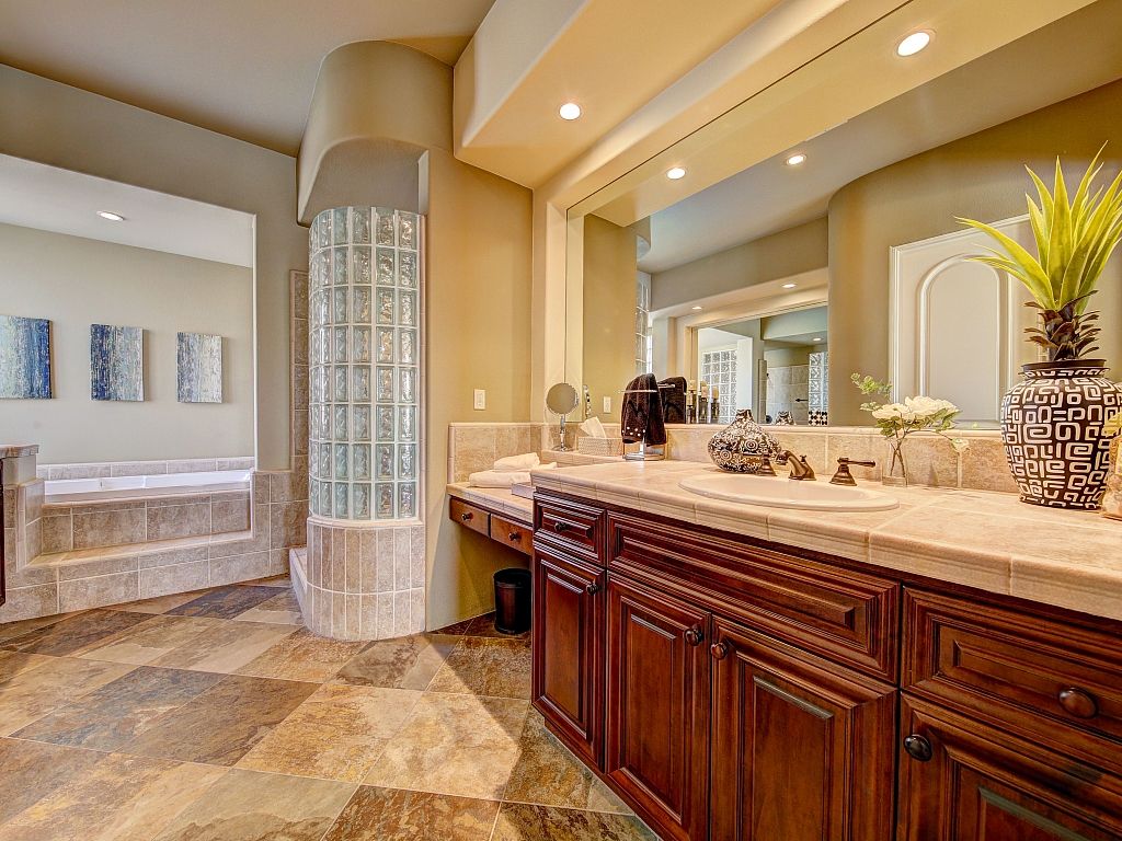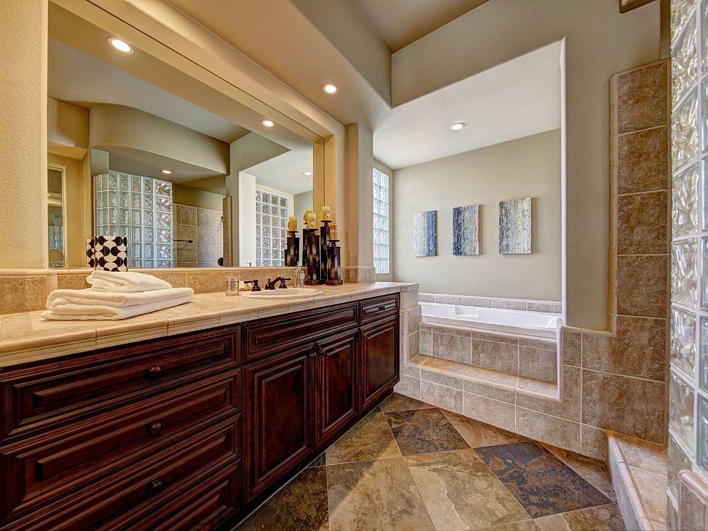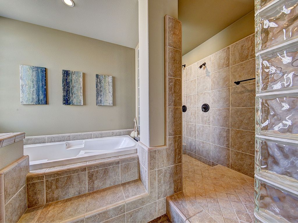 The master bathroom is a true retreat with large soaking tub, walk-in dual head shower, and opposite side vanities.