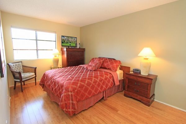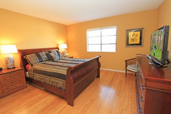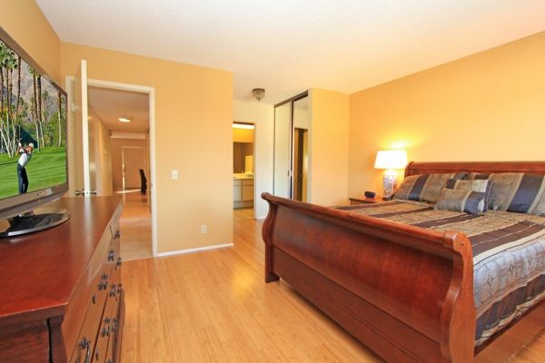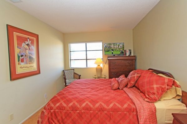 The master suite in this charming Palm Desert condo is furnished with a queen size bed, 39 inch flat screen TV, and an en-suite bathroom.