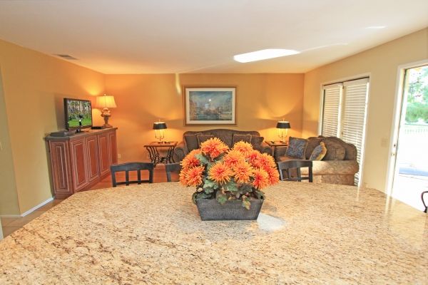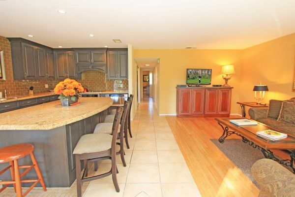 This Palm Desert vacation condo is perfect for relaxing and entertaining, offering an open floor plan that centers around the spacious living area, including the kitchen, bar seating, and family room.