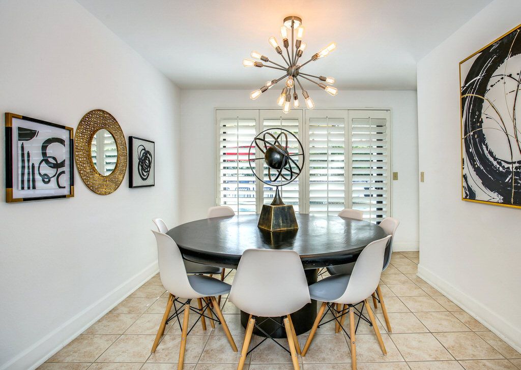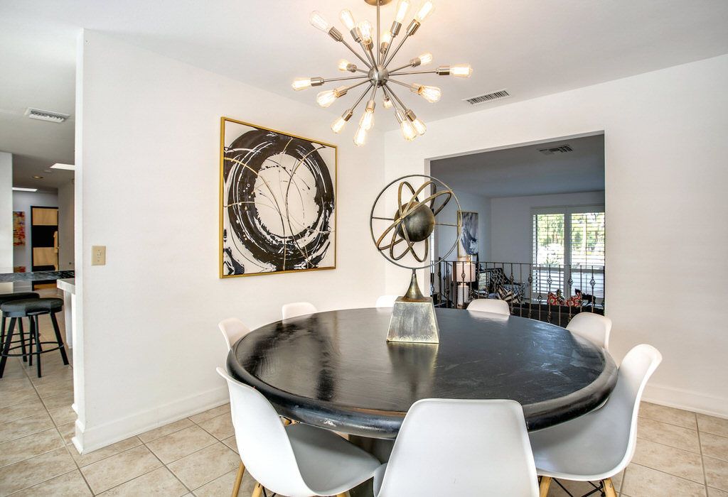 The dining room seats eight people comfortably around a large round contemporary table with parson's chairs.