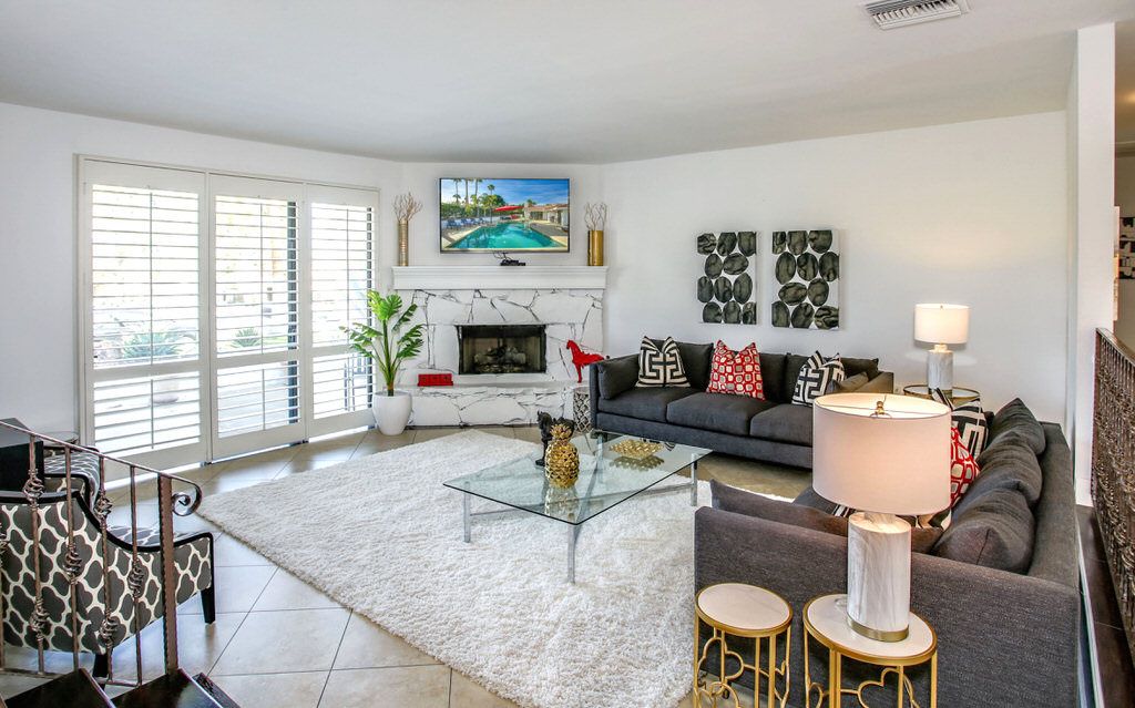 The large great room is sunken with a fireplace. The fireplace has a 65 inch TV with a Blu-ray player. The great room has comfortable seating for groups of people. It's an inviting communal area for guests to gather after a fun day in the sun at the pool, shops, and restaurants or nearby golf courses.