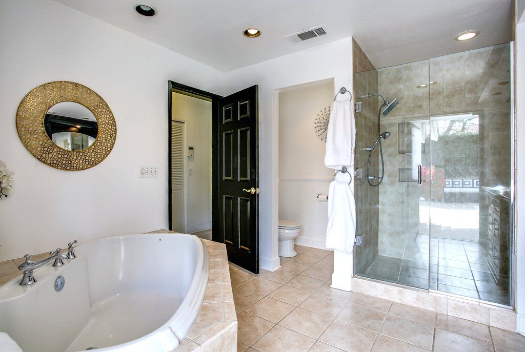 The expansive private backyard has a large in ground salt-water pool and hot tub. Two eating areas that seat 8 people or more, and outdoors living room with an outdoor TV, fire pit, heater, barbeque, 4 large umbrellas, and a retractable shade that covers the TV area. Two of the umbrellas open up to cover areas of the pool for people who need to stay out of the direct sunlight.