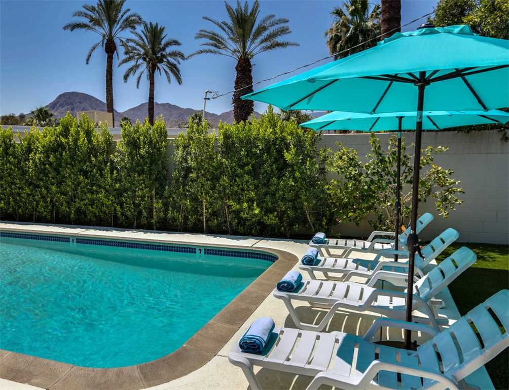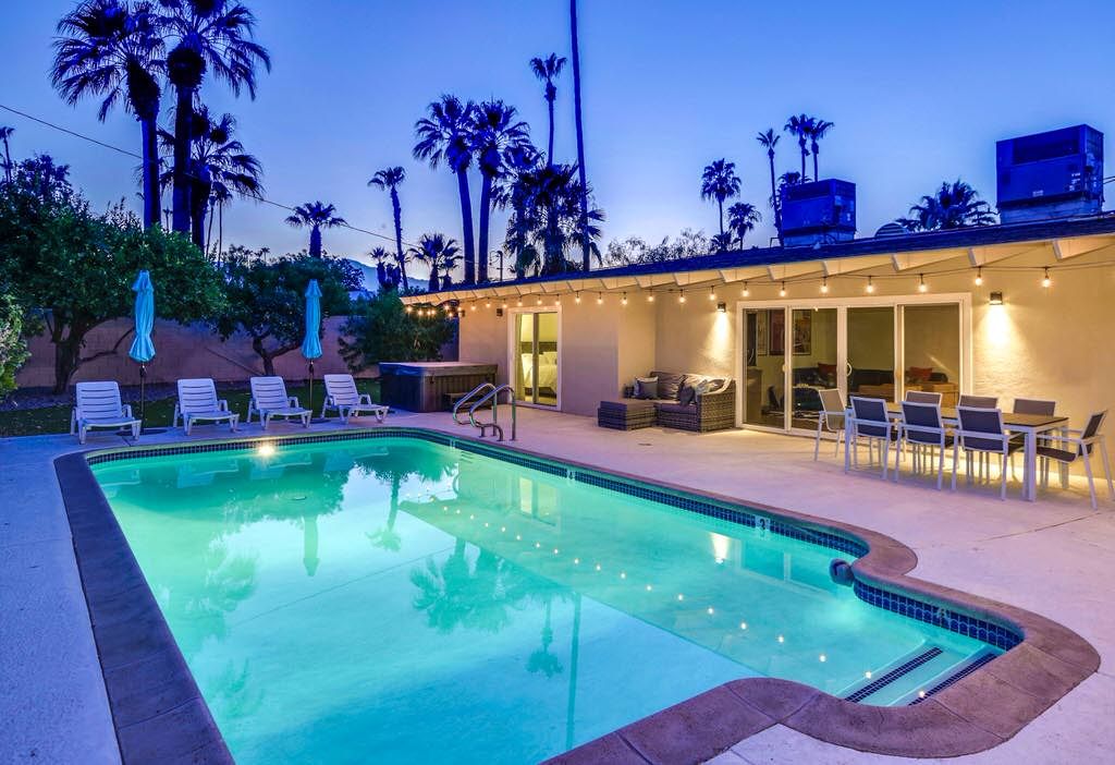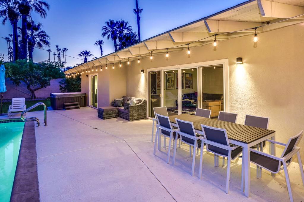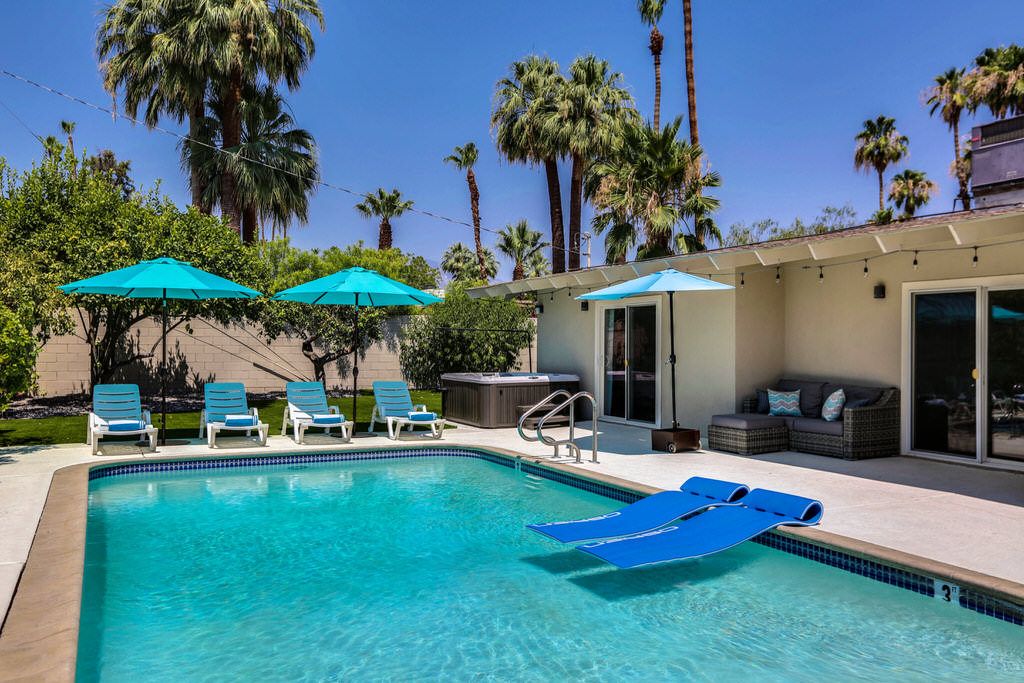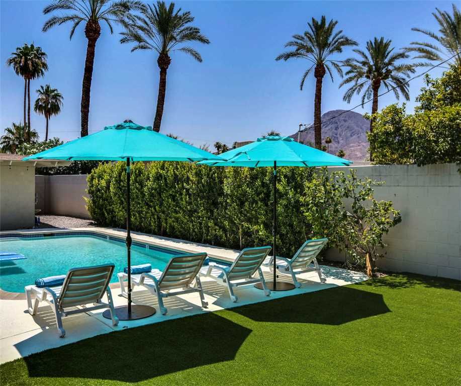The outdoor living area of this Palm Desert pool home for rent invites you to take a dip in the sparkling blue pool or soak in the sun while you relax on a lounge chair.