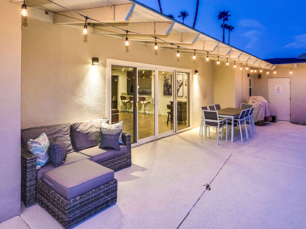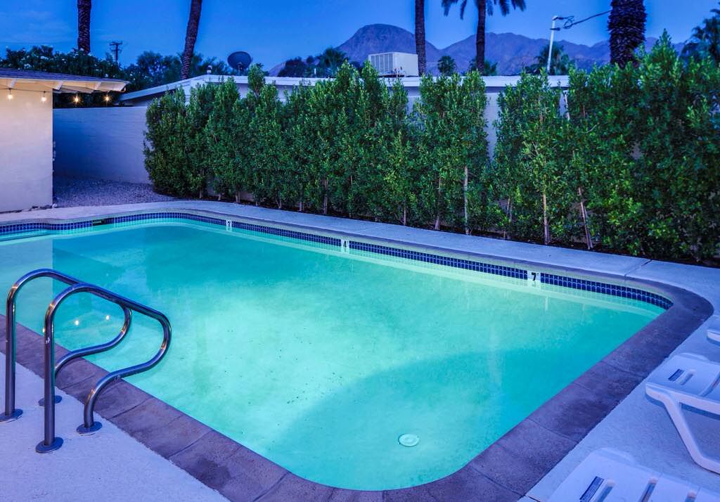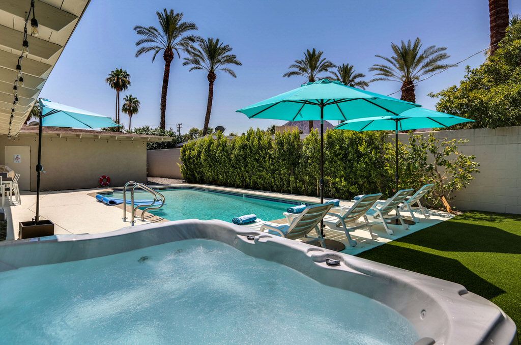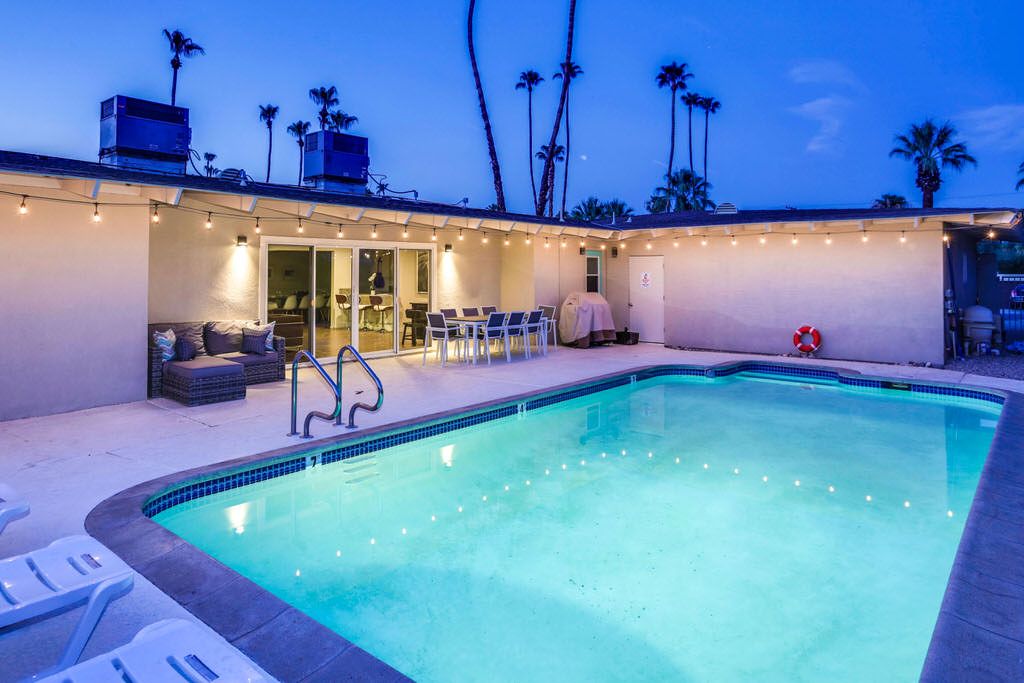The outdoor living area of this Palm Desert pool home for rent invites you to take a dip in the sparkling blue pool or soak in the sun while you relax on a lounge chair.