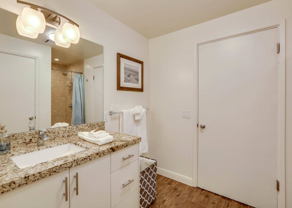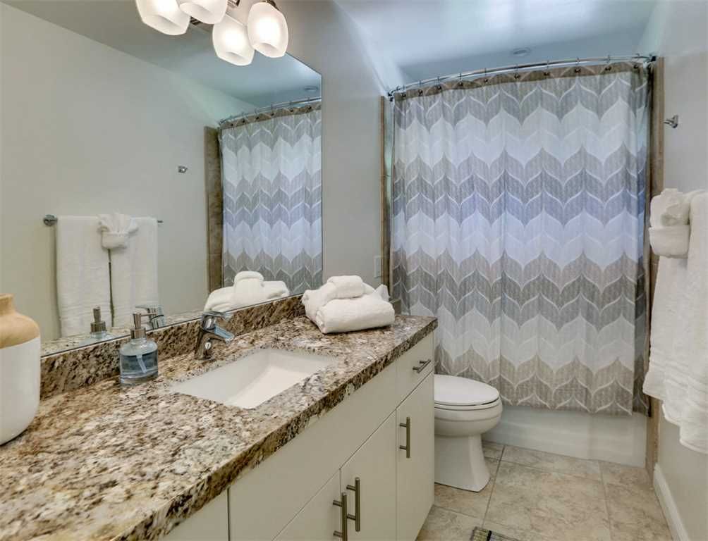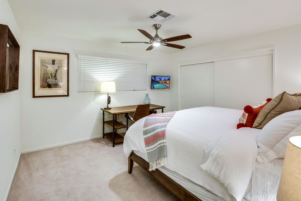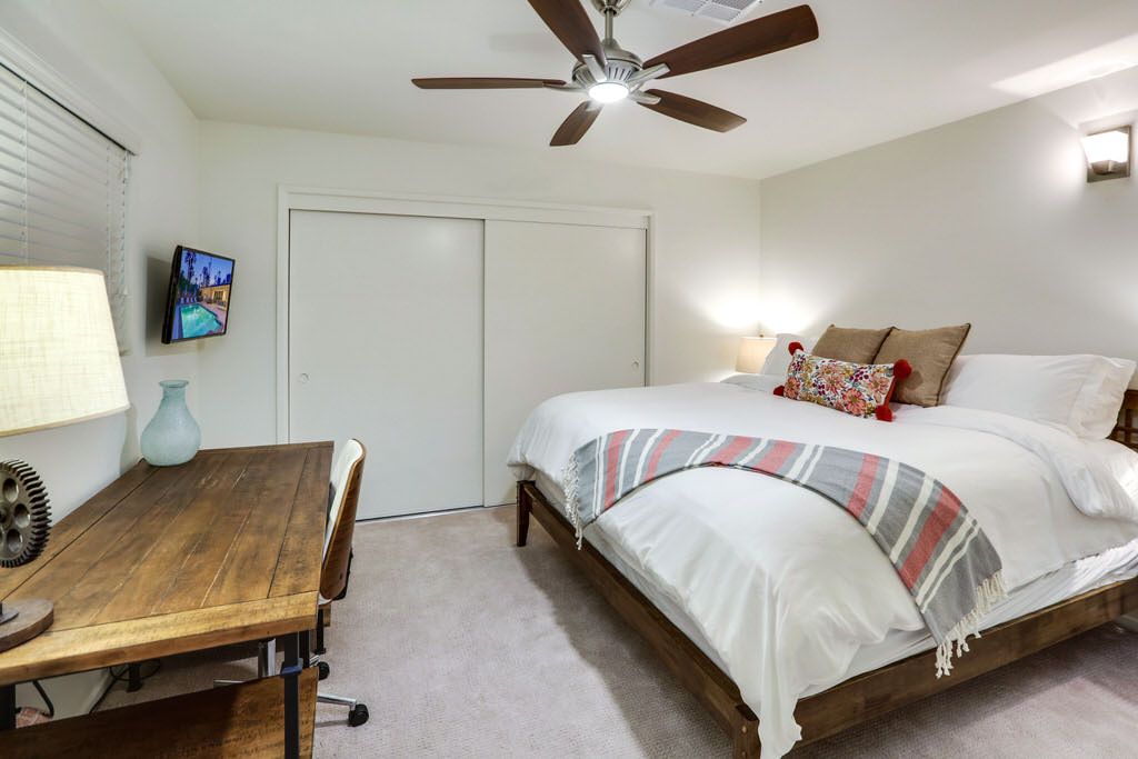 The second guest bedroom features a king size bed, desk area for working, a 32 inch HDTV, and a ceiling fan. Both of these guests' bedrooms share a hallway bathroom that has a shower/tub combo.