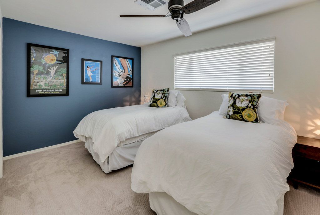 There are two more well-appointed bedrooms on this wing. The first guest bedroom features two twin beds, these beds can also be converted over to make a king size bed (please inform the reservations member when booking if you desire a king size bed to be made up), and a ceiling fan.