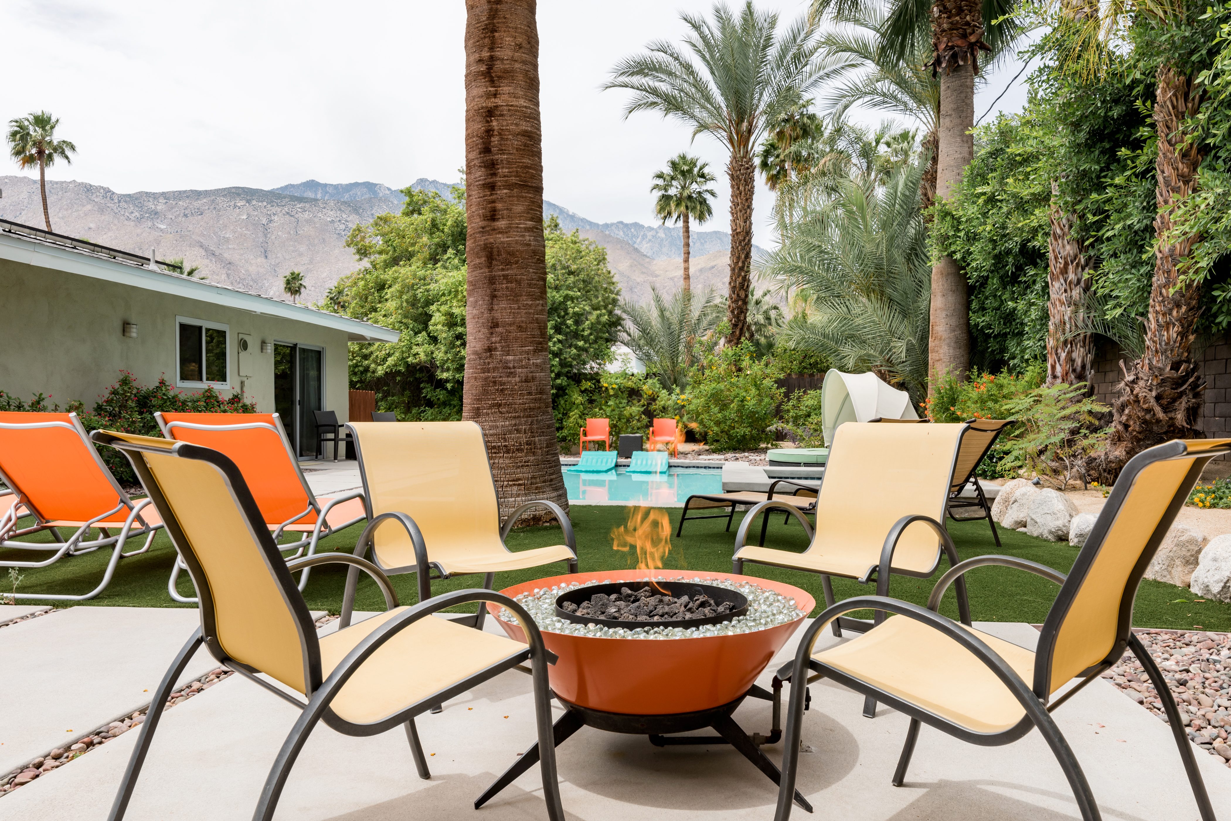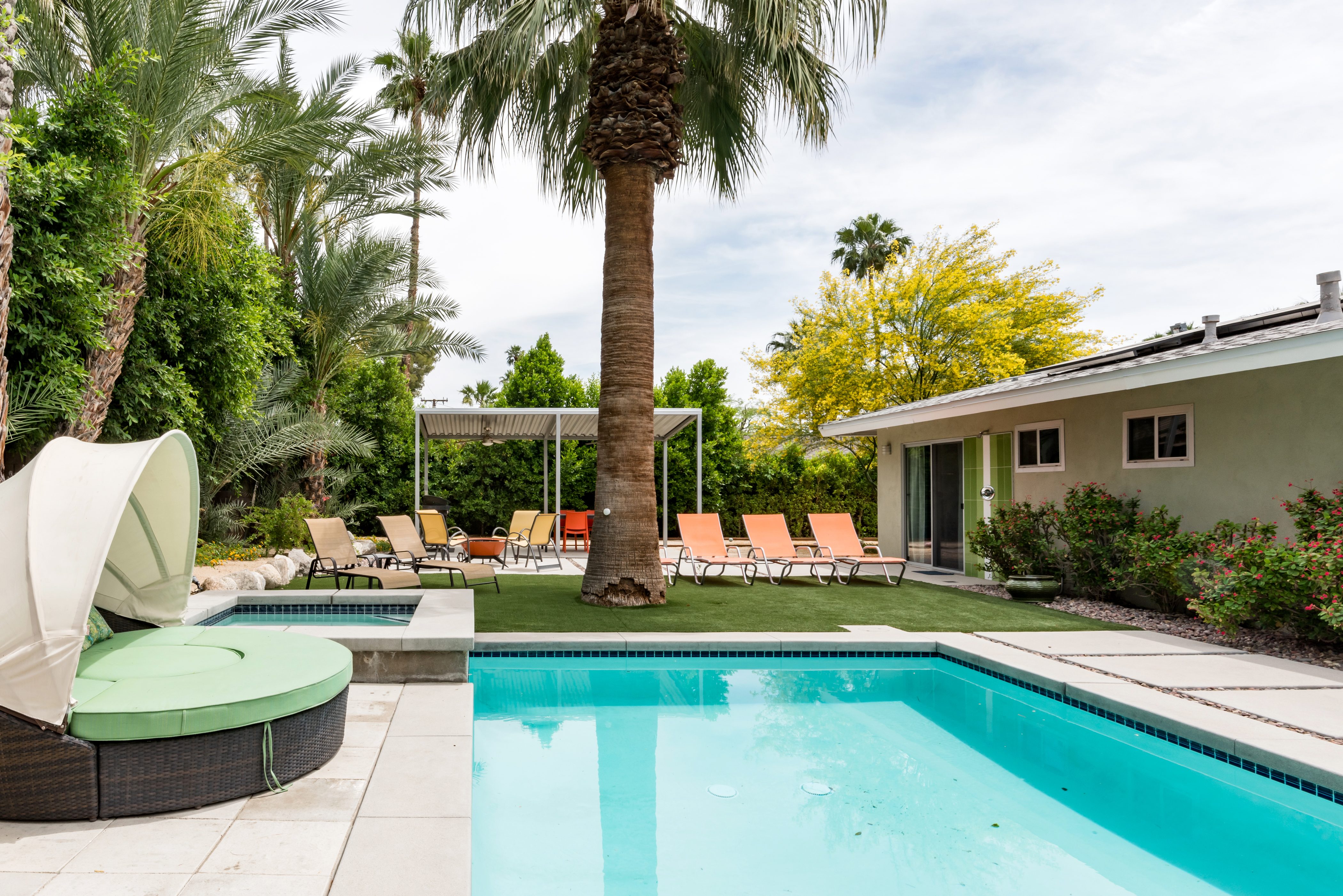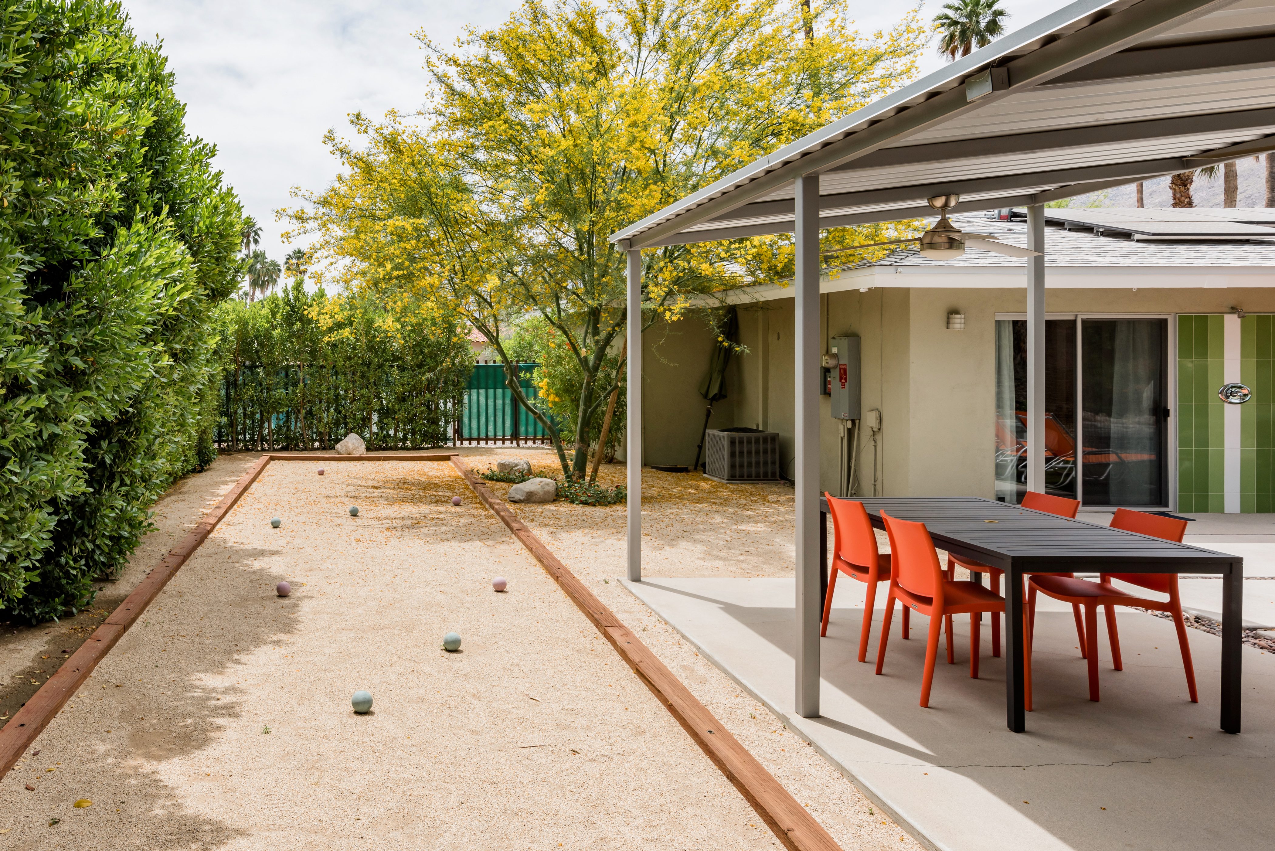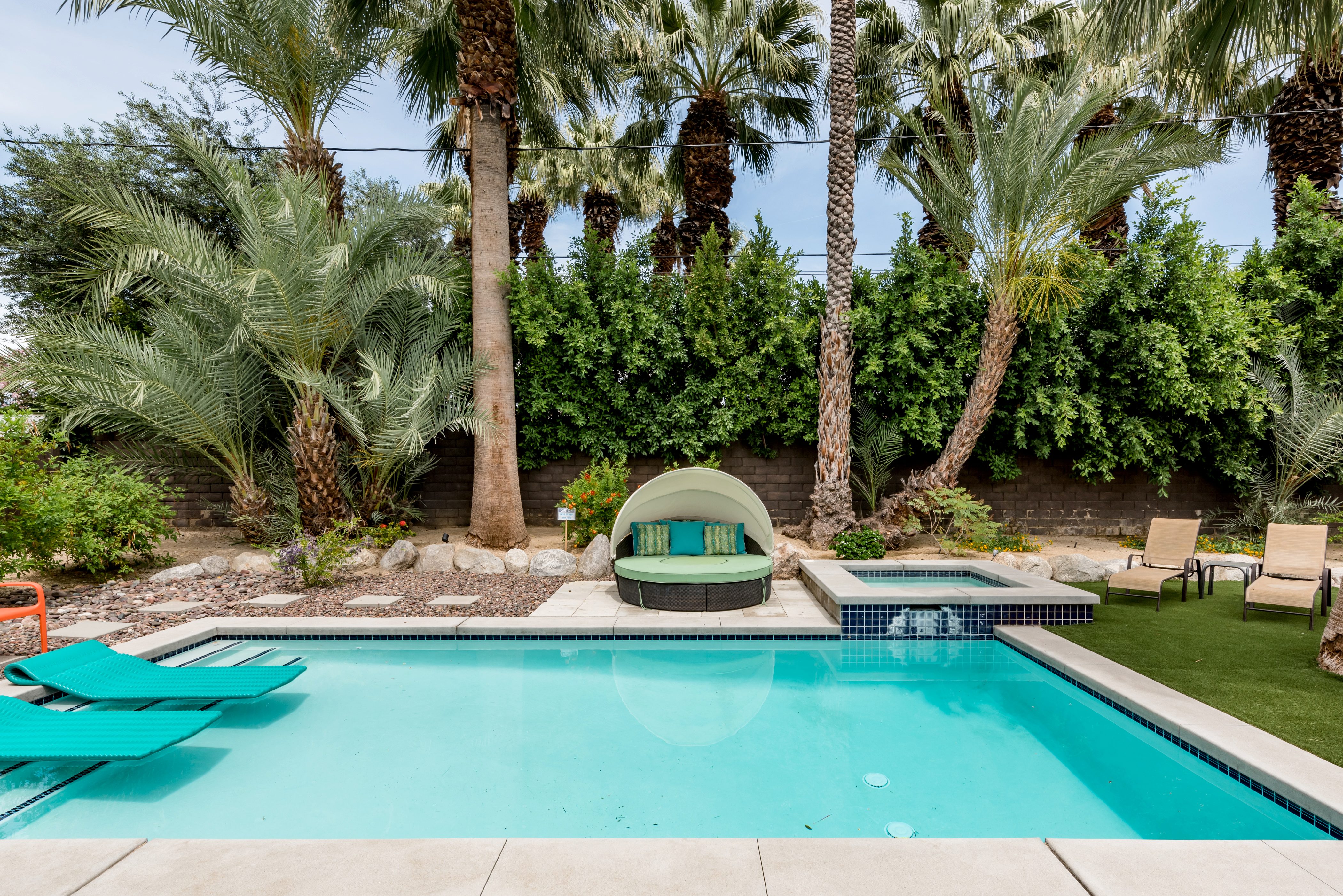P.S. City ID #1174 Primary renter must be at least 25 years old Top-to-bottom mid-mod remodel. All about outdoors w/privacy fenced rear yard. Gorgeous mountain views w/private pool w/waterfall feature, hot tub, sun loungers, covered alfresco dining space w/grill, fire feature and boccie. Even a hammock for mid-day nap! Indoors, find a bright and cheerful open layout w/fun colors and relaxed vibe. Kitchen offers SS appliances and quartz counters. MBR suite w/king bed, private bath and access to pool area. Guest bedroom w/king bed, hall bath access. Close to Ruth Hardy Park, Palm Canyon Dr.Amenities