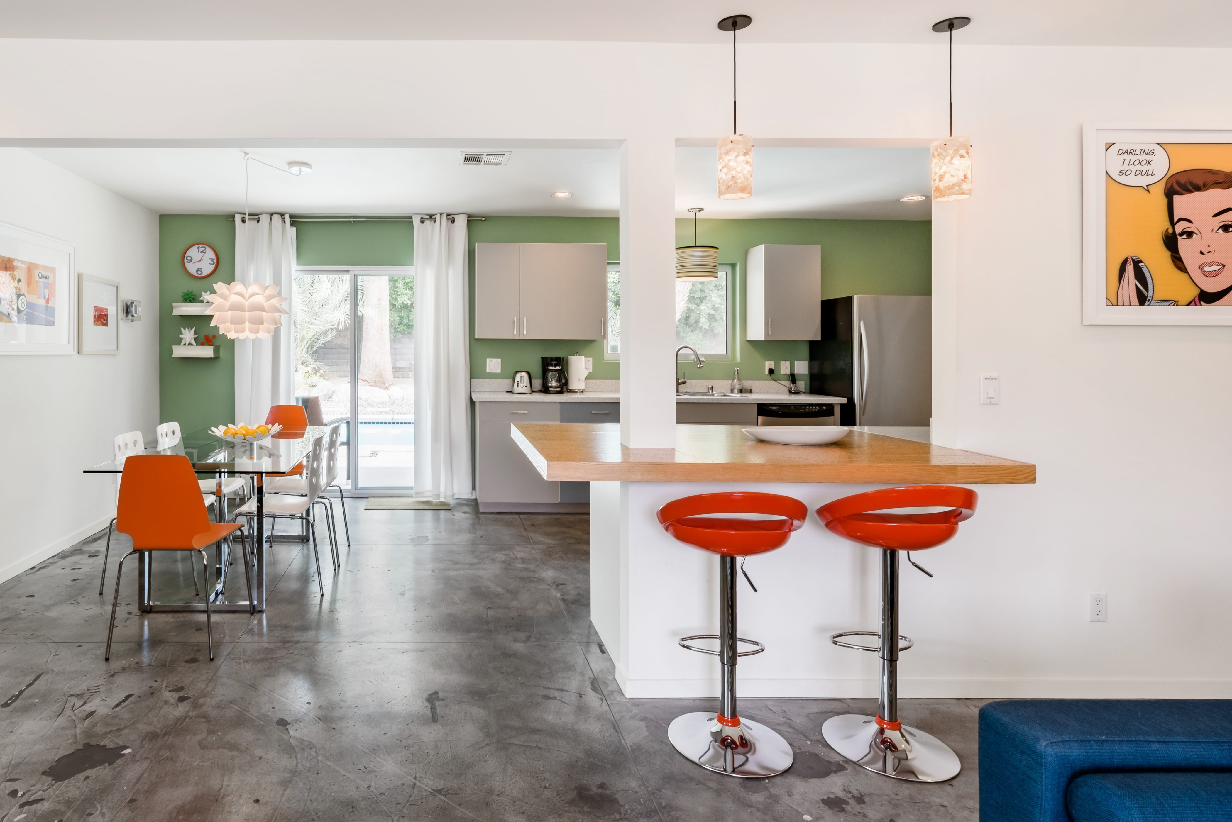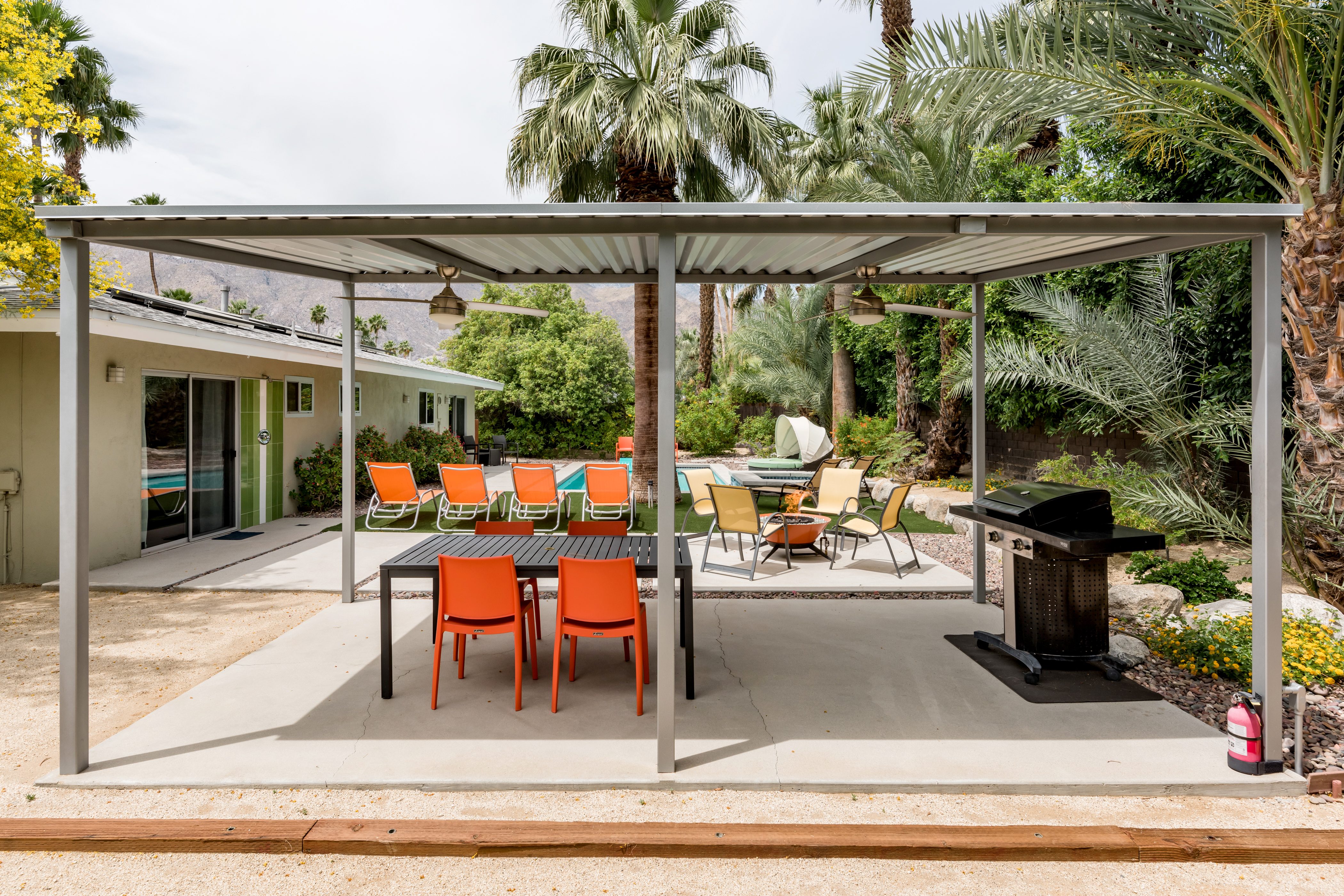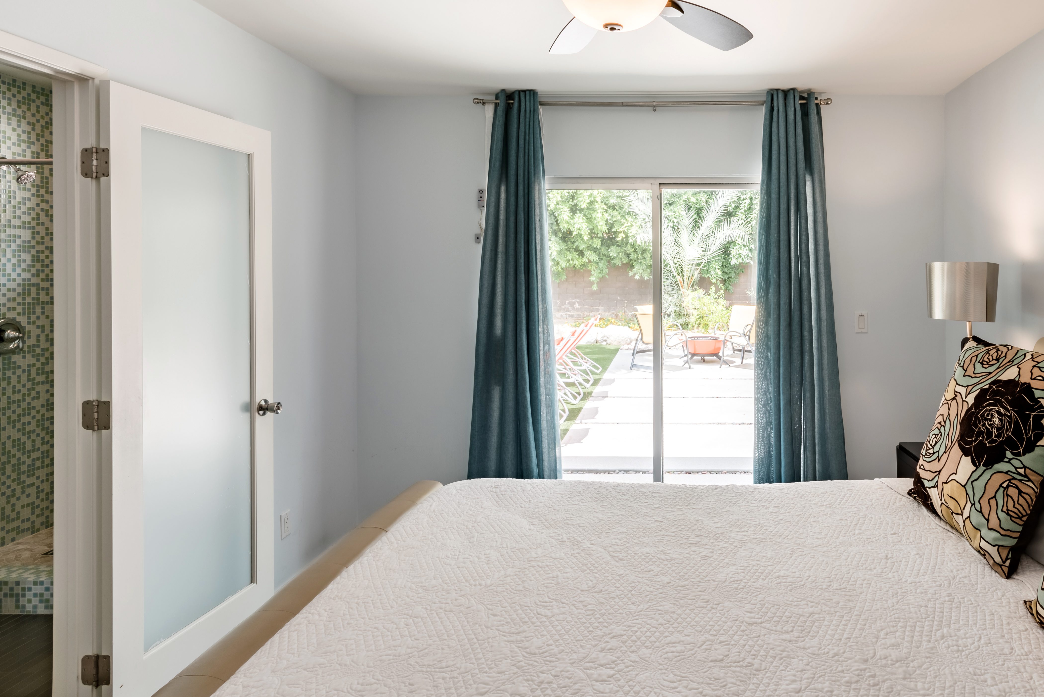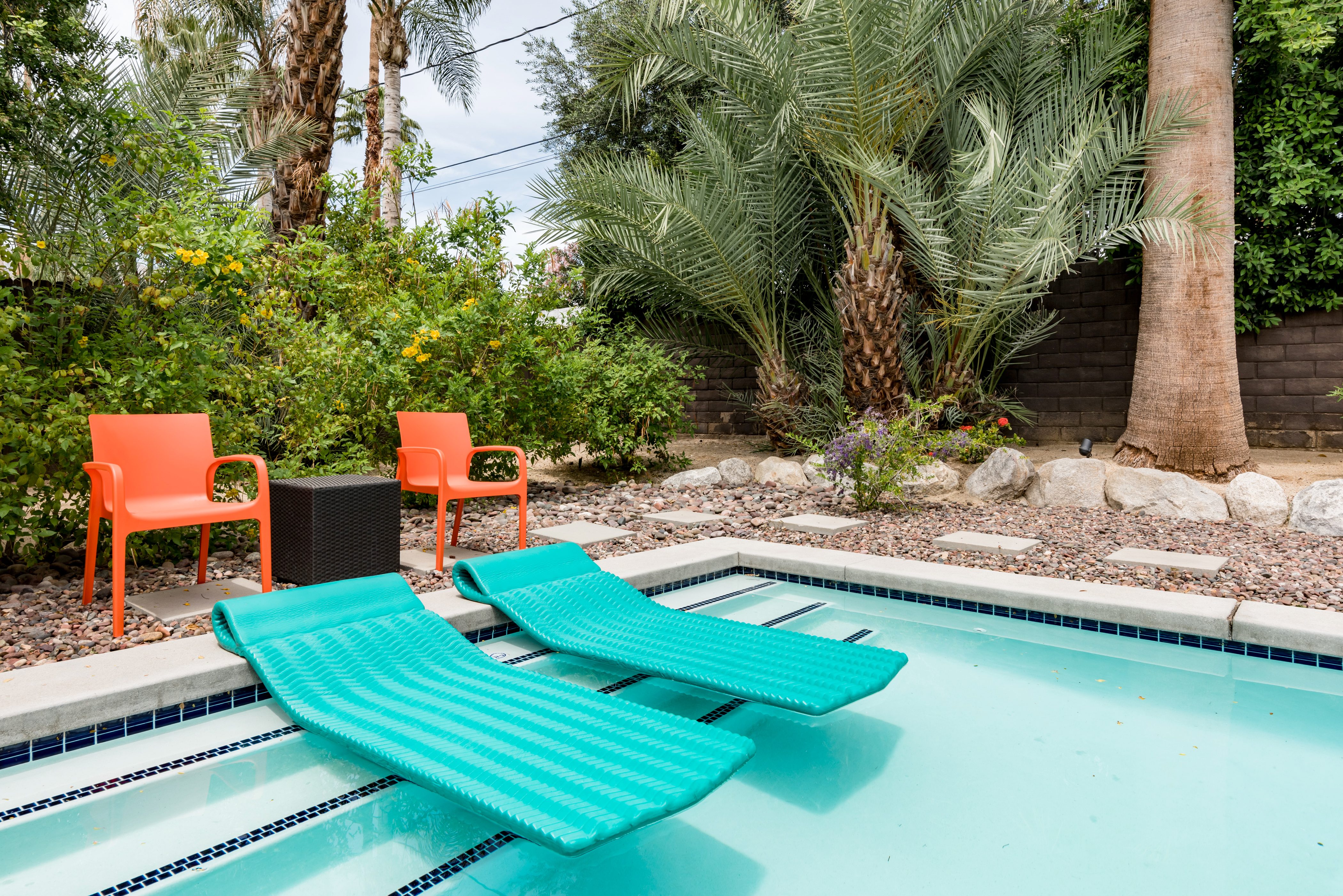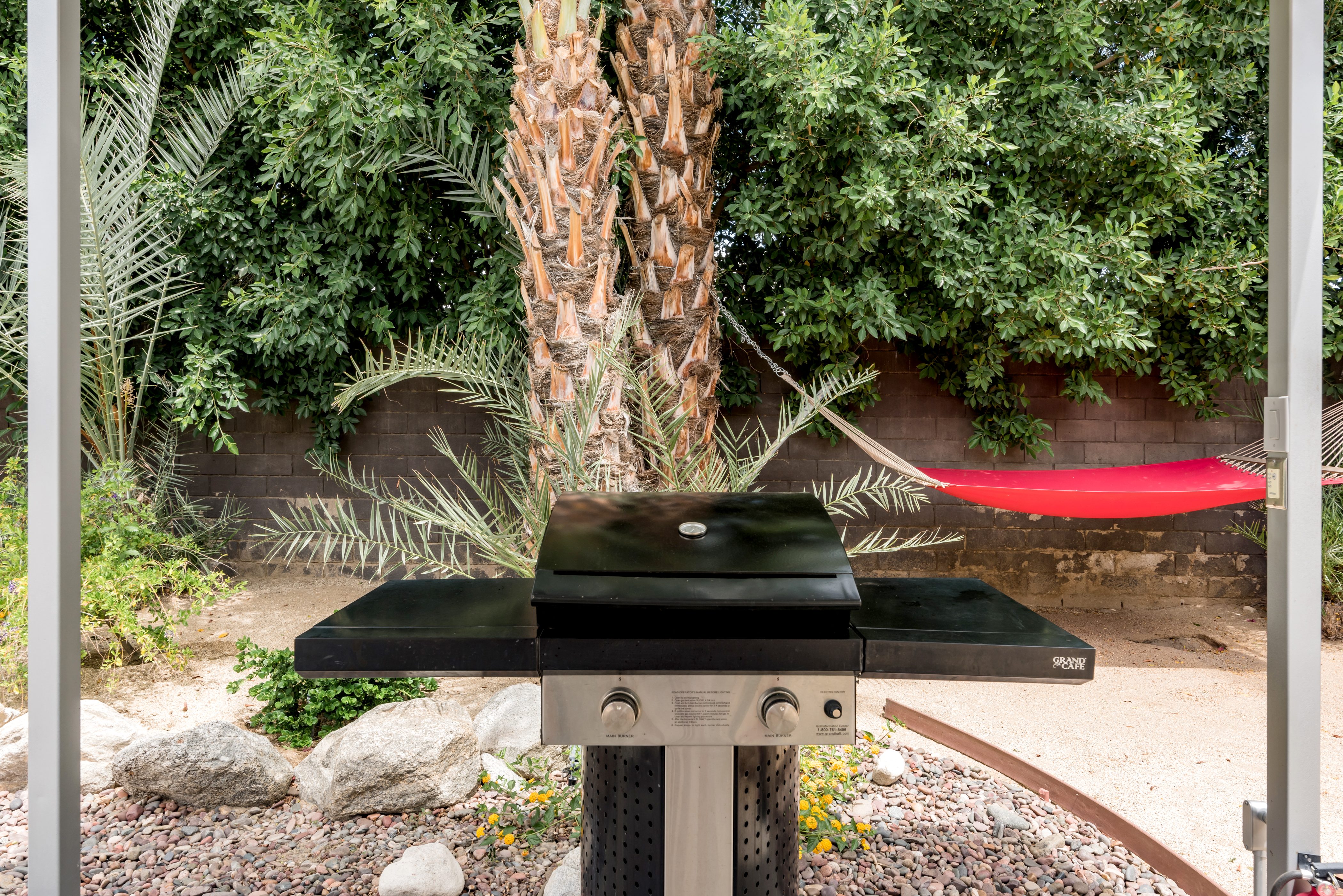 P.S. City ID #1174 Primary renter must be at least 25 years old Top-to-bottom mid-mod remodel. All about outdoors w/privacy fenced rear yard. Gorgeous mountain views w/private pool w/waterfall feature, hot tub, sun loungers, covered alfresco dining space w/grill, fire feature and boccie. Even a hammock for mid-day nap! Indoors, find a bright and cheerful open layout w/fun colors and relaxed vibe. Kitchen offers SS appliances and quartz counters. MBR suite w/king bed, private bath and access to pool area. Guest bedroom w/king bed, hall bath access. Close to Ruth Hardy Park, Palm Canyon Dr.Amenities