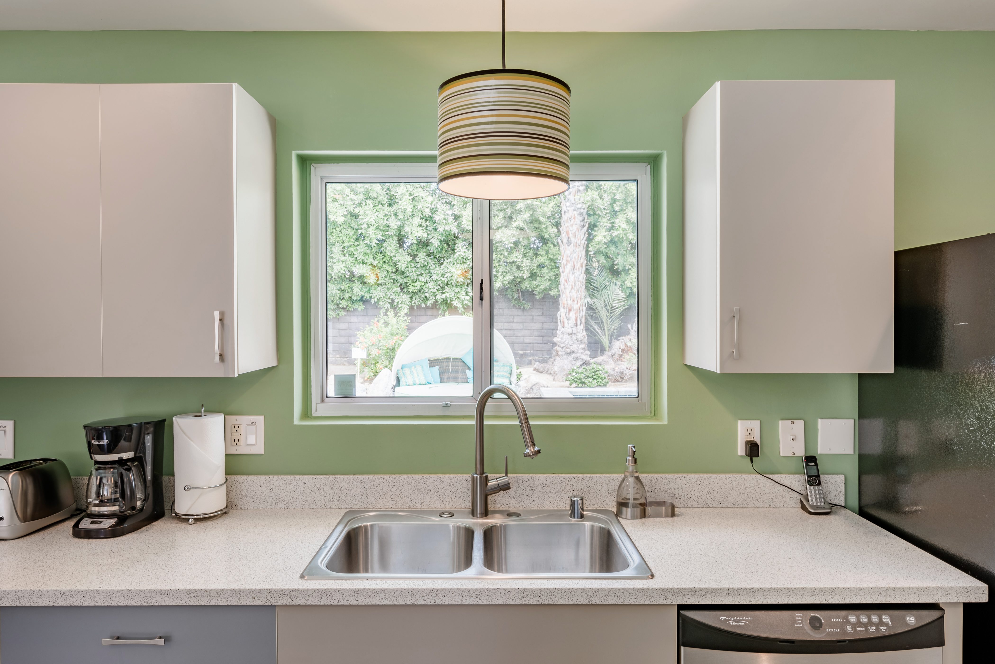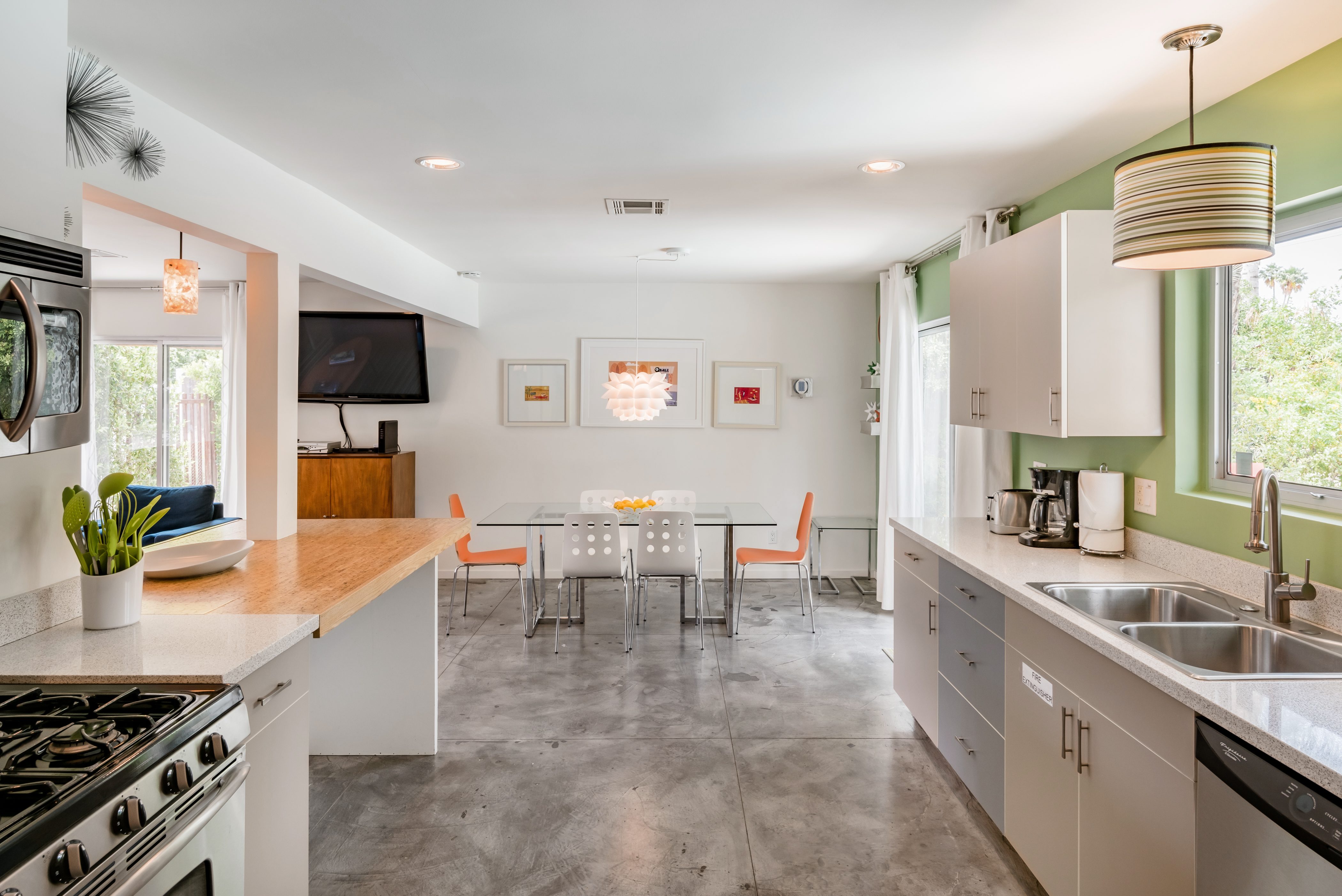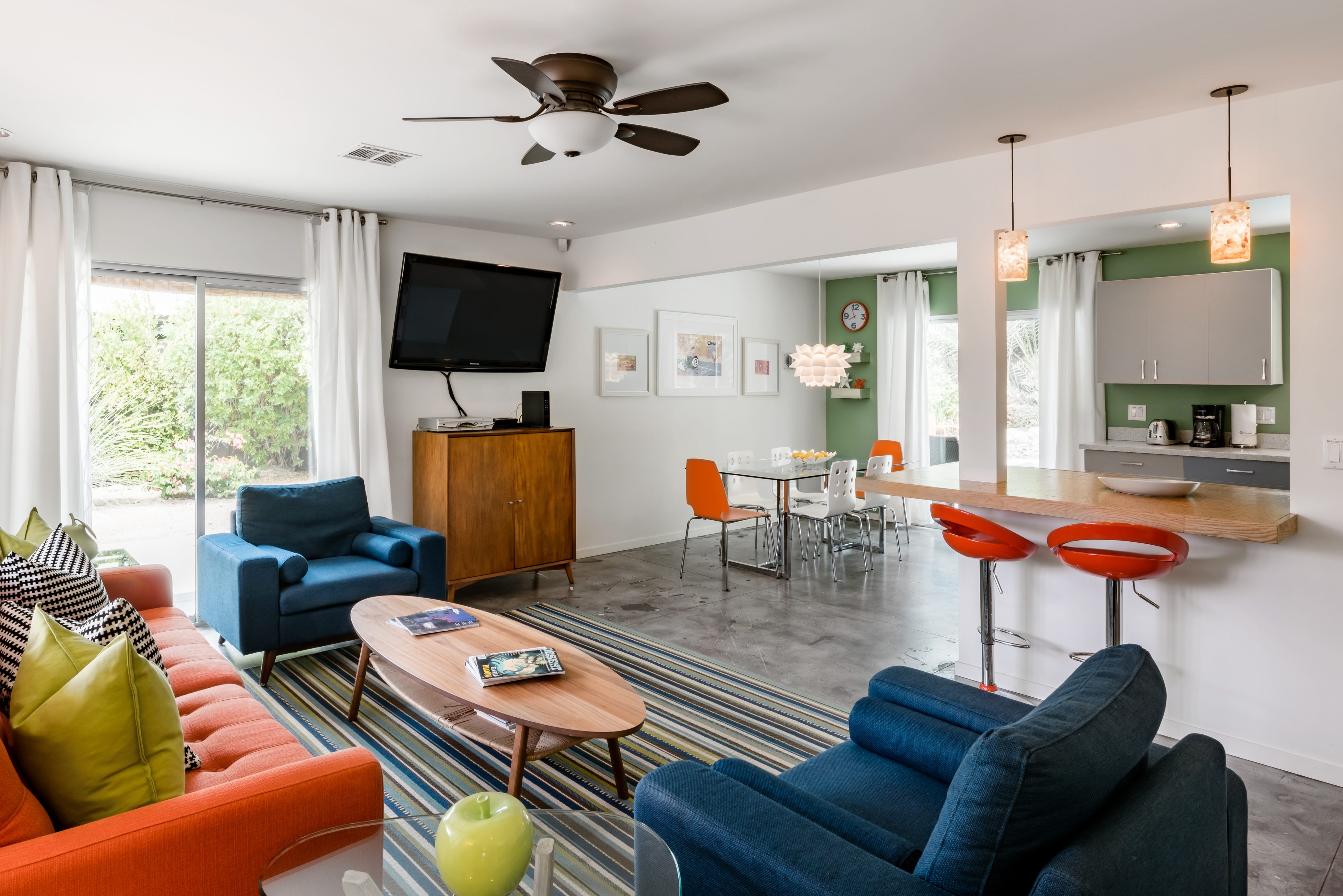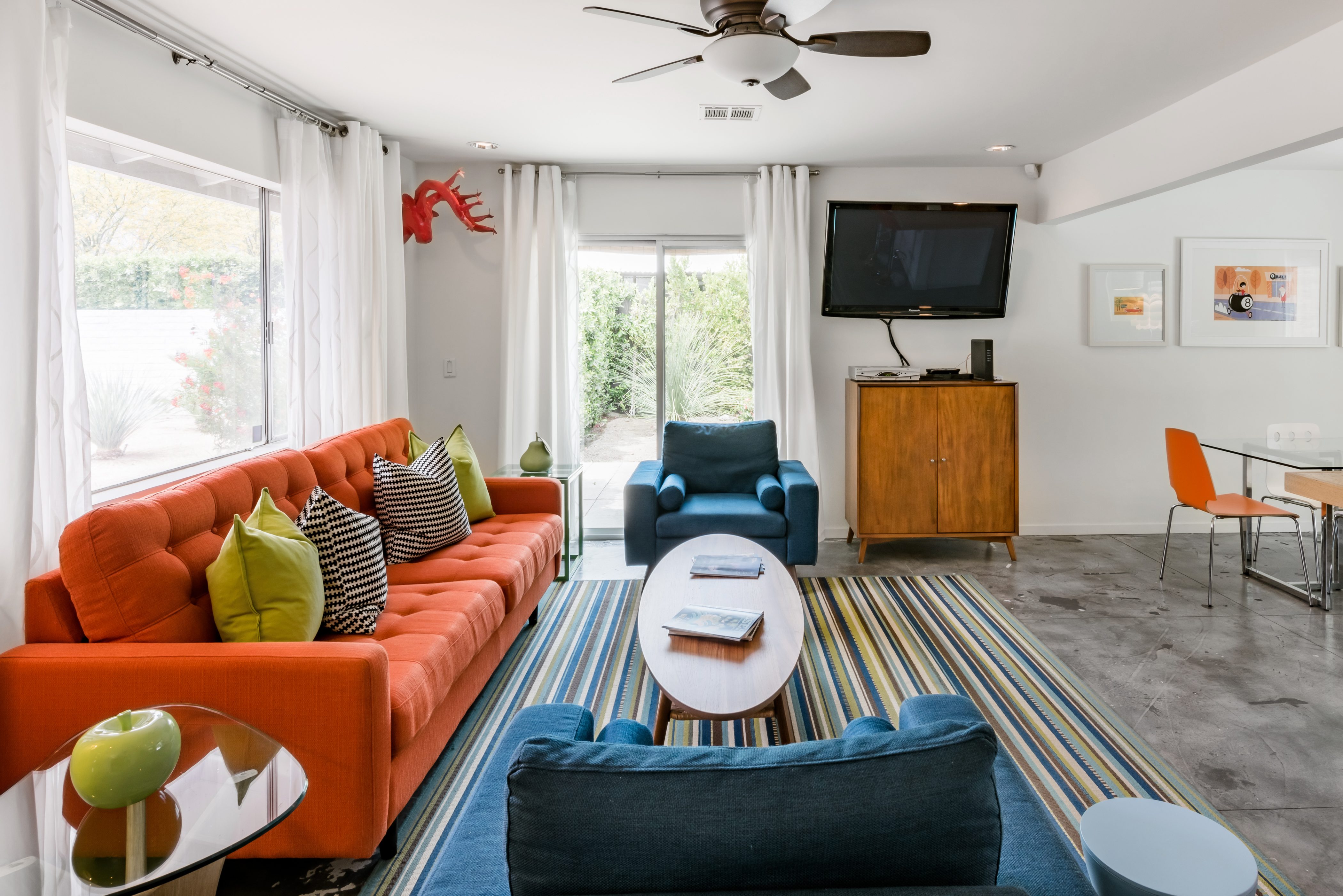 P.S. City ID #1174 Primary renter must be at least 25 years old Top-to-bottom mid-mod remodel. All about outdoors w/privacy fenced rear yard. Gorgeous mountain views w/private pool w/waterfall feature, hot tub, sun loungers, covered alfresco dining space w/grill, fire feature and boccie. Even a hammock for mid-day nap! Indoors, find a bright and cheerful open layout w/fun colors and relaxed vibe. Kitchen offers SS appliances and quartz counters. MBR suite w/king bed, private bath and access to pool area. Guest bedroom w/king bed, hall bath access. Close to Ruth Hardy Park, Palm Canyon Dr.Amenities