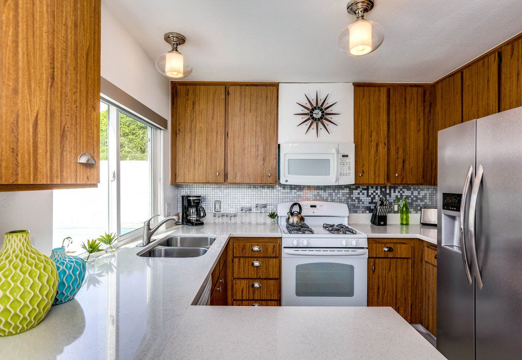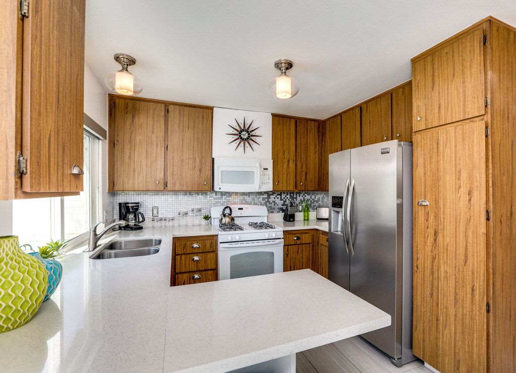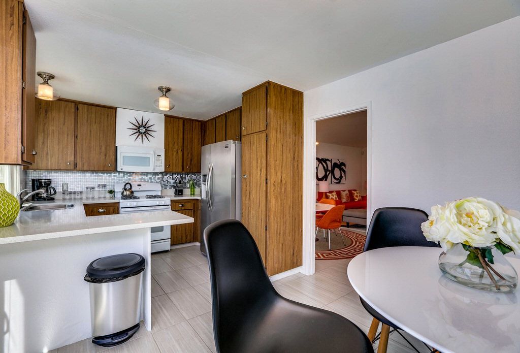 The well-equipped kitchen is beautifully renovated with gleaming white quartz counter-tops, rich wood cabinets, and white appliances. Appliances include a gas range and a dishwasher for easy cleanup. A two person peninsula provides ample social space and makes preparing meals convenient.