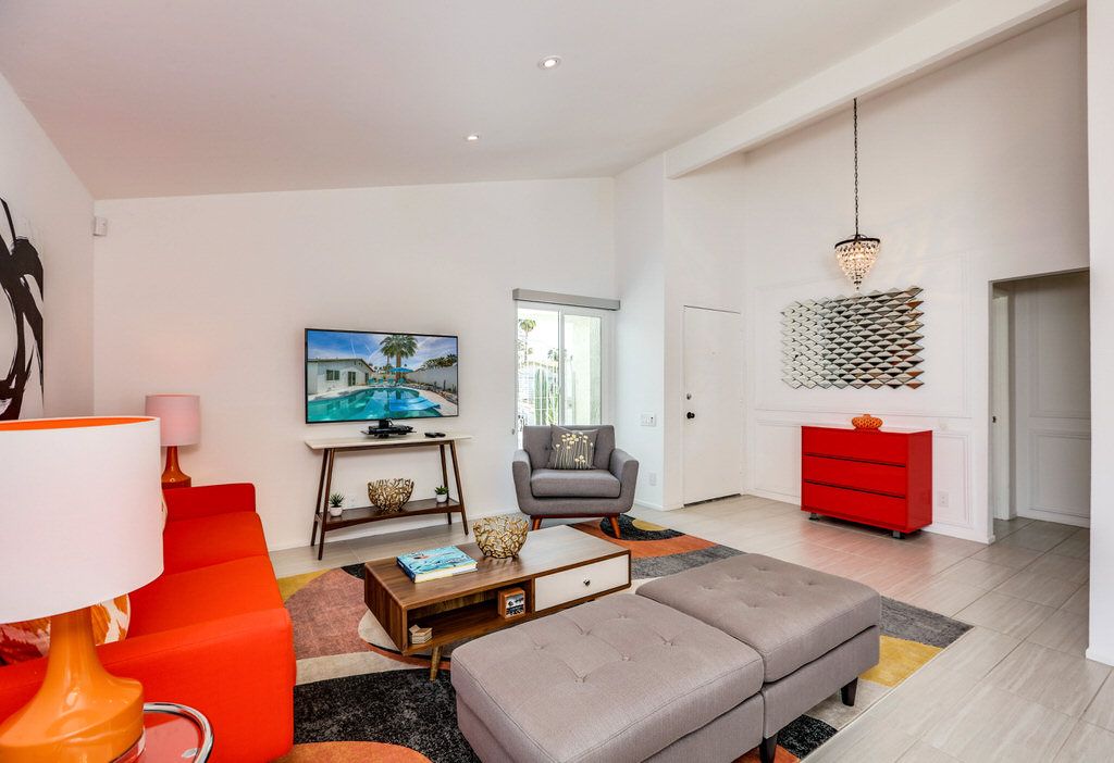 The upscale living space features porcelain tile floors and midcentury inspired furniture. The living area is the social heart of the house, creating a communal atmosphere that is perfect for entertaining and relaxing. Also included is a large HDTV for watching your favorite shows or movies.
