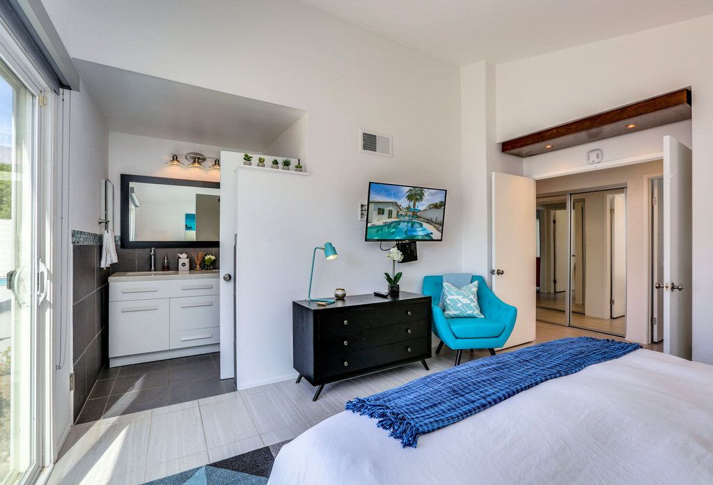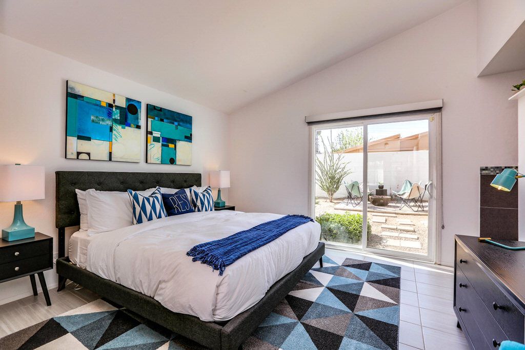 The sunlit master bedroom features a king-size bed, 40” flat screen TV with cable, and views of the backyard oasis. The remodeled en-suite master bathroom provides a walk-in shower.