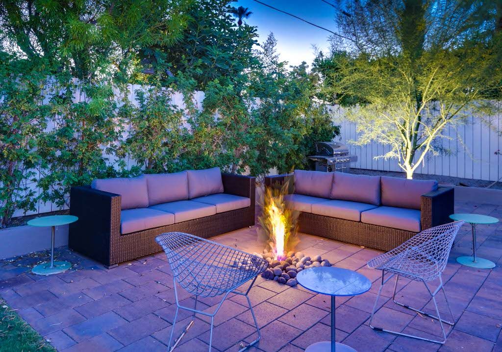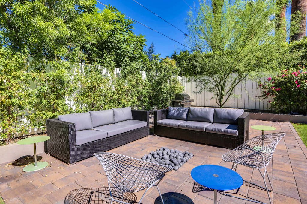Enjoy the gorgeous large private backyard with lush green grass and tons of space. Also find a barbecue, outdoor dining for up to 6, 2 umbrellas, lounge chairs for 6, and various areas of outdoor seating to soak in the sun. In the evening, as the sun sets behind the San Jacinto mountains, enjoy drinks on the outdoor couches around a fire pit feature in this backyard oasis.