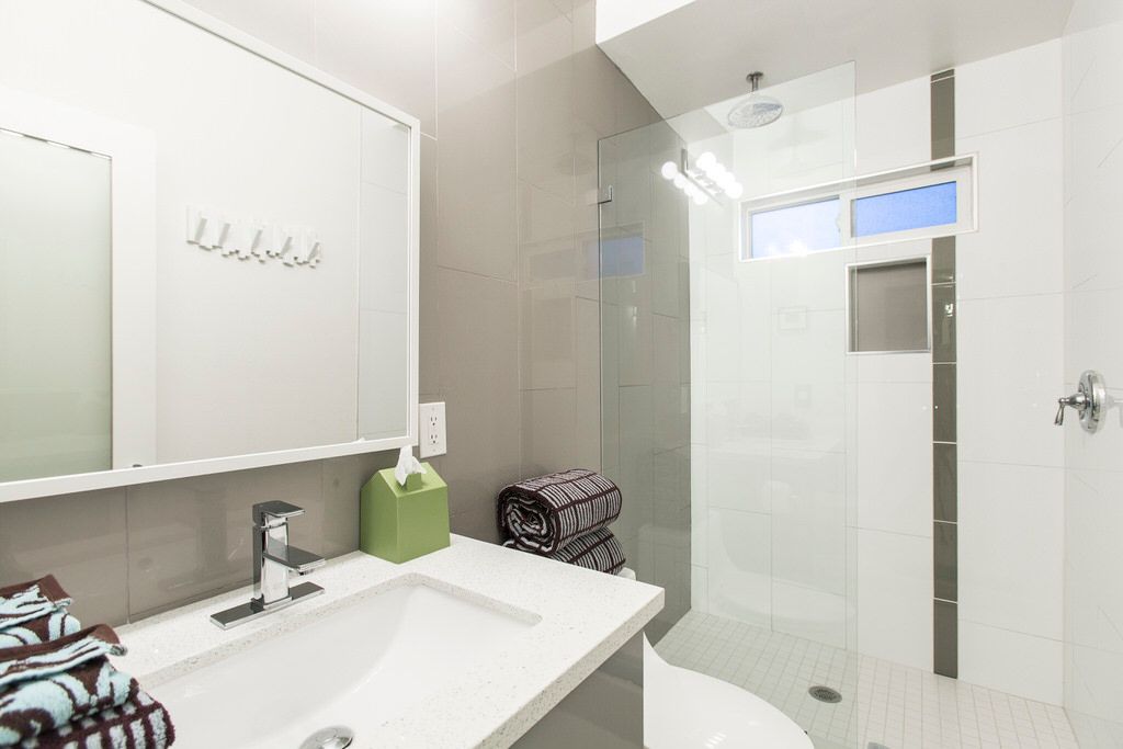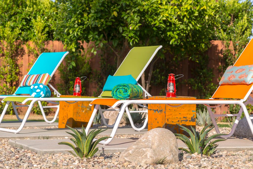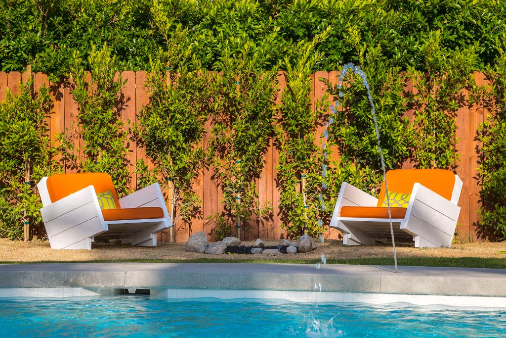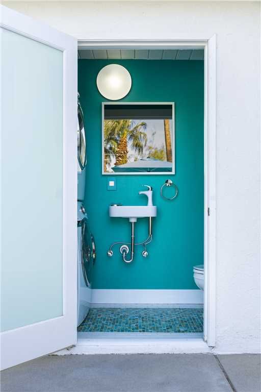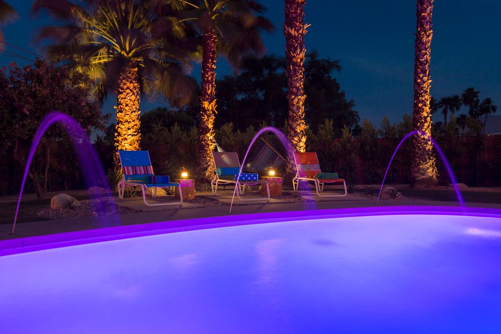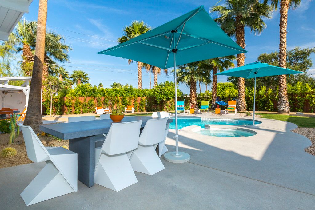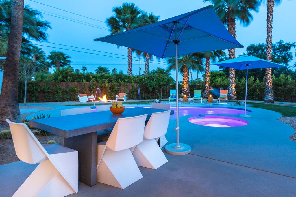 The poolside chaise lounges are separated by re-purposed metal containers adorned with LED Coleman lanterns, the best of Glamorous Camping The kidney shaped pool and spa feature multiple waterspouts and color changing LED lighting, all controlled by the homes iPad. Two concrete dining tables provide abundant seating for all guests, with portable umbrellas providing shade where desired. The poolside powder room offers a convenient poolside bath, as well as high efficiency stacked washer and dryer for guest use.