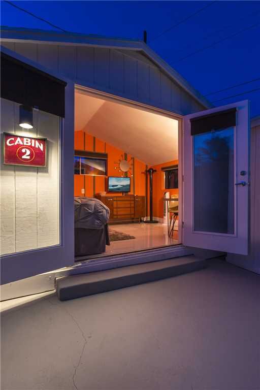 The homes common areas include a large great room, dining area and galley kitchen. French doors open into the great room, with the dining area just to the right- the open concept floor plan makes Camp 1959 ideal for entertaining guests. The great room features a HDTV and gas fireplace, with a sofa and dual armchairs providing comfortable seating for reading, conversation or TV viewing. The homes media system features a turntable with collection of vinyl, as well as iPod integration.