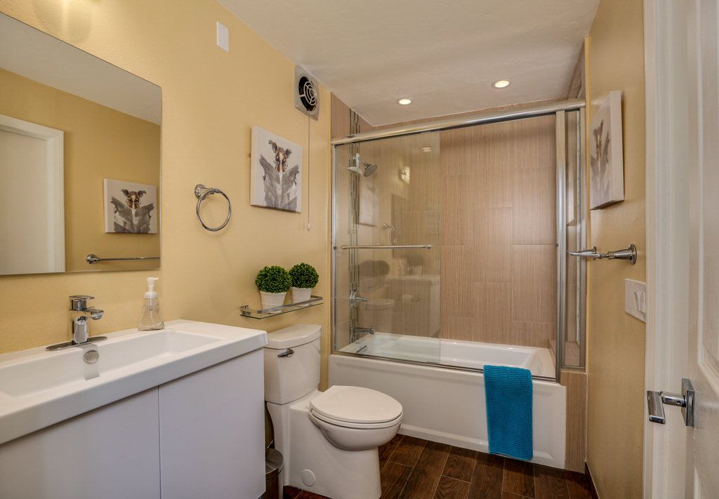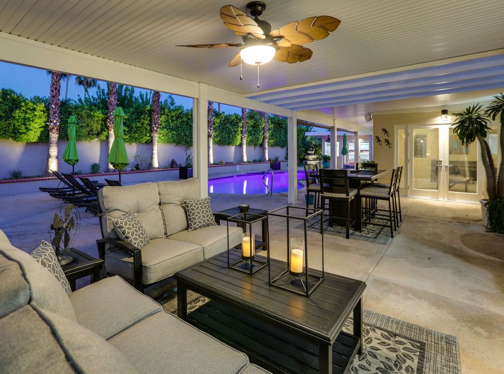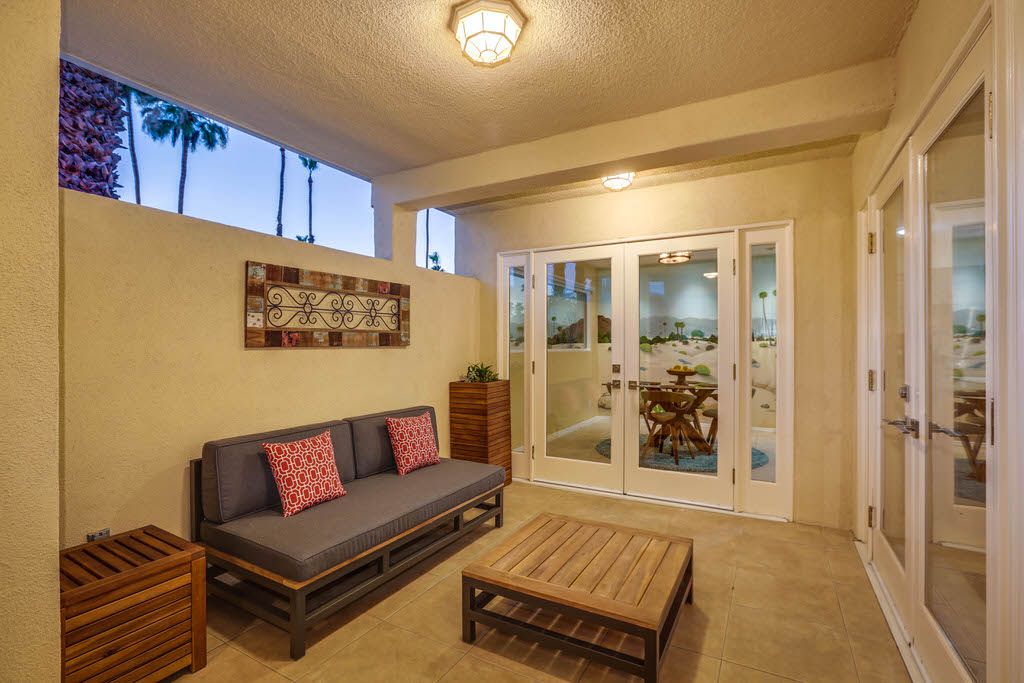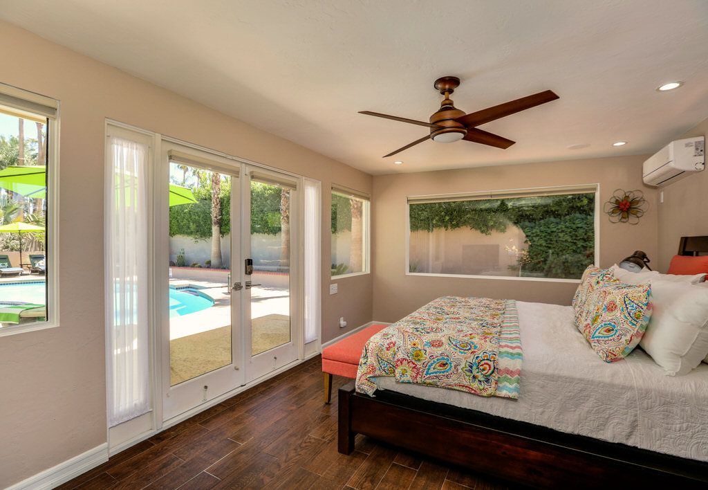 This inviting home features modern designer furniture, custom lighting, ceramic tile throughout the main living areas, bamboo flooring in the bedrooms, along with large windows and glass French doors which gives this Palm Springs vacation home an open and inviting feel.