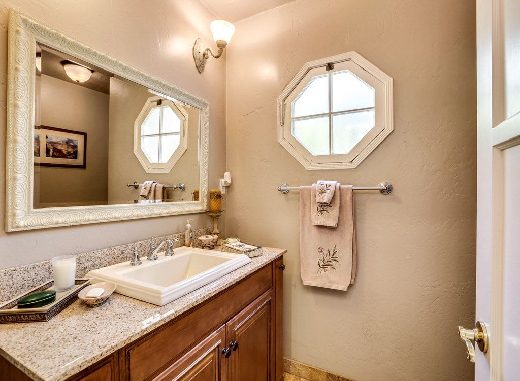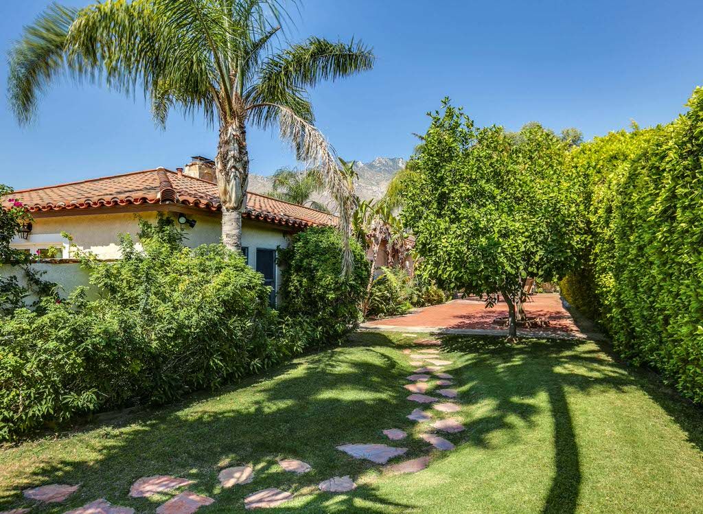 The yard has a private swimming pool outlined with a winding rock wall with spillover waterfall. The adjacent spa can seat 6, and nearby both is a gas fire pit.