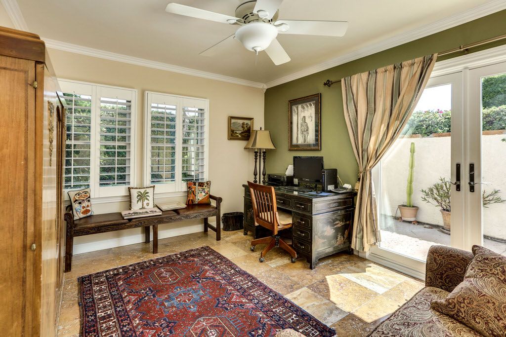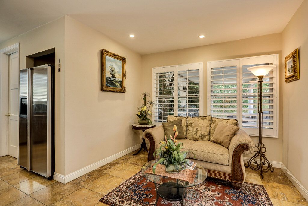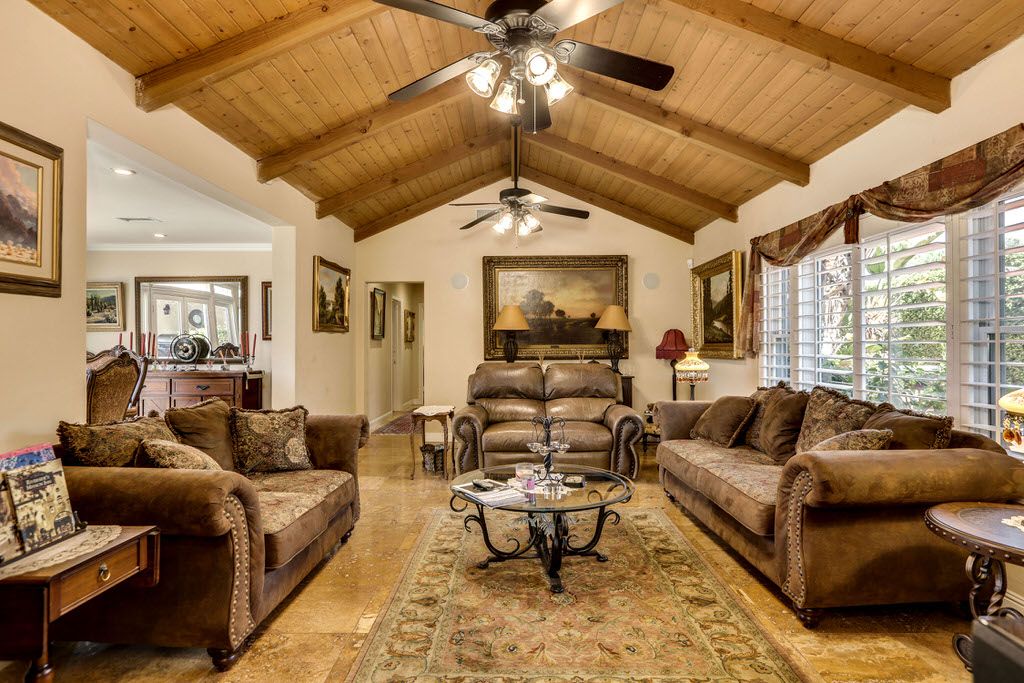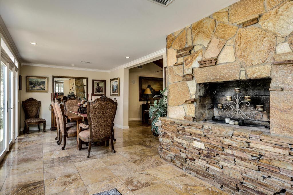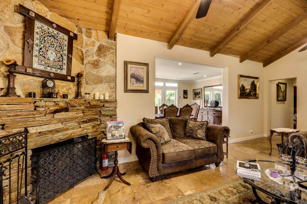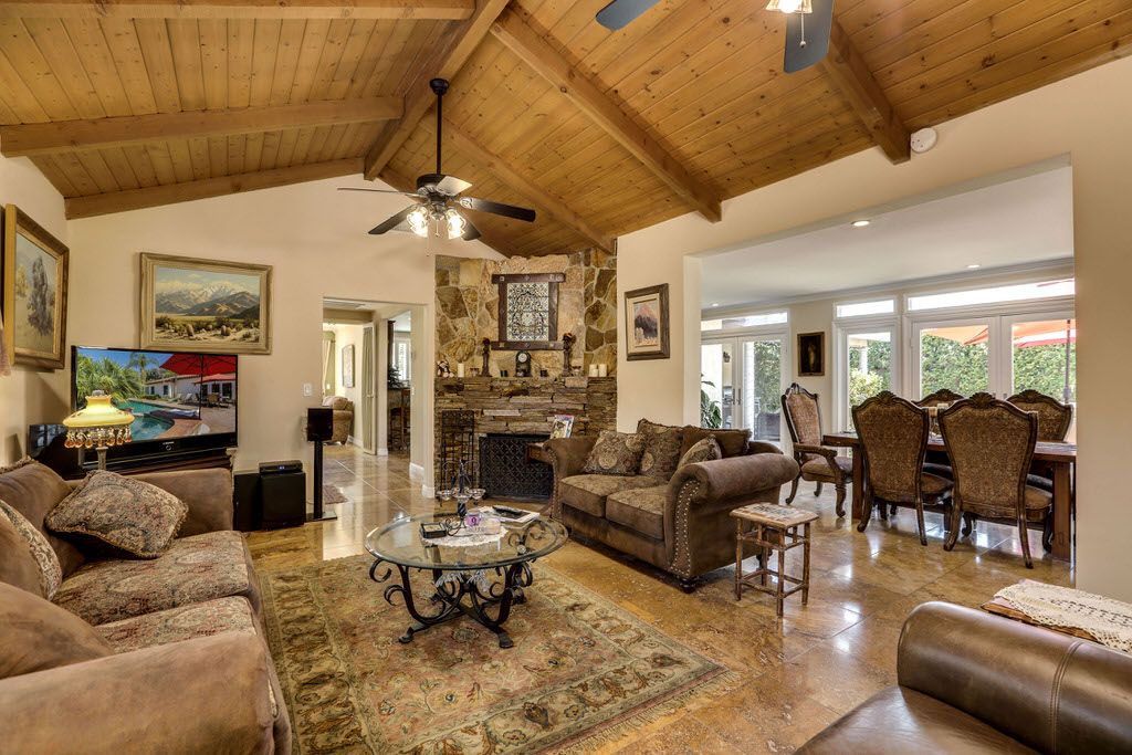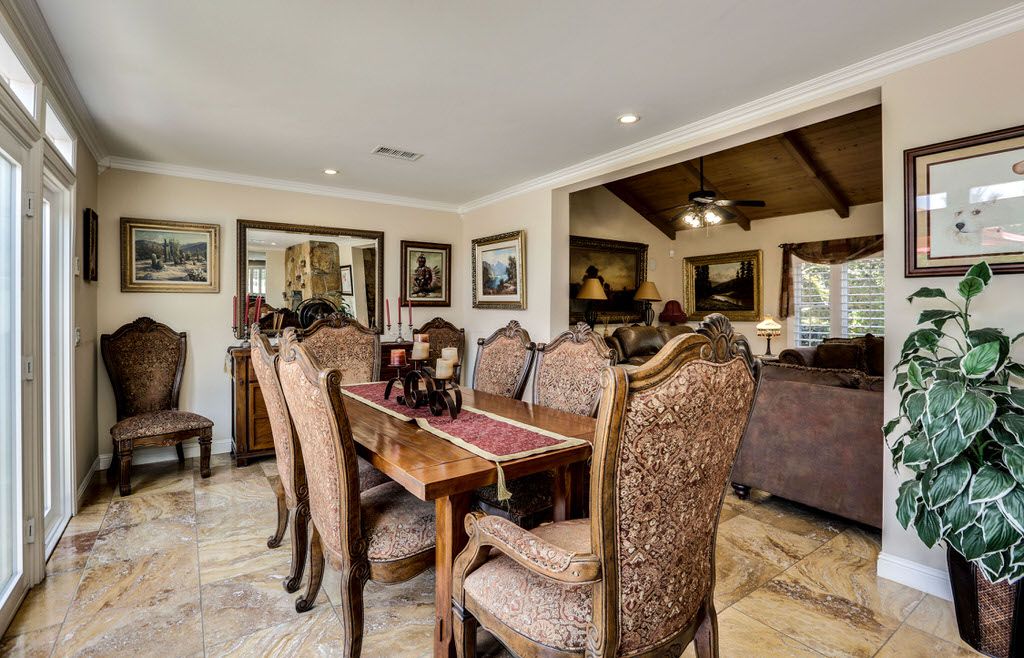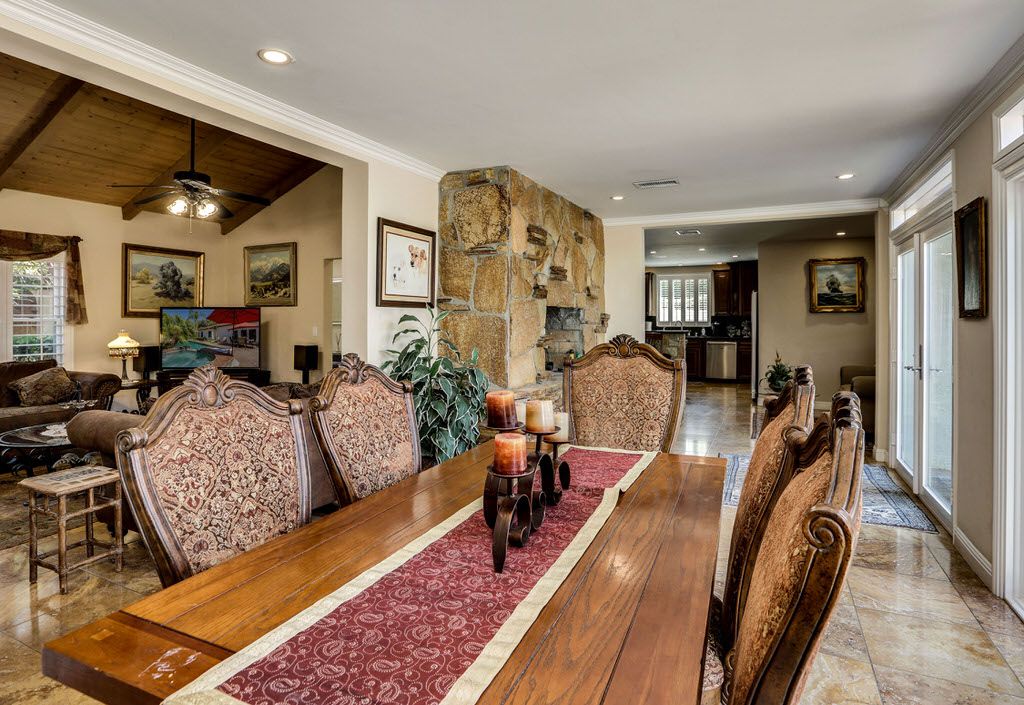 The formal living room has an exposed wood beam ceiling, a ceiling fan, gas fireplace, large windows and glass doors. Next to the living room is the formal dining room that seats six.