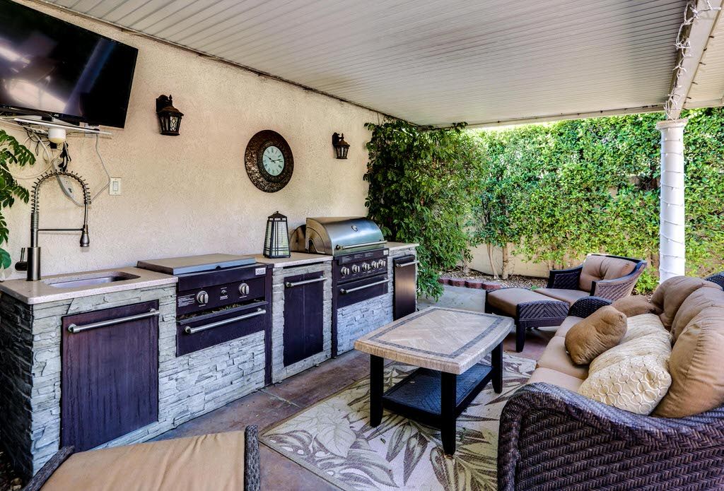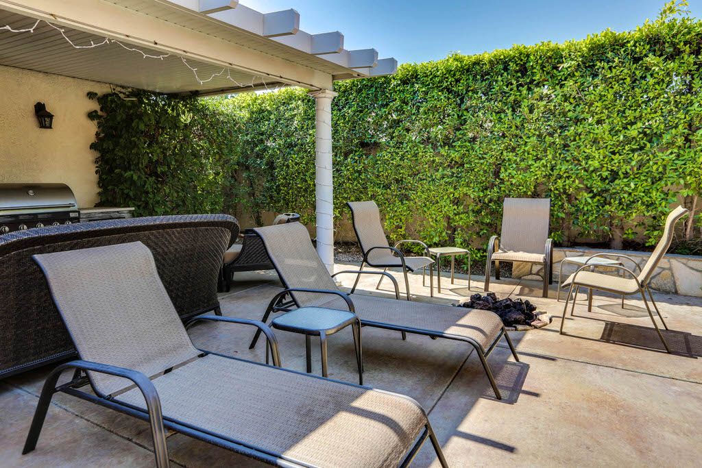 The outdoor dining area of this Palm Springs home features a large table, six chairs are next to outdoor living room area adjacent to the outdoor kitchen and BBQ grill.