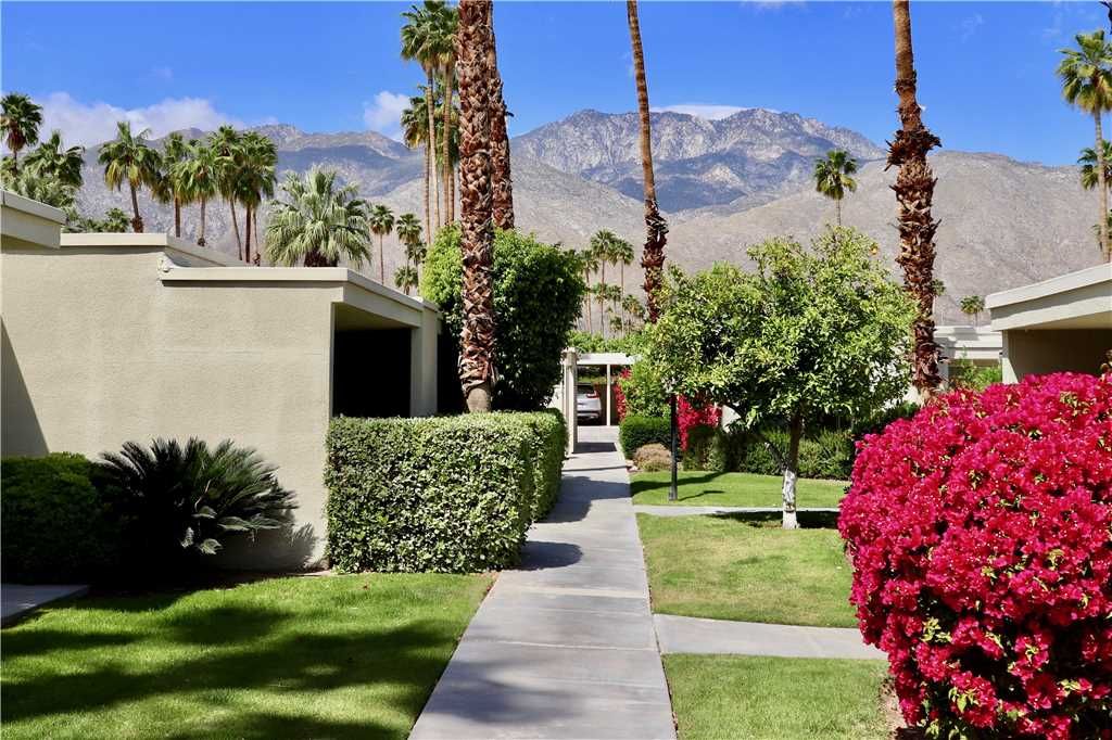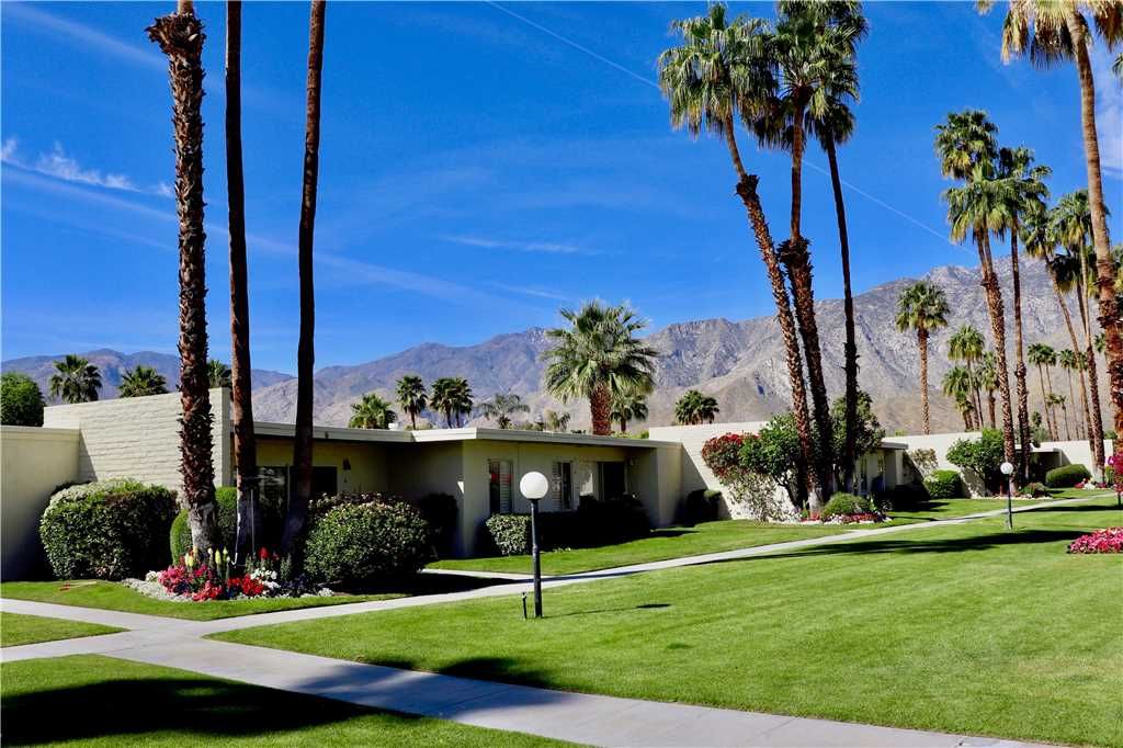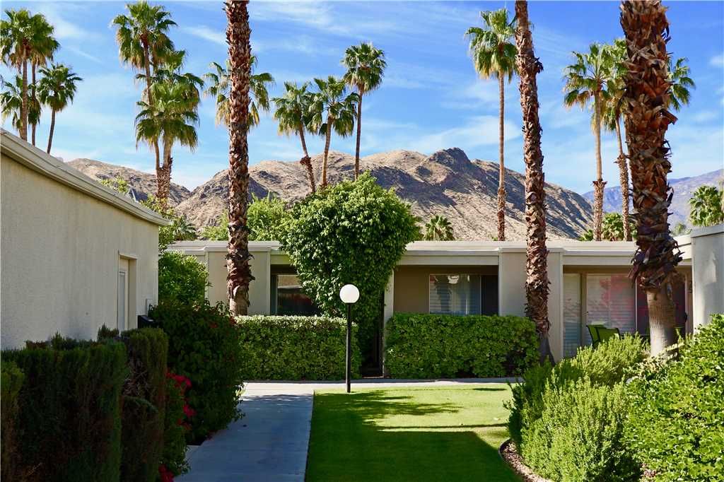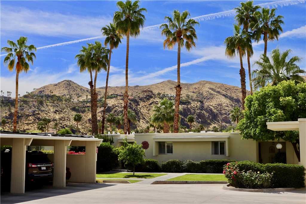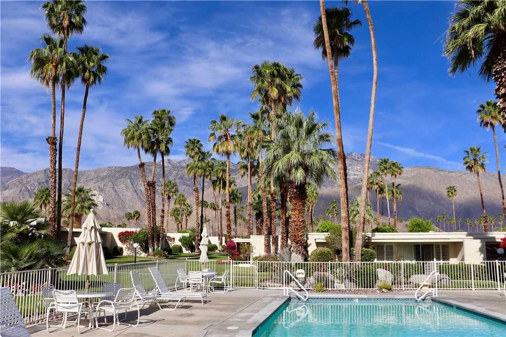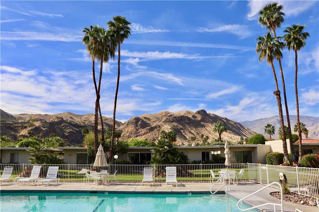 This adorable Coco Cabana Condominium is tucked away in a serene South Palm Springs location that sits on 5 lush acres. Originally a resort hotel from 1955, which was converted to private ownership in the mid-70s, this peaceful mid-century modern enclave is surrounded by beautiful mountain views and palm trees, yet is mere walking distance to amenities, hiking and public transportation. There's also a large sparkling community pool and a spa on the property, as well as two lighted tennis courts, available for guests.