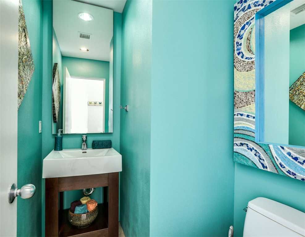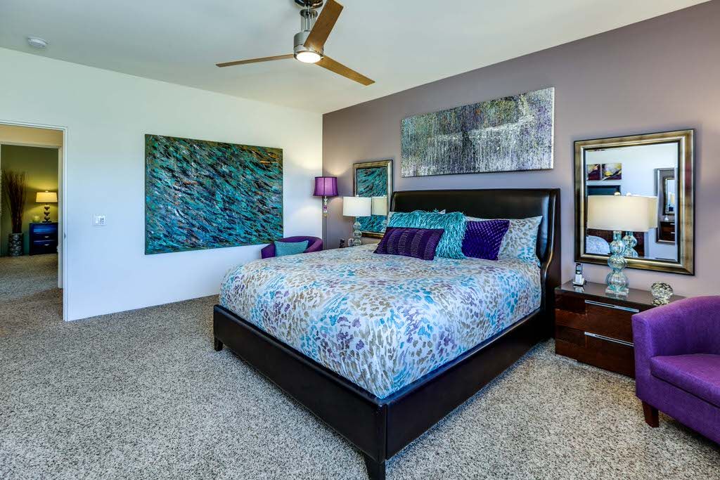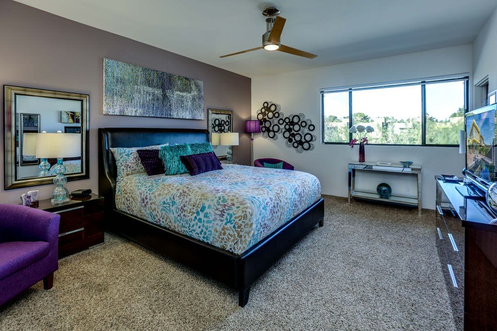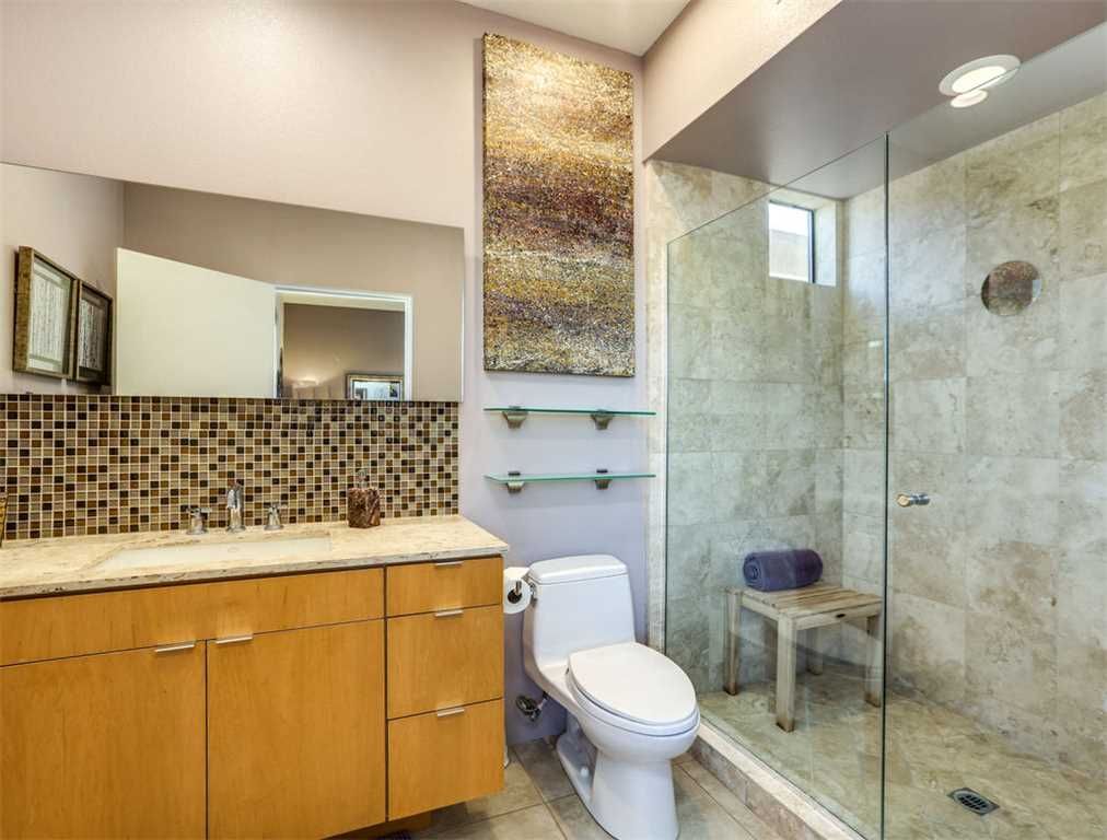 The master suite showcases a huge California king-size bed, which is a great place to enjoy the 48" smart TV, before starting your day or as you unwind in the evenings. The attached bath displays a beautiful seamless glass shower with travertine surround and clerestory windows to allow the natural light to stream in. The fixtures are modern and well-coordinated to match.