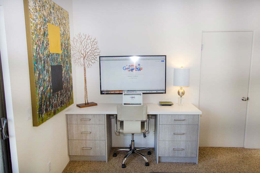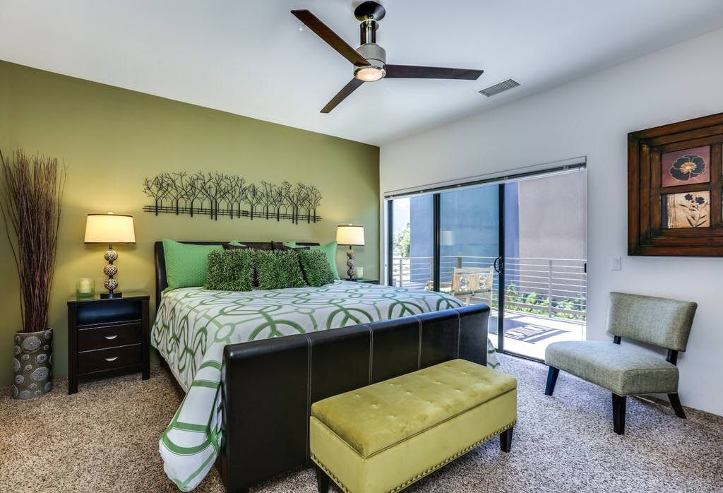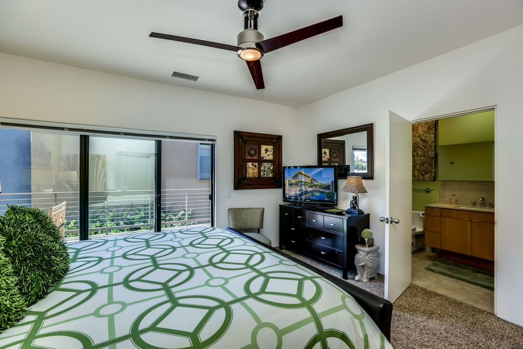 The second master bedroom suite boasts a plush California king-sized bed which invites you to curl up and enjoy the 48" smart TV over a large, built-in desk which can also be used as an external monitor for your PC or Mac. This space also features its own attached bath with glass shower, modern fixtures, and travertine tile accents throughout. A balcony is accessible from this guest bedroom as well, with a lovely seating area with panoramic views to enjoy your morning coffee and newspaper.