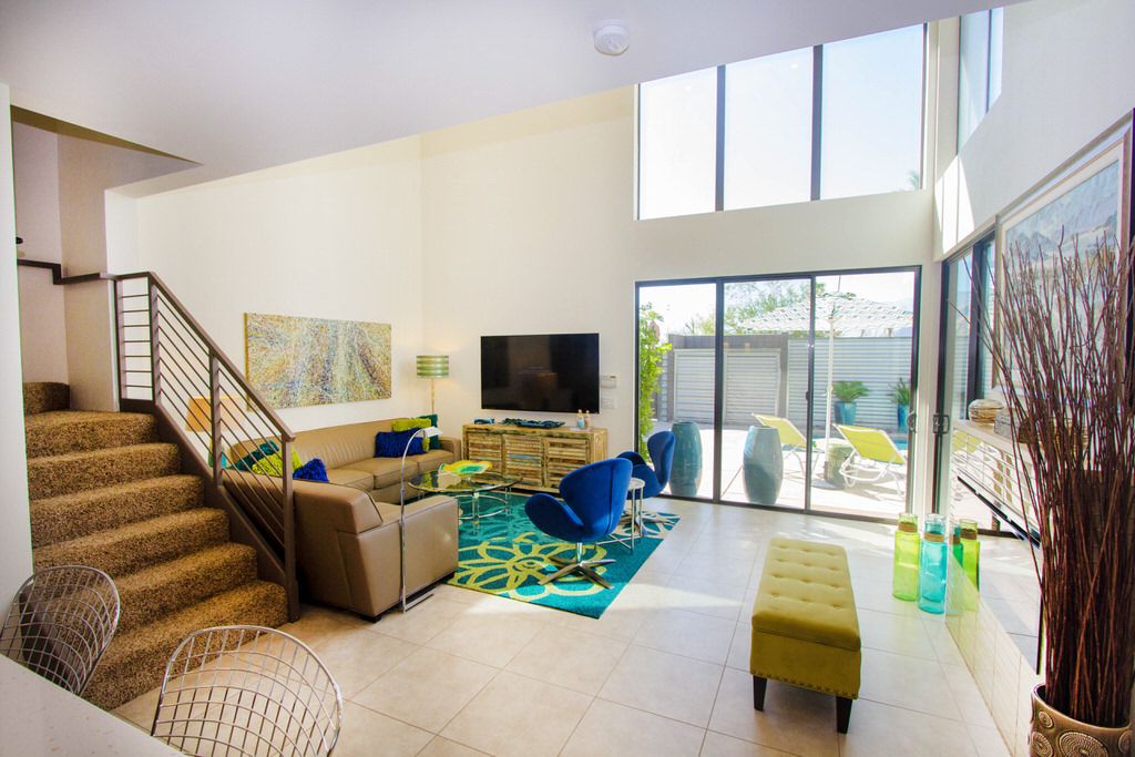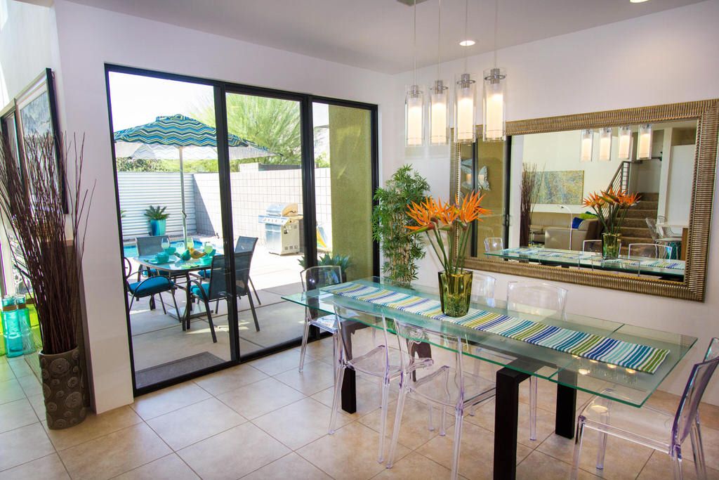 The interior of this Palm Springs vacation villa conveys a bright and open atmosphere with contemporary modern furnishings and plenty of large windows and sliding glass doors for maximum sunlight. The open floor plan keeps the well-appointed space feeling warm and spacious.