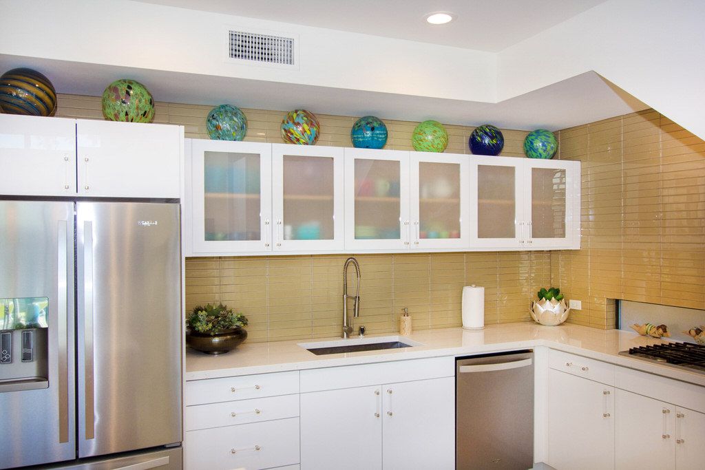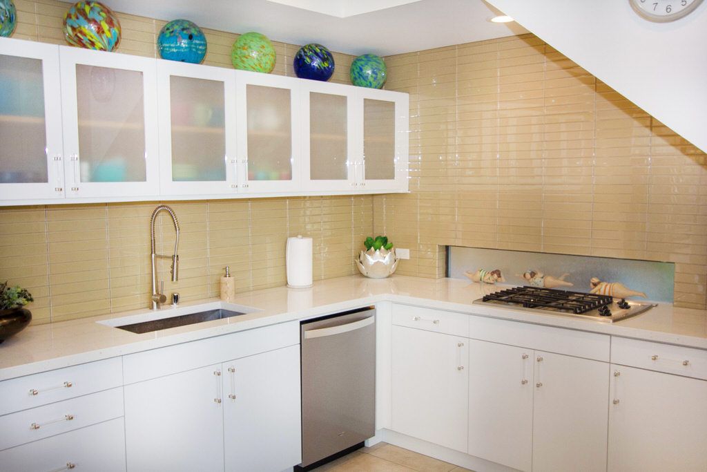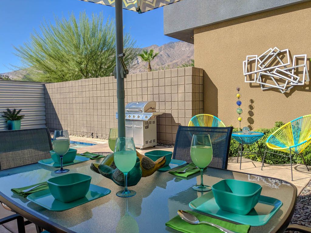 The newly remodeled kitchen in this remarkable Palm Springs vacation home is updated immaculately with new appliances, and is equipped with everything you'll need to prepare a gourmet meal for family and friends. There's ample cookware, bakeware, utensils, and small appliances to make meal preparation a snap. The island area allows extra room for you to recruit some helpers with dinner duty. There's even plasticware for poolside drinks and dining (no glass allowed). The adjacent dining area seats up to 6 comfortably.