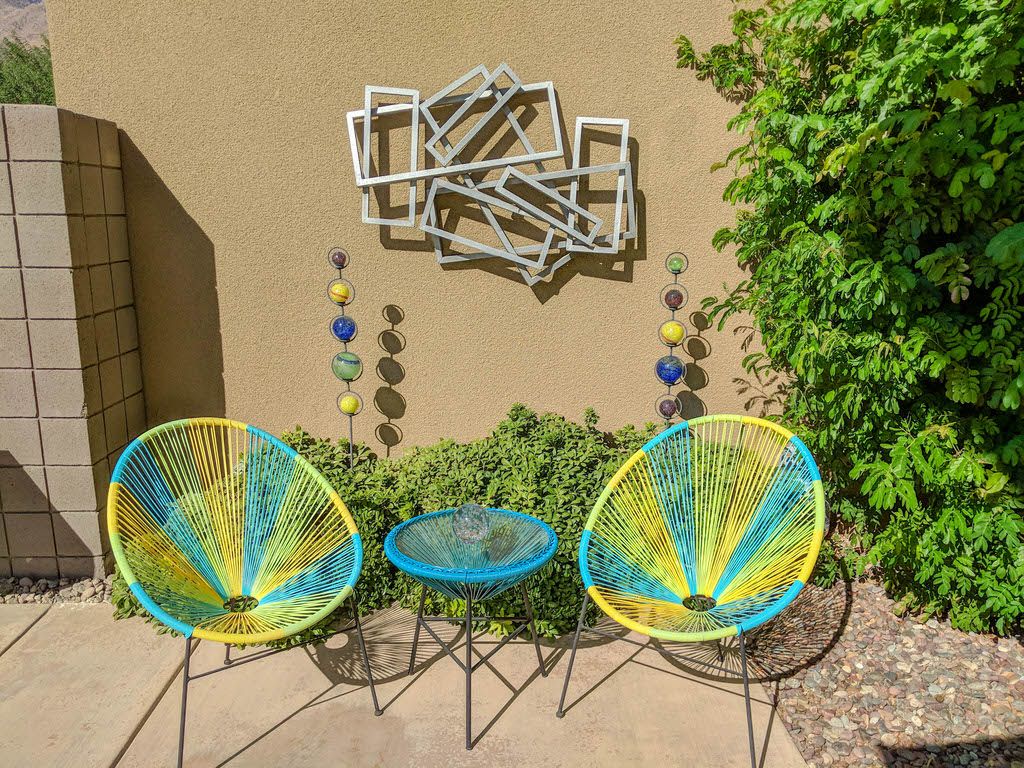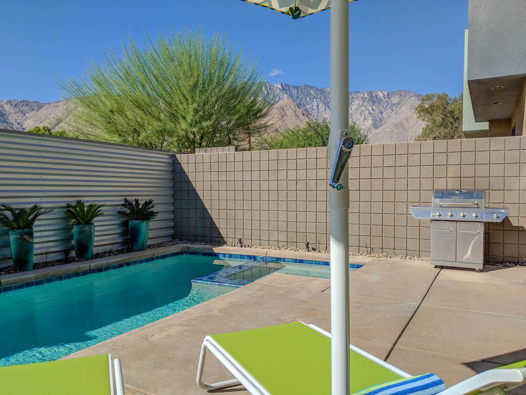 The backyard area at this private Palm Springs home is well suited to enjoying the outdoors with a delightful private splash pool and spa. The complex's architecture block sightlines from neighboring homes, offering a quiet oasis for stargazing in the Jacuzzi or soaking up the abundant Palm Springs sunshine.